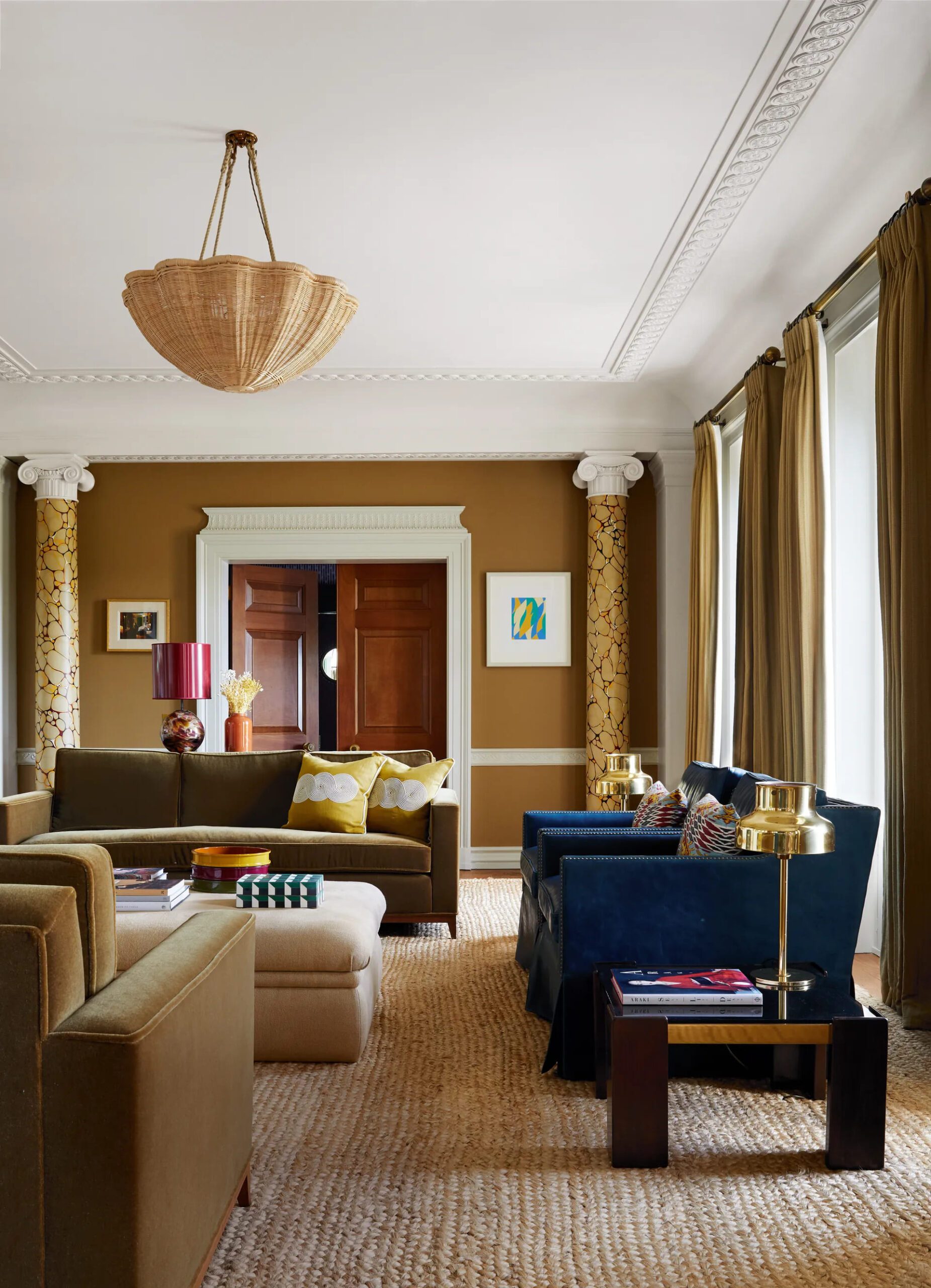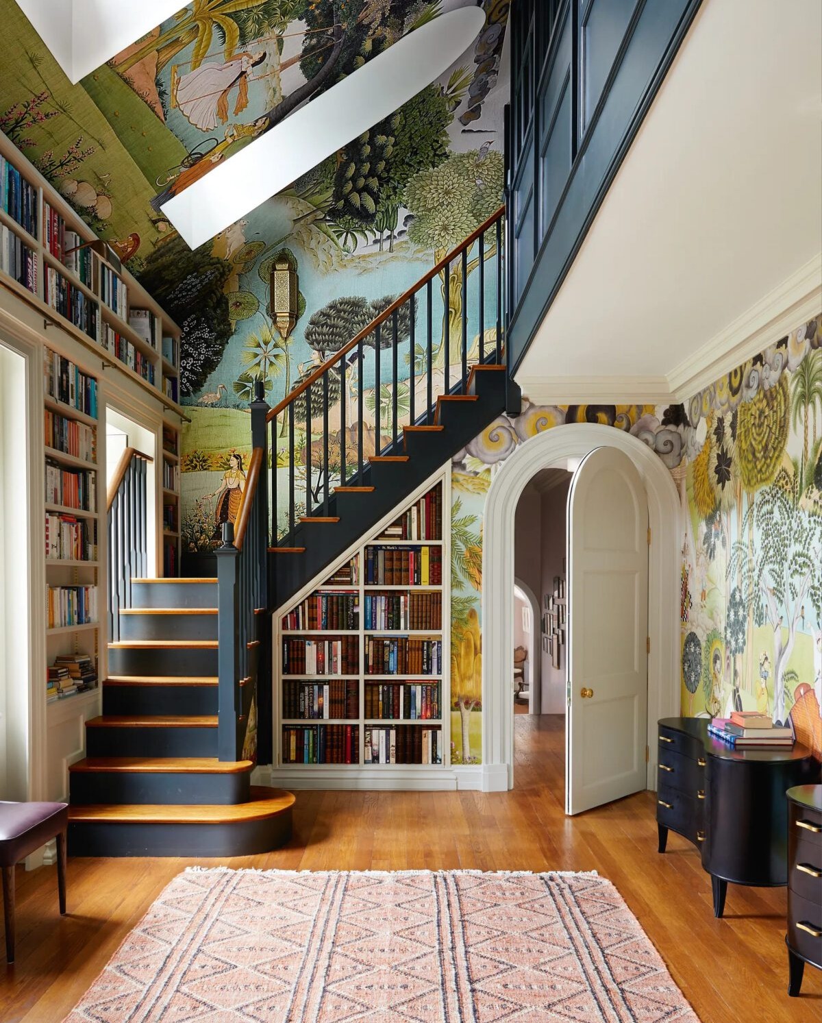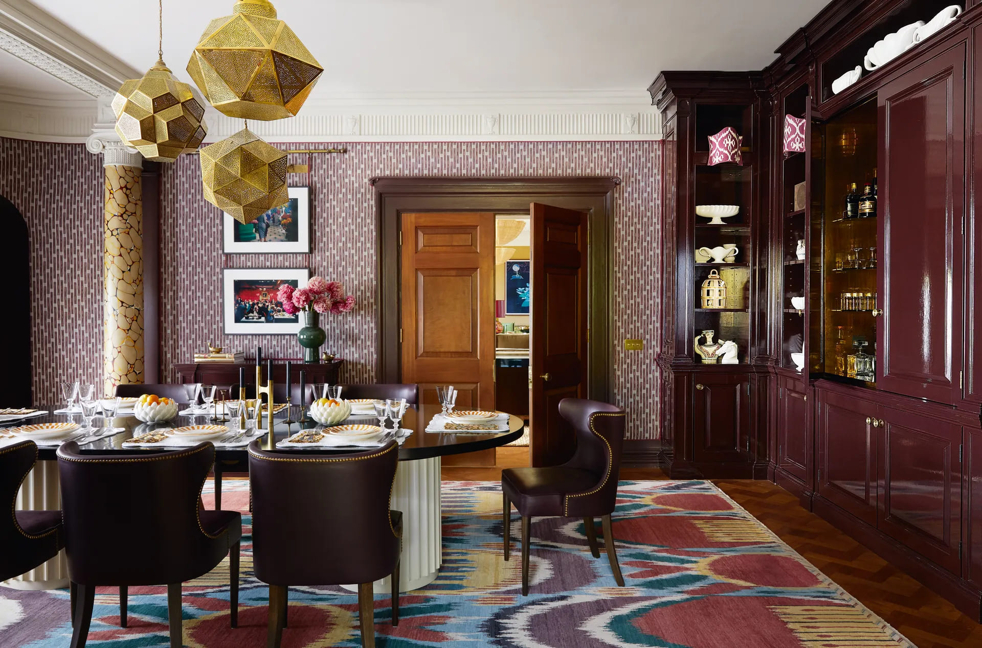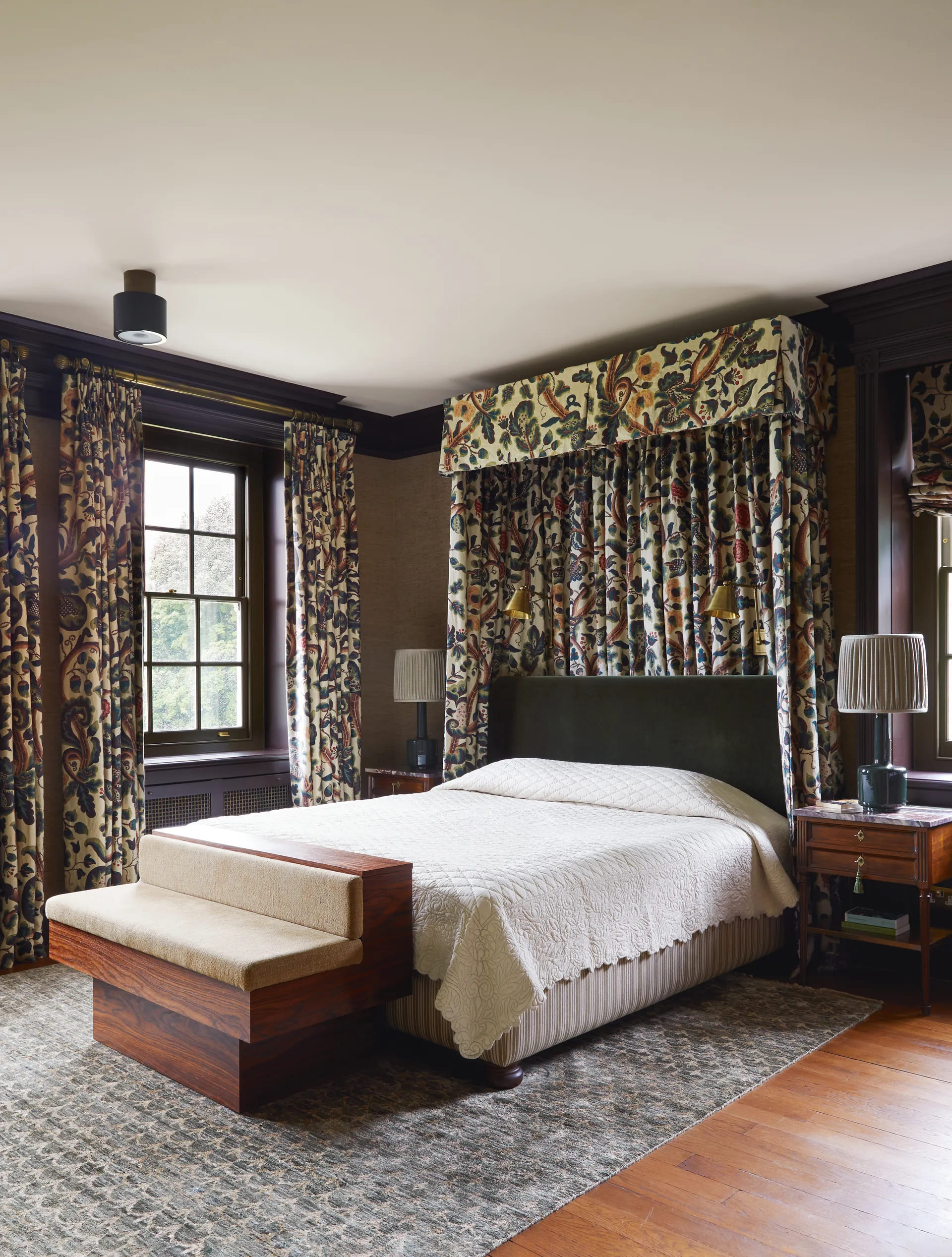Salon jest jasny i przestronny, z ciepłymi ścianami, oryginalnym kominkiem i meblami, w tym lakierowanym kredensem z lat 70. Przytulna jadalnia z tkaniną „Inca Vertical Stripe” i mosiężnym barem dodaje przestrzeni wyjątkowego stylu. Na piętrze stworzono główną sypialnię z dwiema łazienkami i garderobami oraz bibliotekę z galerią, pokrytą egzotycznymi wzorami „D Rajput Fantasy” od Iksel Decorator Arts.
