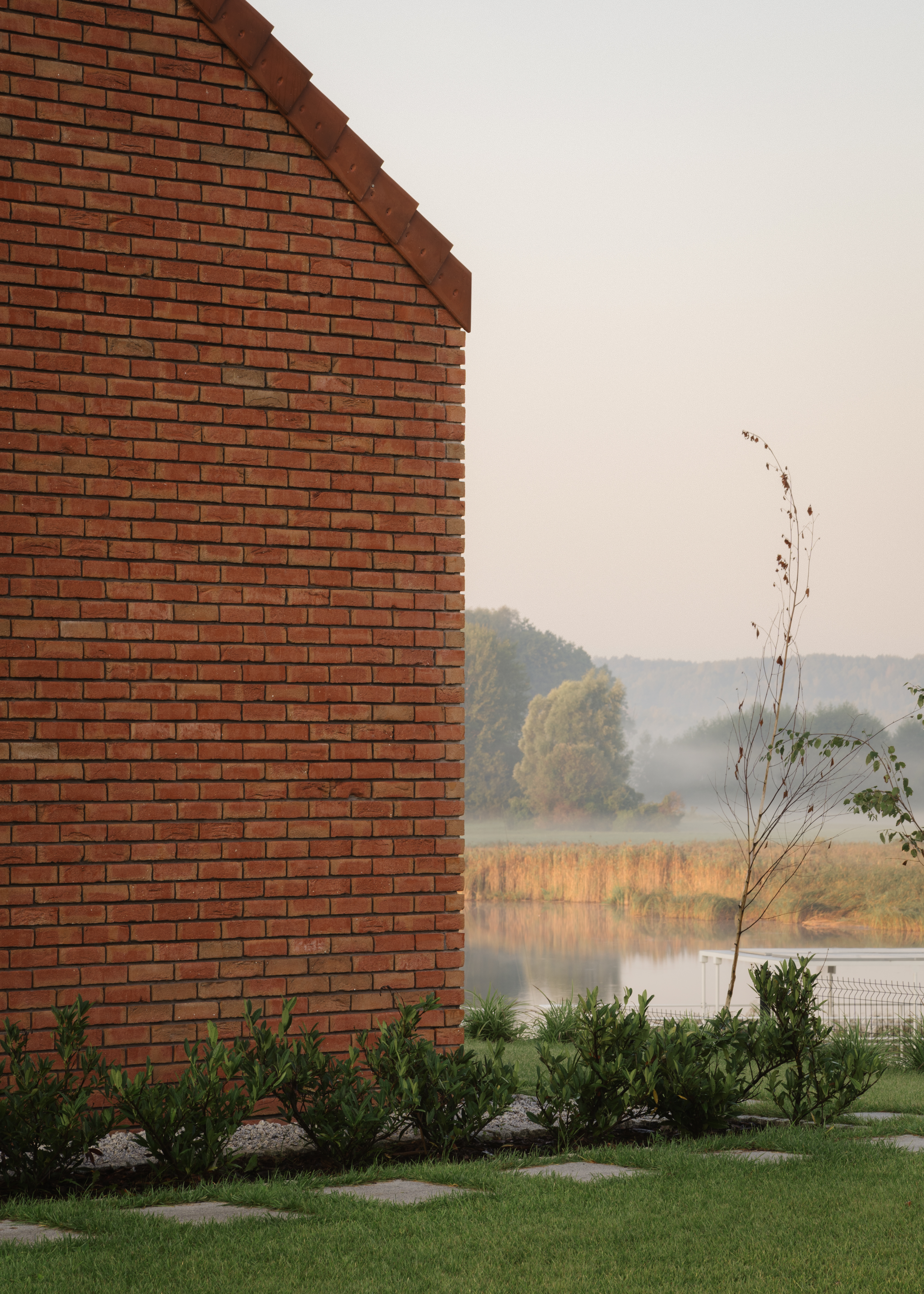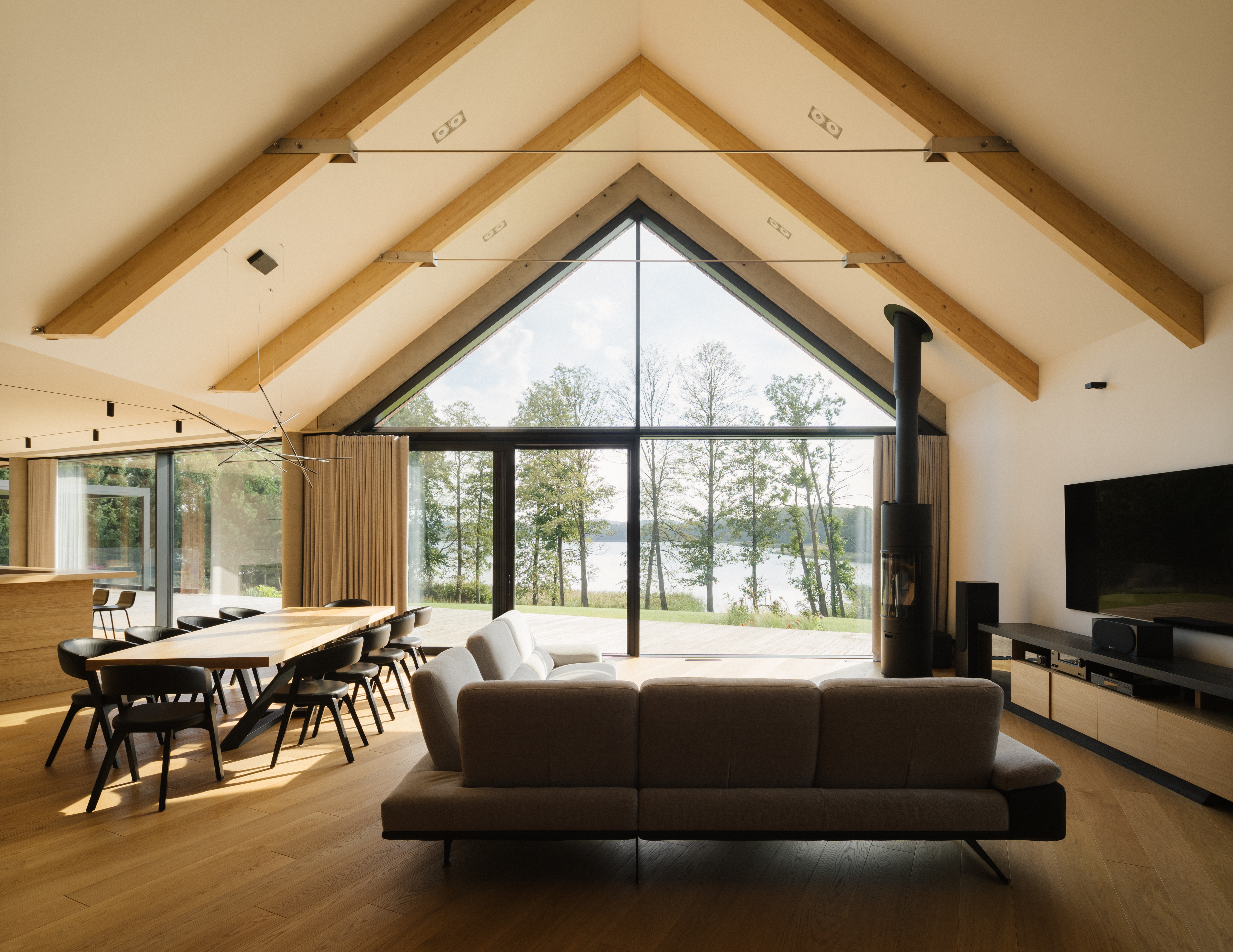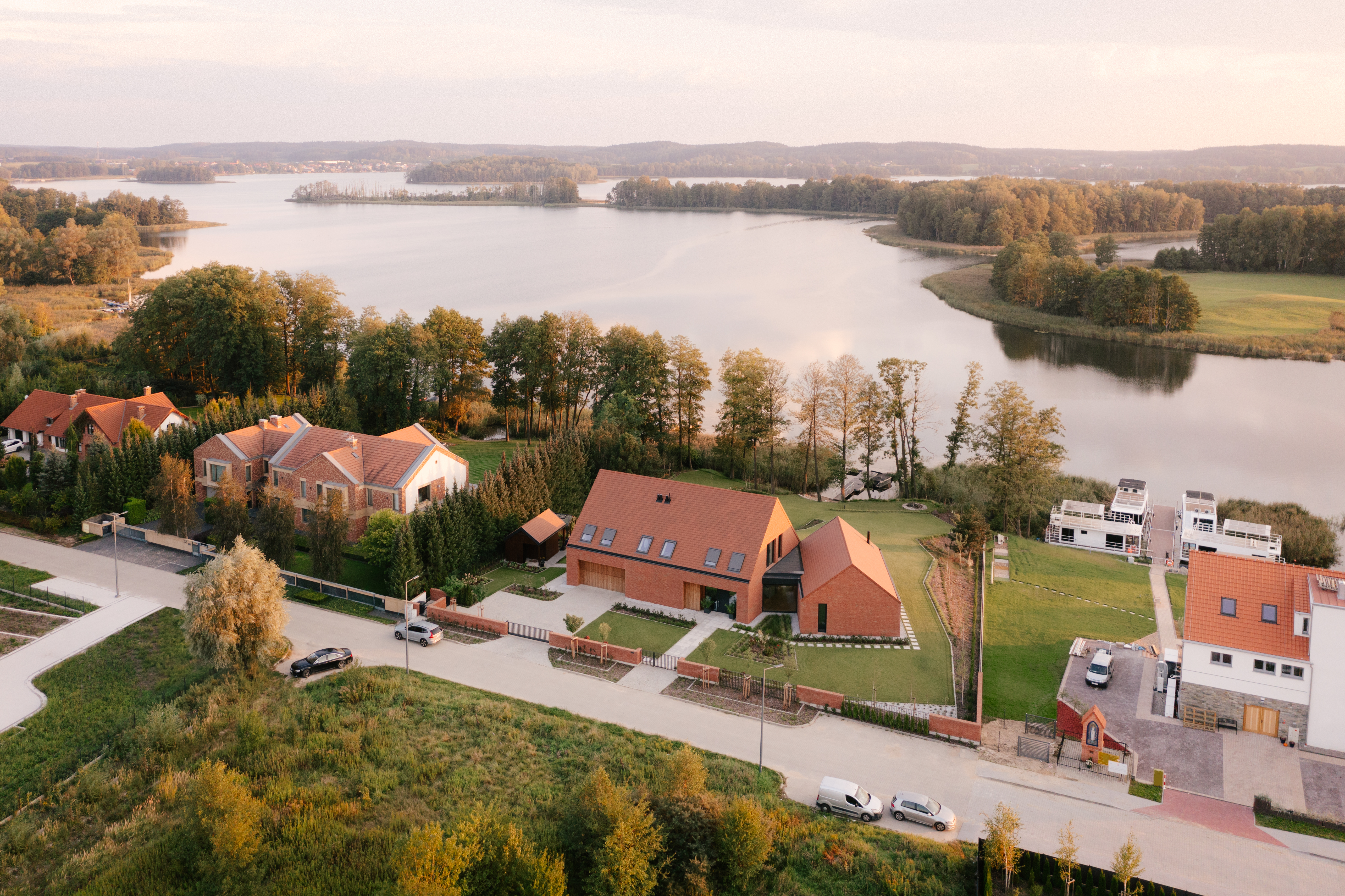 Dom składa się z dwóch wyraźnie zarysowanych części. Dwukondygnacyjna bryła usytuowana wzdłuż pierzei ulicy nawiązuje swoją skalą do istniejącej zabudowy sąsiedniej i wpisuje się w wiejski kontekst miejsca. Układ budynku z kalenicą usytuowaną równolegle do osi jezdni nie pozwalał maksymalnie wykorzystać potencjału działki dlatego część zawierająca strefę dzienną została obrócona. Jej nieortogonalne usytuowanie pozwoliło odsłonić niesamowity widok wzdłuż przekątnej jeziora zapraszając otaczający krajobraz do wnętrza domu.