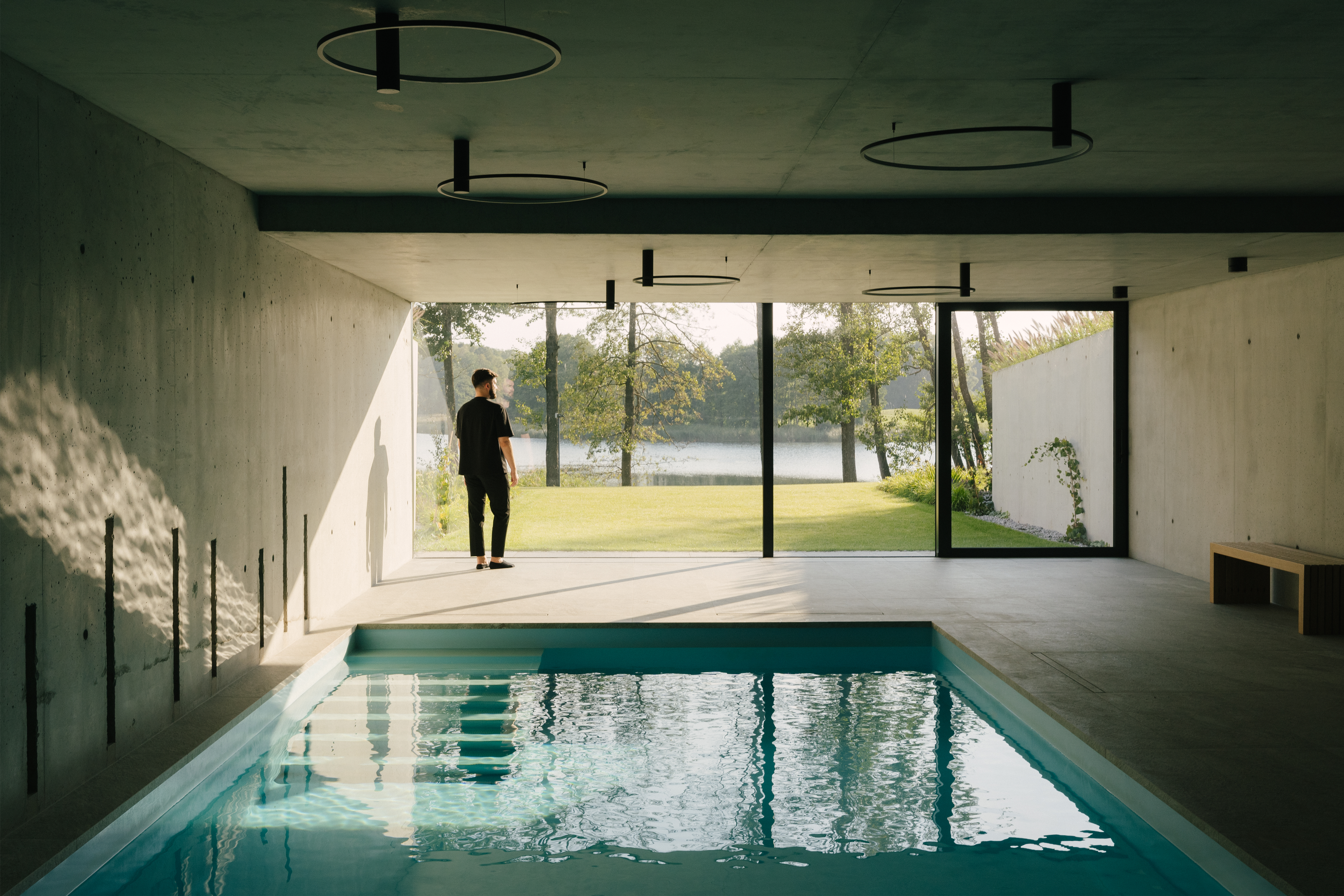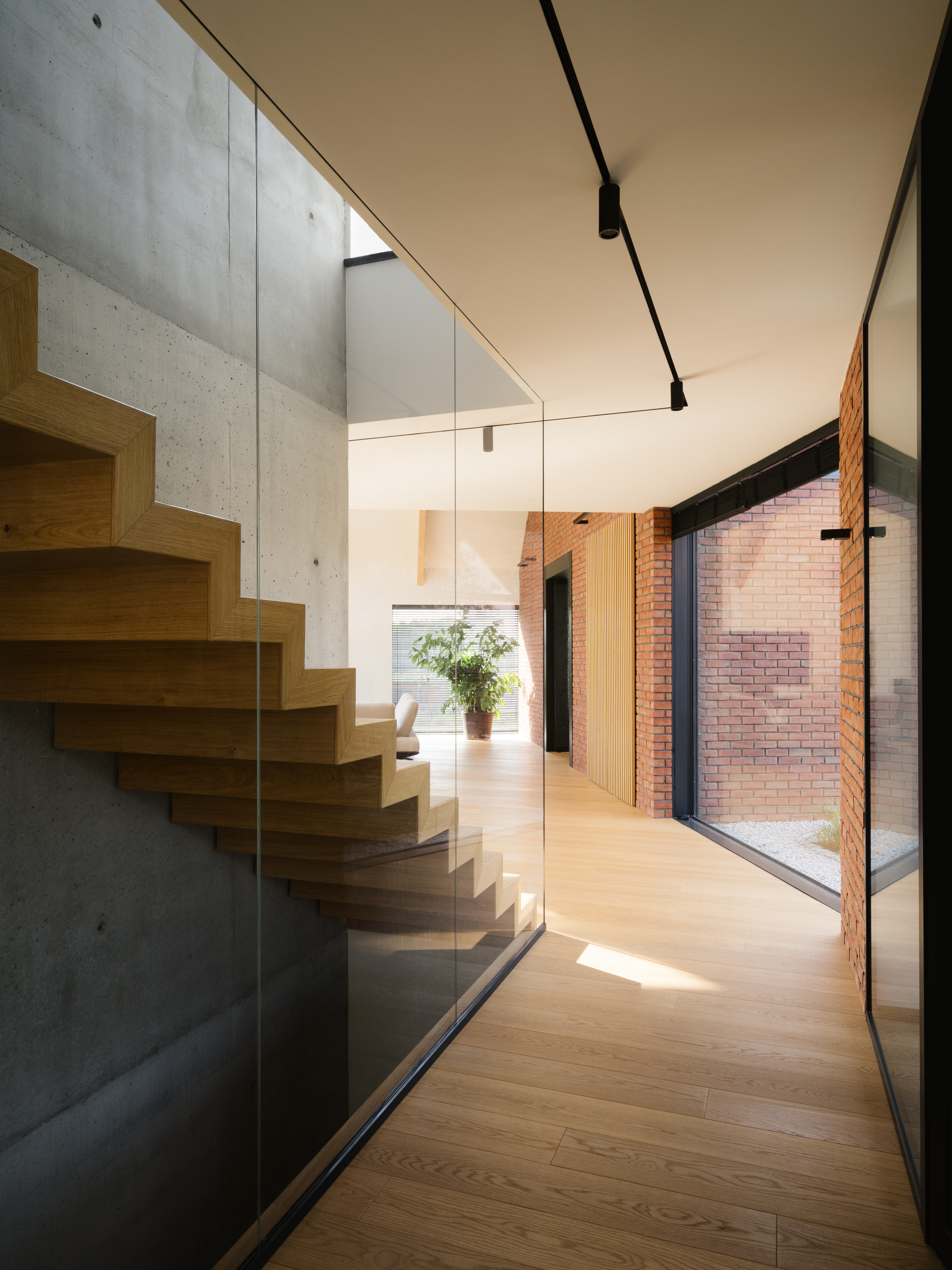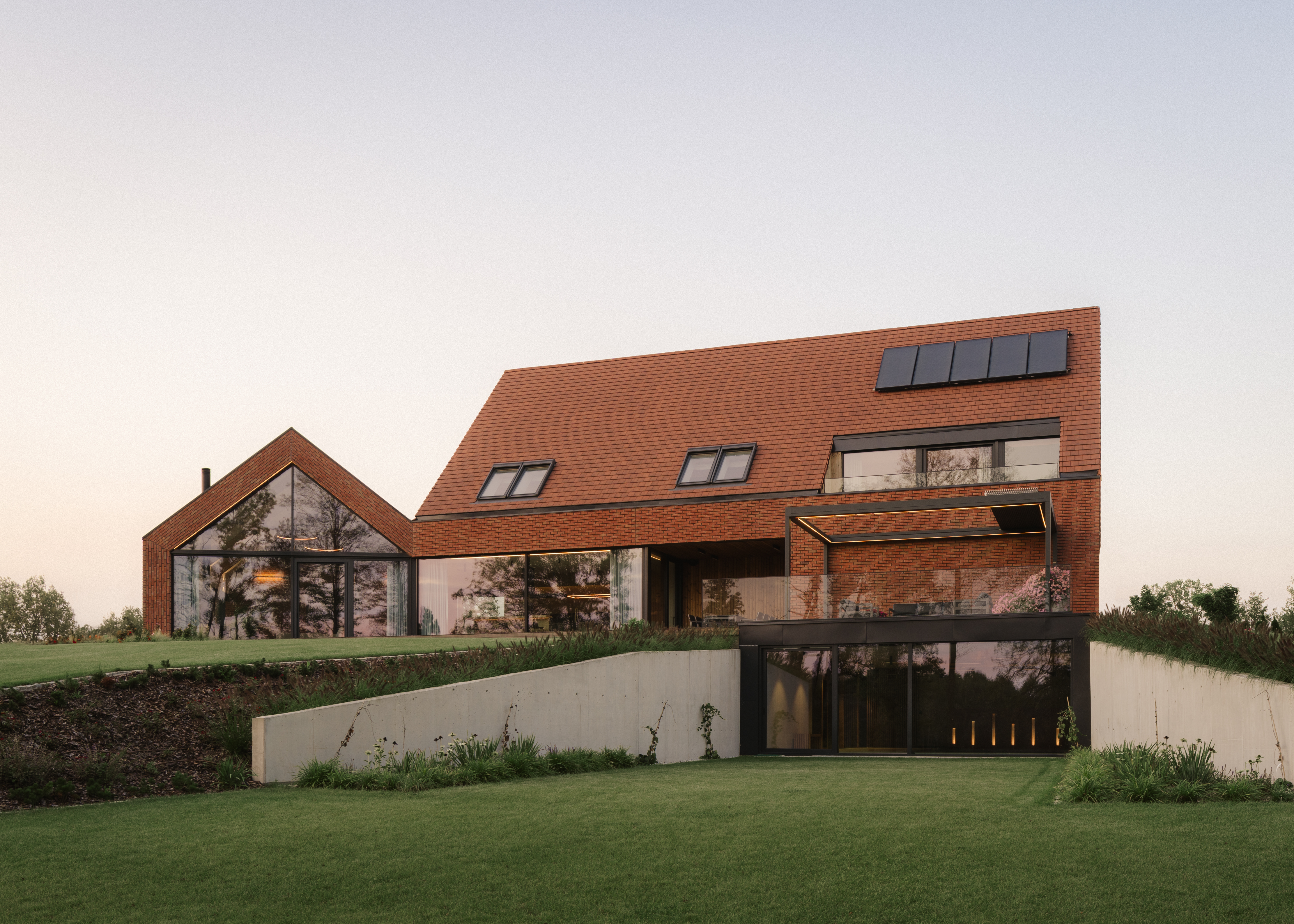 Dom składa się z dwóch wyraźnie zarysowanych części. Dwukondygnacyjna bryła usytuowana wzdłuż pierzei ulicy nawiązuje swoją skalą do istniejącej zabudowy sąsiedniej i wpisuje się w wiejski kontekst miejsca. Układ budynku z kalenicą usytuowaną równolegle do osi jezdni nie pozwalał maksymalnie wykorzystać potencjału działki dlatego część zawierająca strefę dzienną została obrócona. Jej nieortogonalne usytuowanie pozwoliło odsłonić niesamowity widok wzdłuż przekątnej jeziora zapraszając otaczający krajobraz do wnętrza domu.