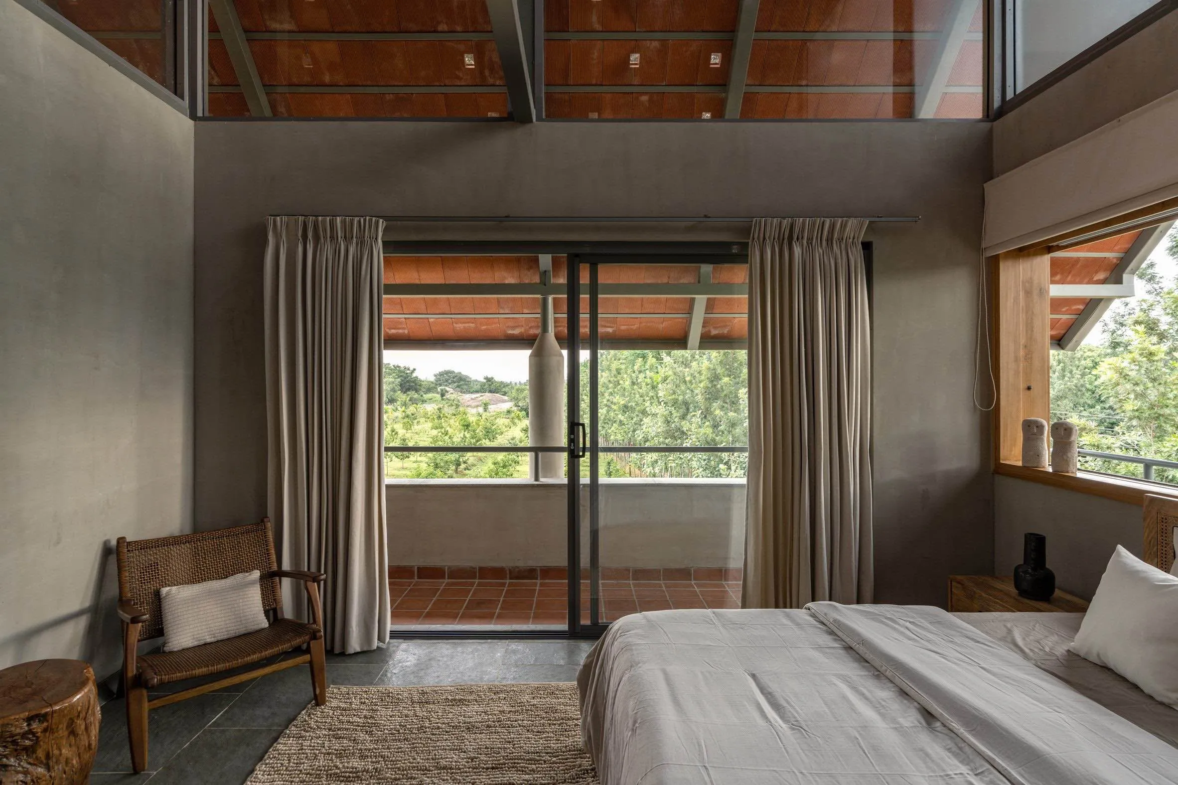 Na piętrze zaprojektowano tarasy wykończone terakotą, które sprzyjają spokojnej obserwacji krajobrazu. Na poziomie parteru łazienki otwierają się na niewielkie, zakrzywione ogrody, tworząc półotwarte przestrzenie kąpielowe. Kontakt z deszczem, wiatrem i naturalnym światłem staje się tu częścią codziennych rytuałów.