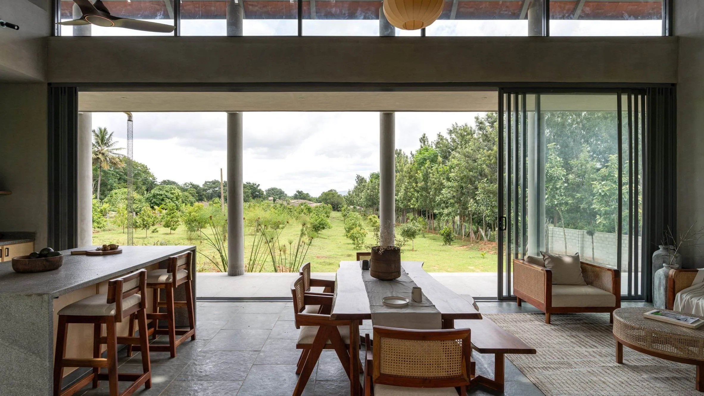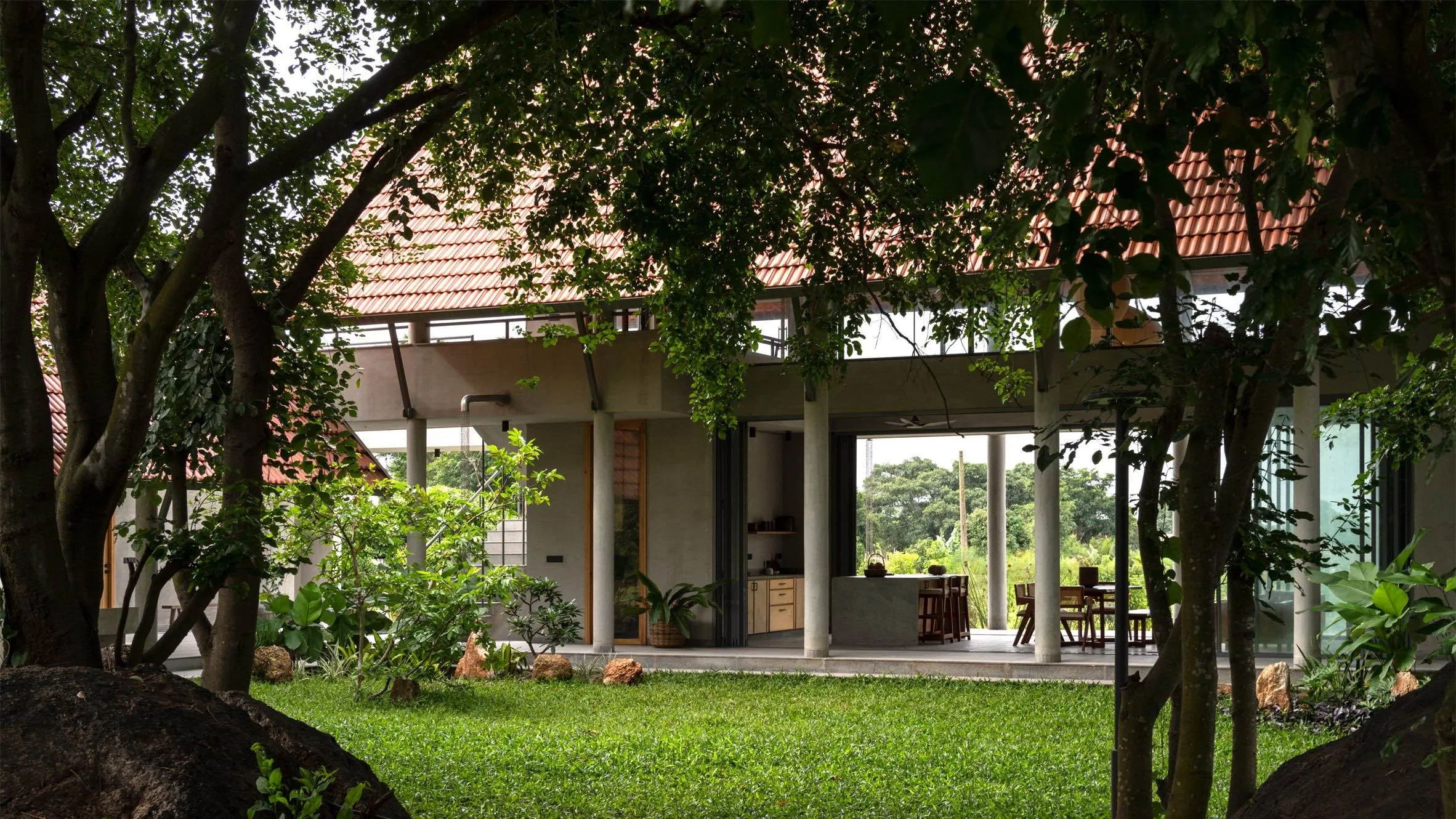 House by the Grove to dom weekendowy położony na obrzeżach Bengaluru, w pobliżu miejscowości Magadi, wśród zagajnika drzew i masywnych głazów skalnych. Projekt autorstwa indyjskiej pracowni Taliesyn powstał jako przestrzeń wyciszenia i refleksji, zaprojektowana dla trzyosobowej rodziny poszukującej oddechu od intensywnej urbanizacji miasta. Naturalne otoczenie stało się tu punktem wyjścia do ukształtowania architektury, która nie izoluje się od krajobrazu, lecz aktywnie z nim współpracuje.