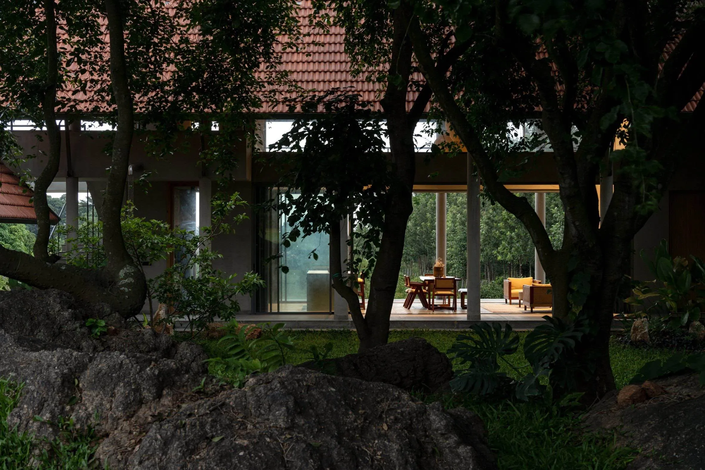 Dom został uformowany na planie litery L, oplatając istniejące drzewa i głazy, które pozostały integralnym elementem kompozycji. Taki układ pozwala budynkowi rozciągać się w stronę zieleni, a jednocześnie tworzyć osłonięte, półprywatne przestrzenie zewnętrzne. Architektura reaguje na teren, umożliwiając wnętrzom naturalne przenikanie się z otoczeniem.
