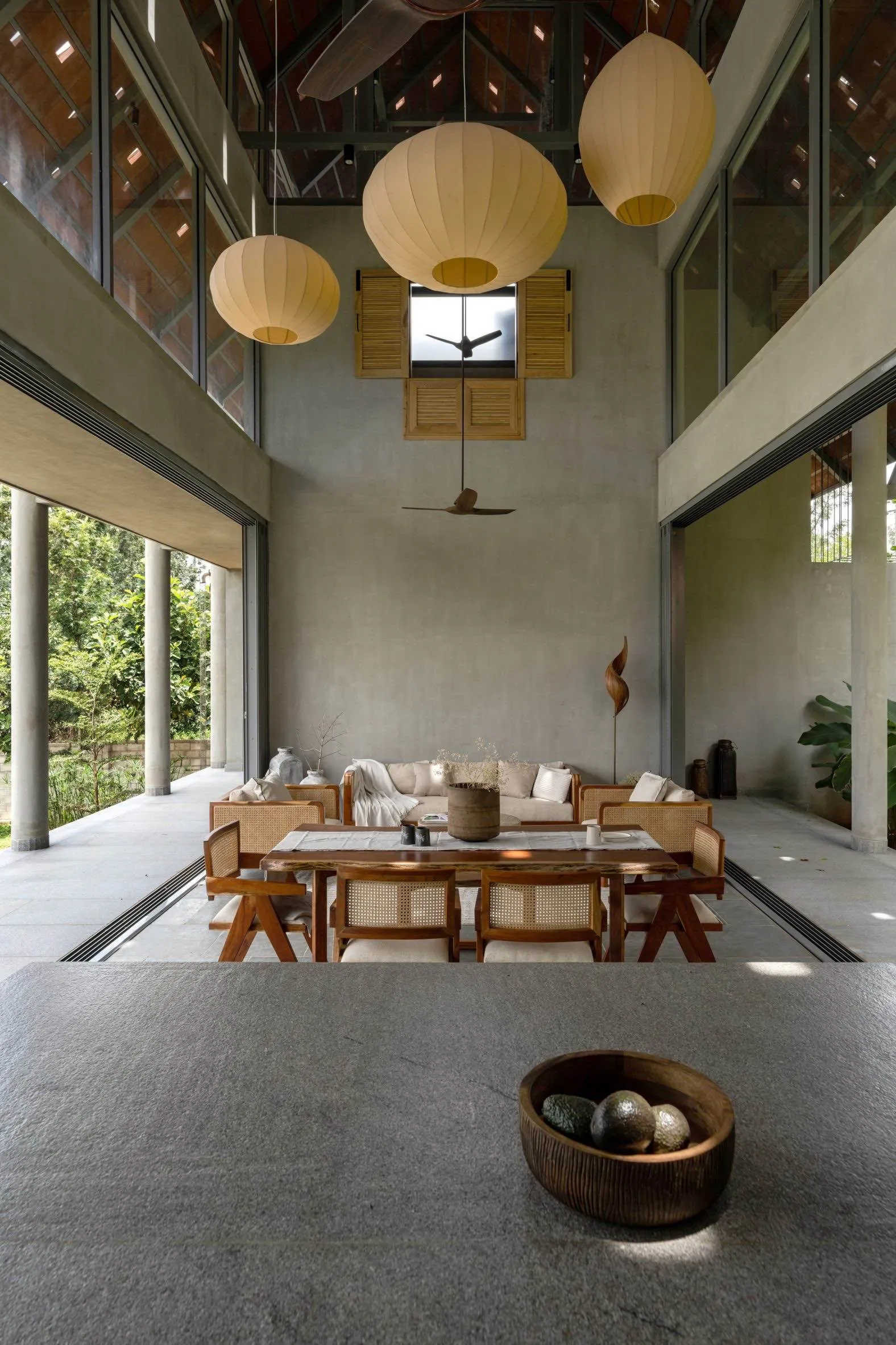 Charakterystycznym elementem projektu są betonowe kolumny, które podtrzymują stromo nachylone dachy i porządkują strefy dzienne. Kolumnady wyznaczają rytm przestrzeni, a zmieniające się w ciągu dnia światło i cień budują dynamiczną, ale spokojną atmosferę wnętrz. To właśnie ten powtarzalny porządek nadaje domowi poczucie harmonii i ciągłości.