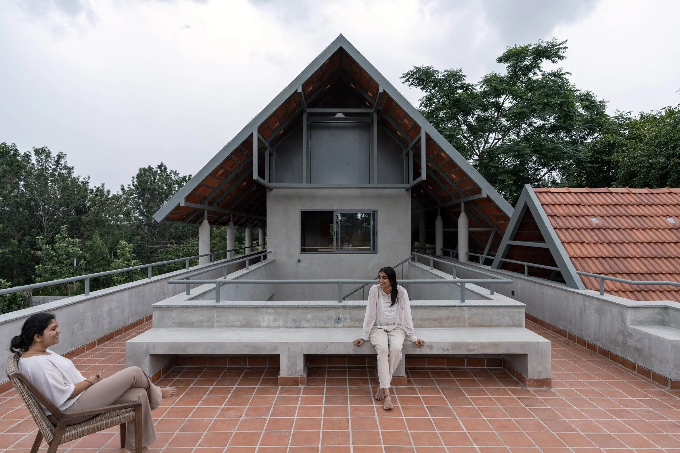 Każdą z głównych brył przykrywają strome dachy wsparte na betonowych kolumnach i czarnych ramach stalowych. Pokryto je tradycyjnymi dachówkami Mangalore, nawiązującymi do dziedzictwa kulturowego inwestorów. W dachach umieszczono także pojedyncze, niestandardowe dachówki szklane, które wprowadzają do wnętrz ruchome plamy światła, zmieniające się wraz z pozycją słońca.