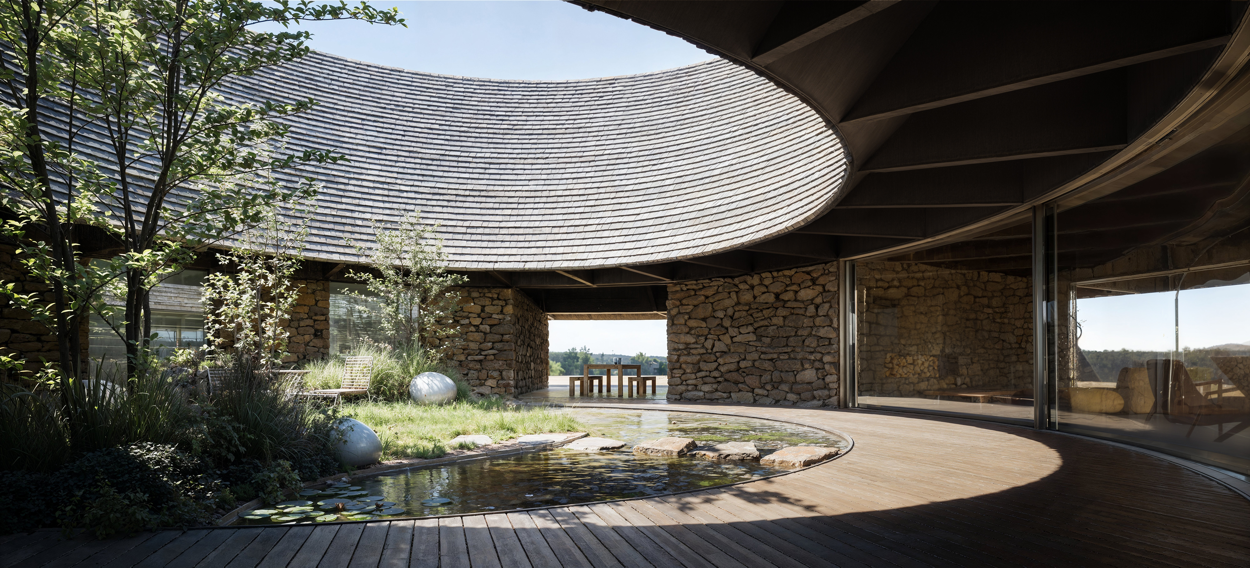 Głównym założeniem projektu jest unikalny układ oparty na planie pierścienia, który tworzy wewnętrzne atrium – zielone serce domu. To przestrzenie spokoju i relaksu, wzbogacone małym akwenem, które sprzyjają tworzeniu prywatnego mikroklimatu. Dzięki takiemu rozwiązaniu, przyroda staje się integralną częścią codziennego życia mieszkańców.