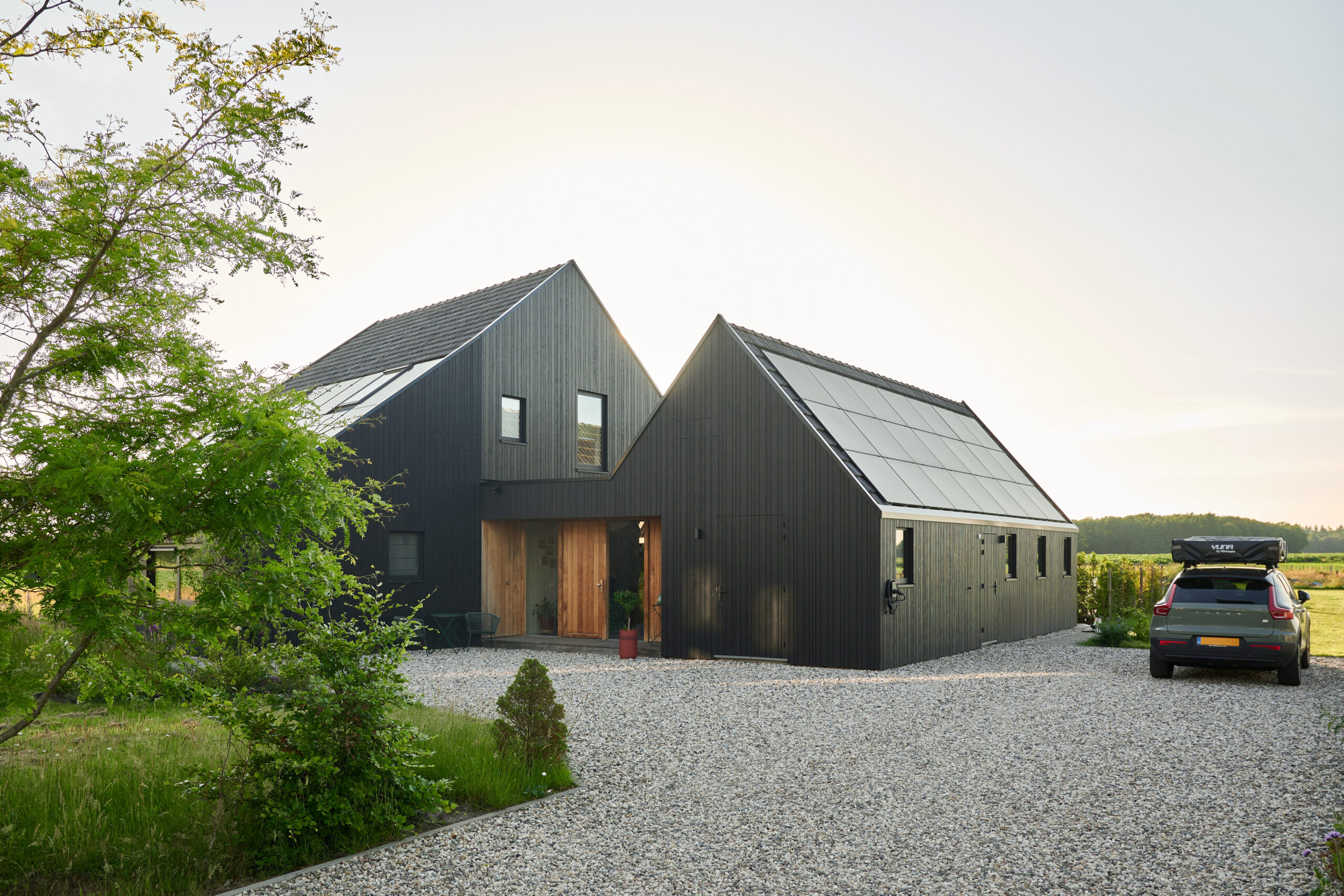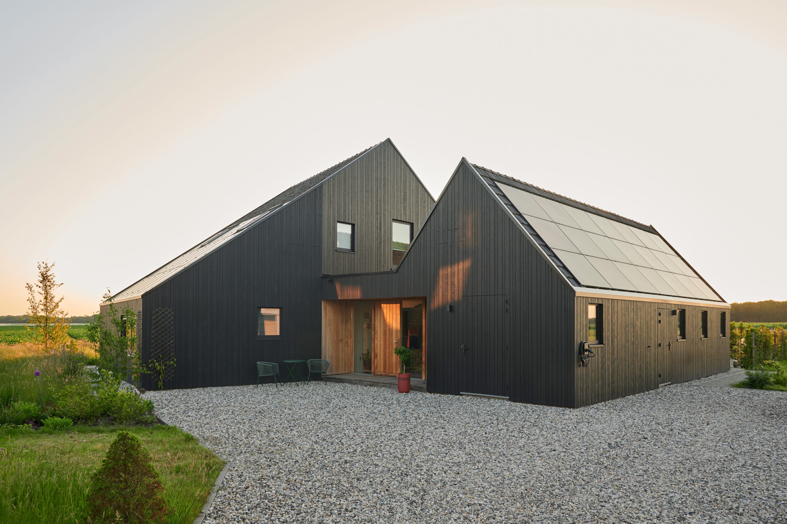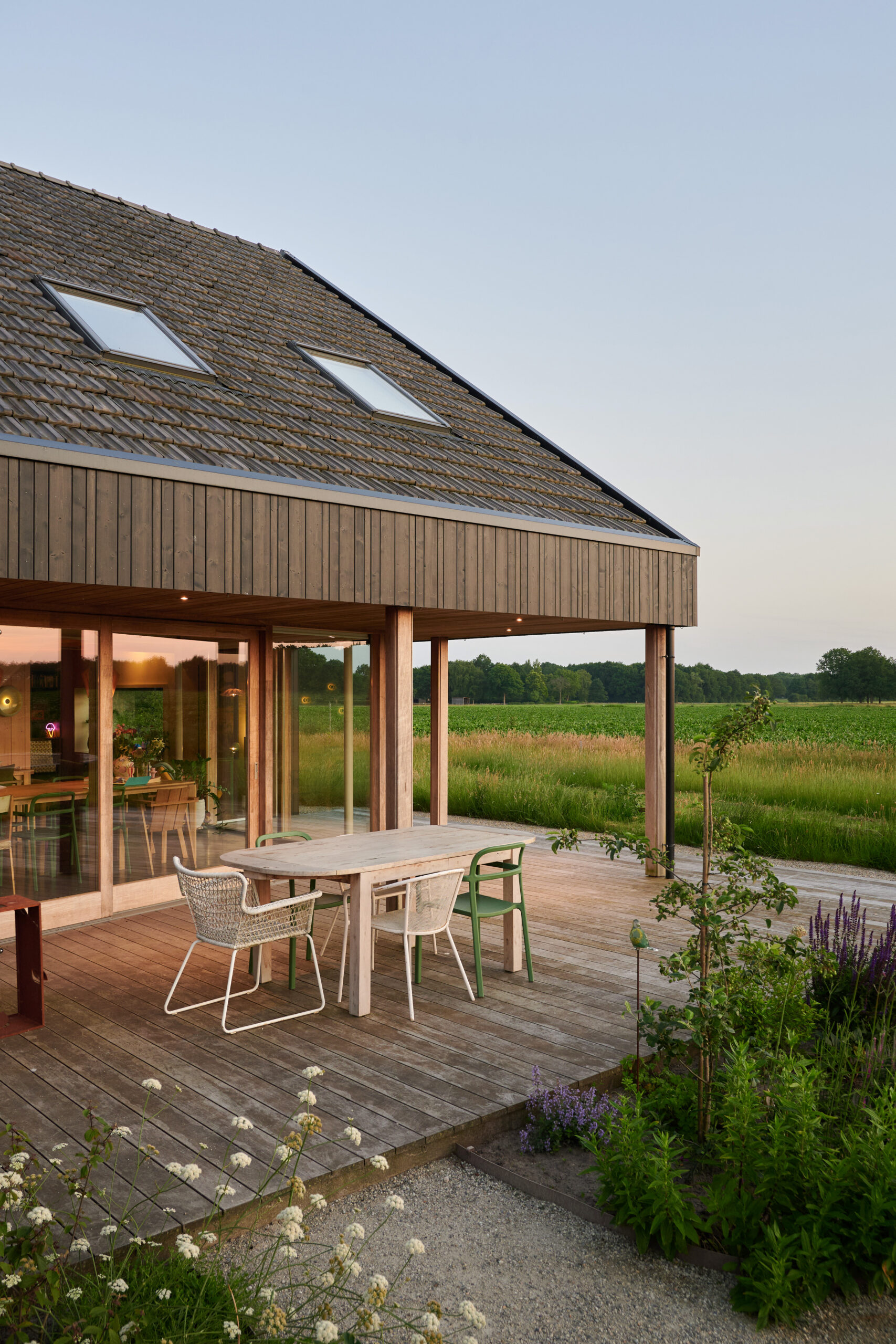 Forma budynku nawiązuje do archetypu stodoły – z wyraźnym dachem dwuspadowym i wydłużoną bryłą, typową dla tradycyjnej zabudowy wiejskiej Holandii. Jednak jej interpretacja przez Studio SKA to nowoczesna, minimalistyczna wersja wiejskiego domu, w której liczy się proporcja, detal i funkcja. Przestrzeń zewnętrzna została zaaranżowana z równym wyczuciem – tak, aby ogród i tarasy stanowiły naturalne przedłużenie wnętrz, umożliwiając pełne korzystanie z uroków lokalnego krajobrazu.