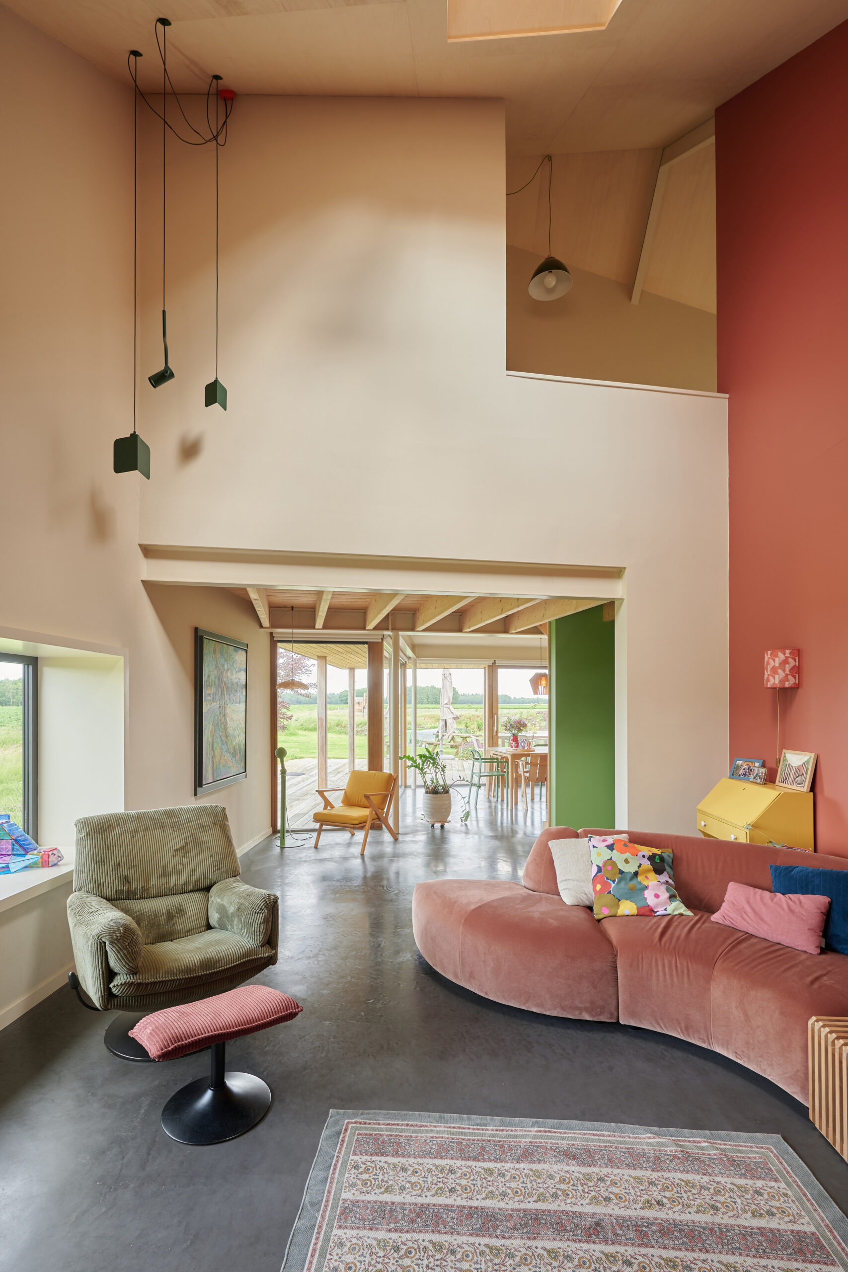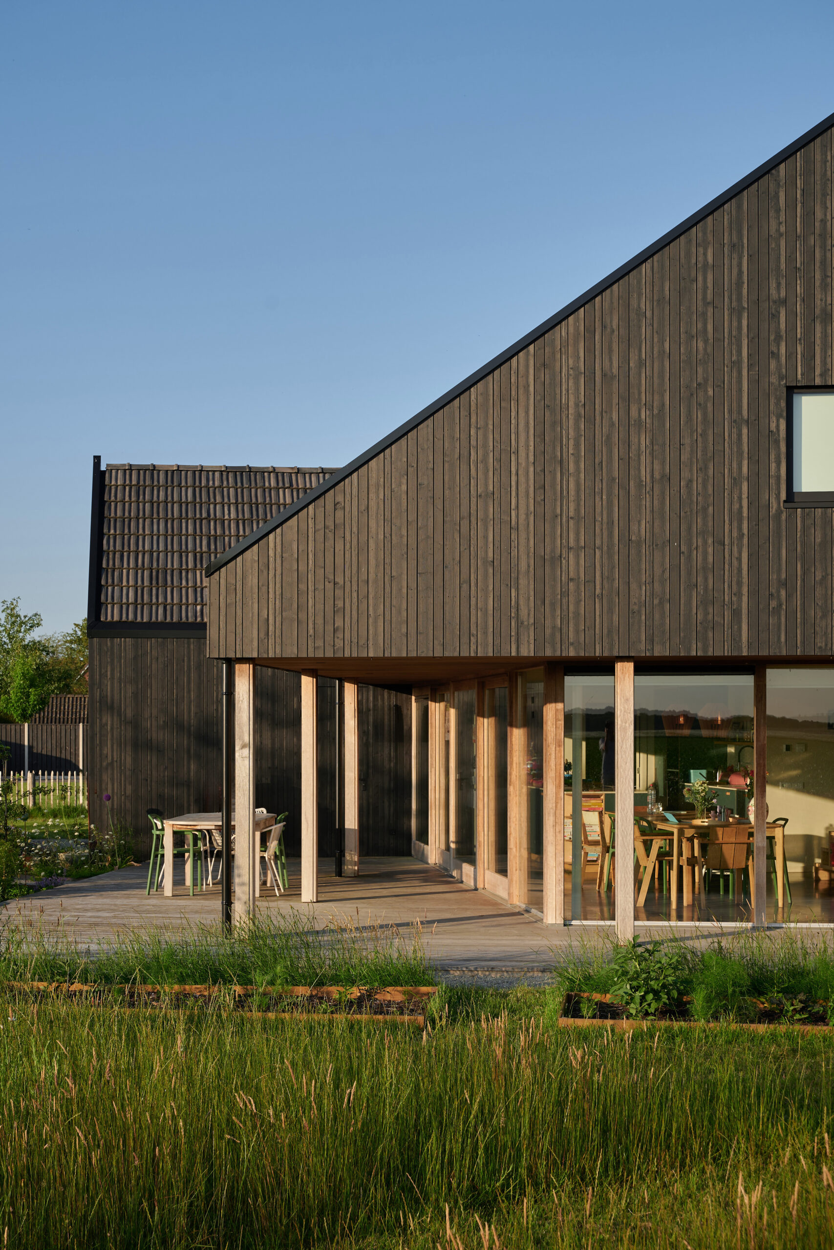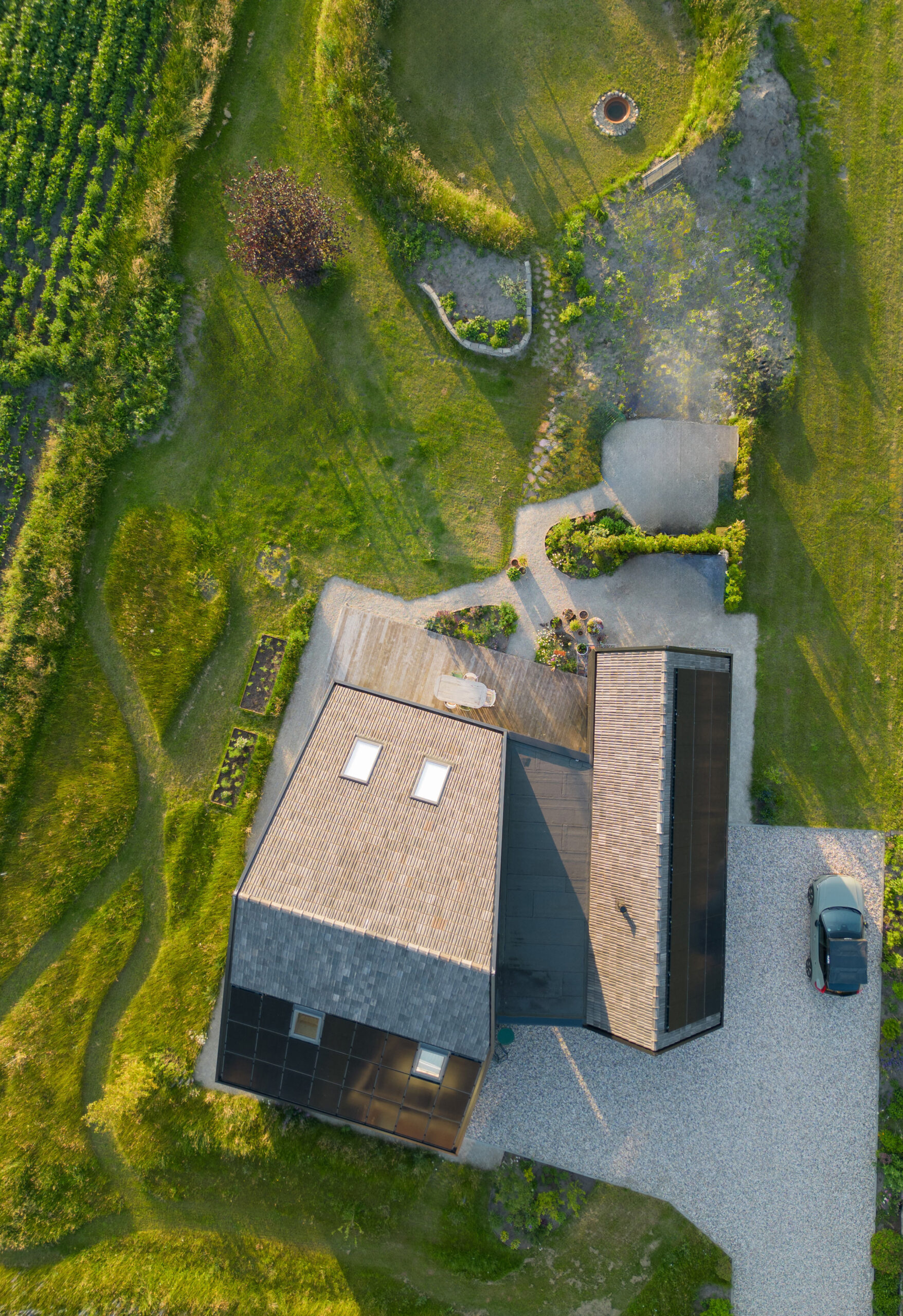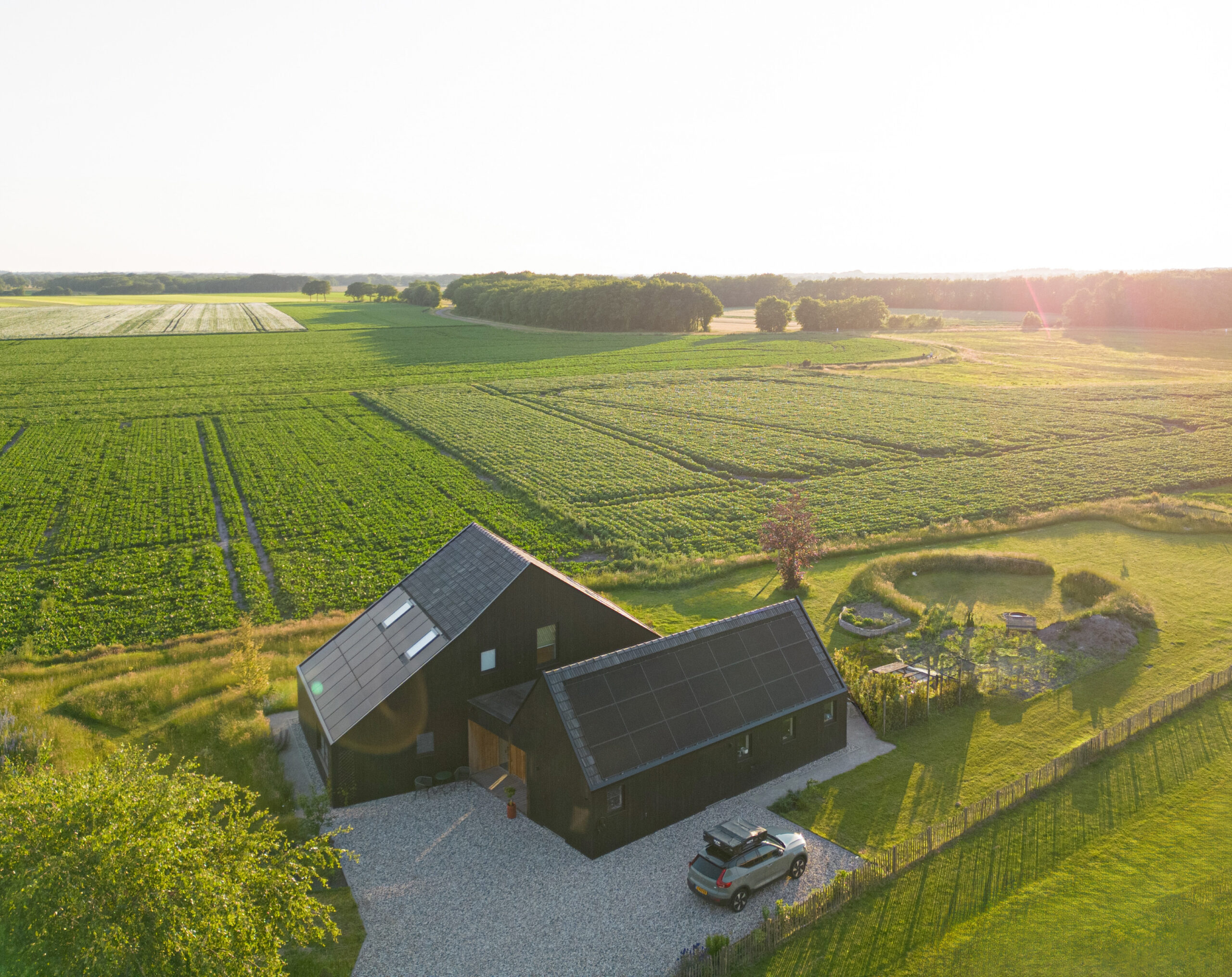 Forma budynku nawiązuje do archetypu stodoły – z wyraźnym dachem dwuspadowym i wydłużoną bryłą, typową dla tradycyjnej zabudowy wiejskiej Holandii. Jednak jej interpretacja przez Studio SKA to nowoczesna, minimalistyczna wersja wiejskiego domu, w której liczy się proporcja, detal i funkcja. Przestrzeń zewnętrzna została zaaranżowana z równym wyczuciem – tak, aby ogród i tarasy stanowiły naturalne przedłużenie wnętrz, umożliwiając pełne korzystanie z uroków lokalnego krajobrazu.