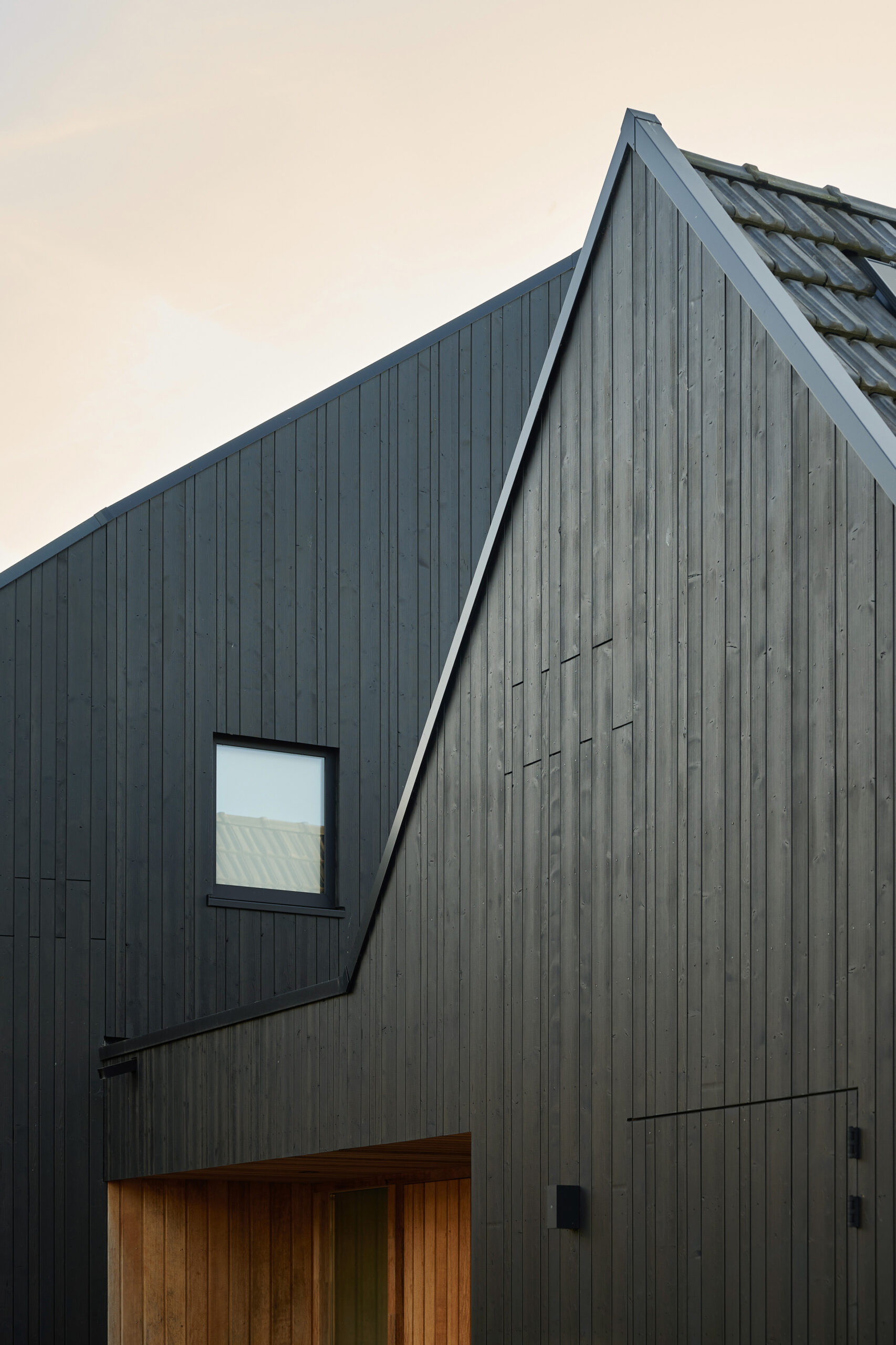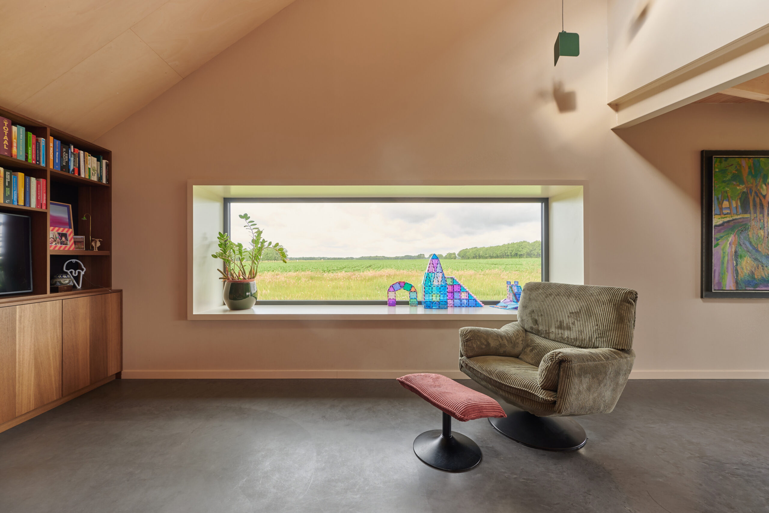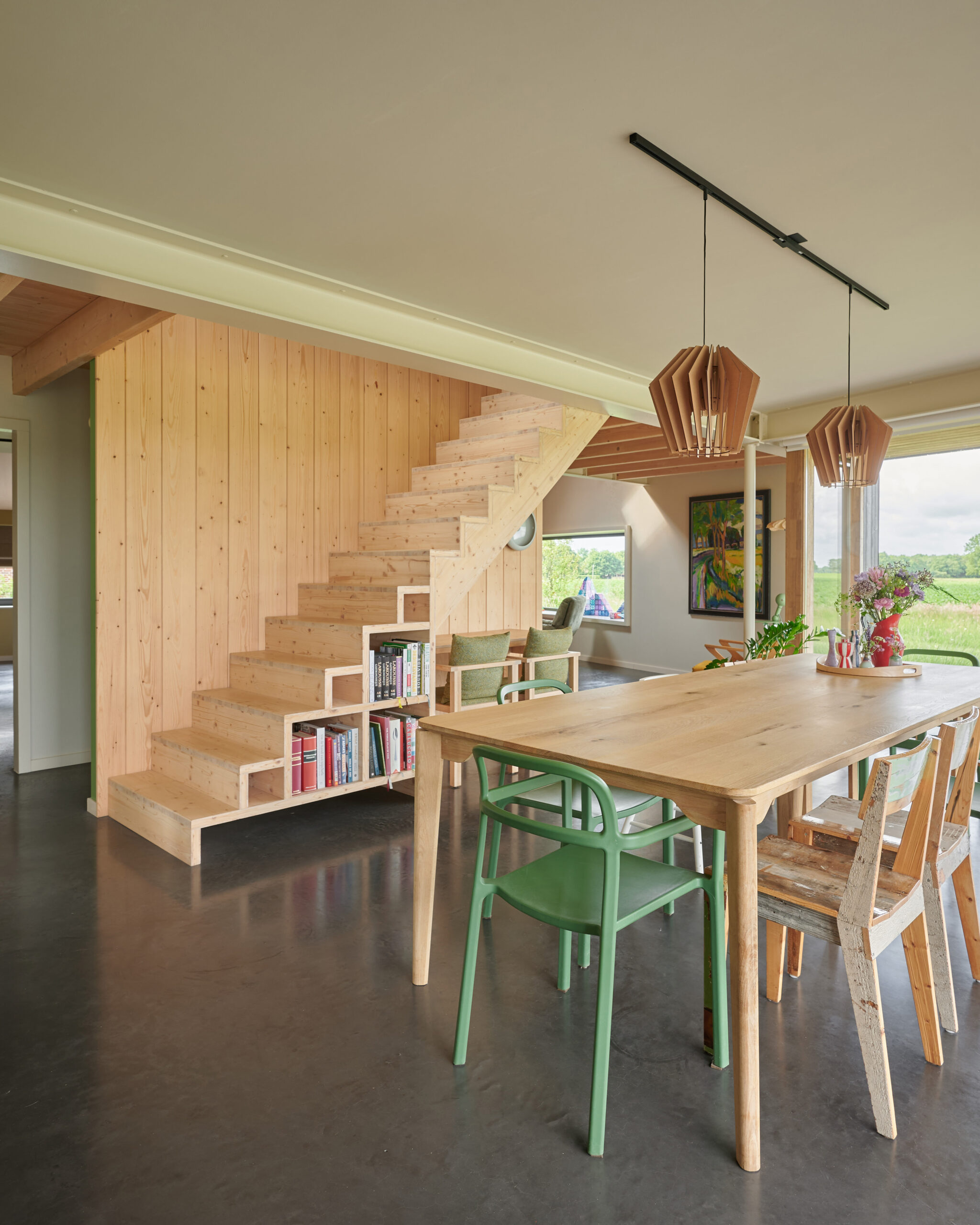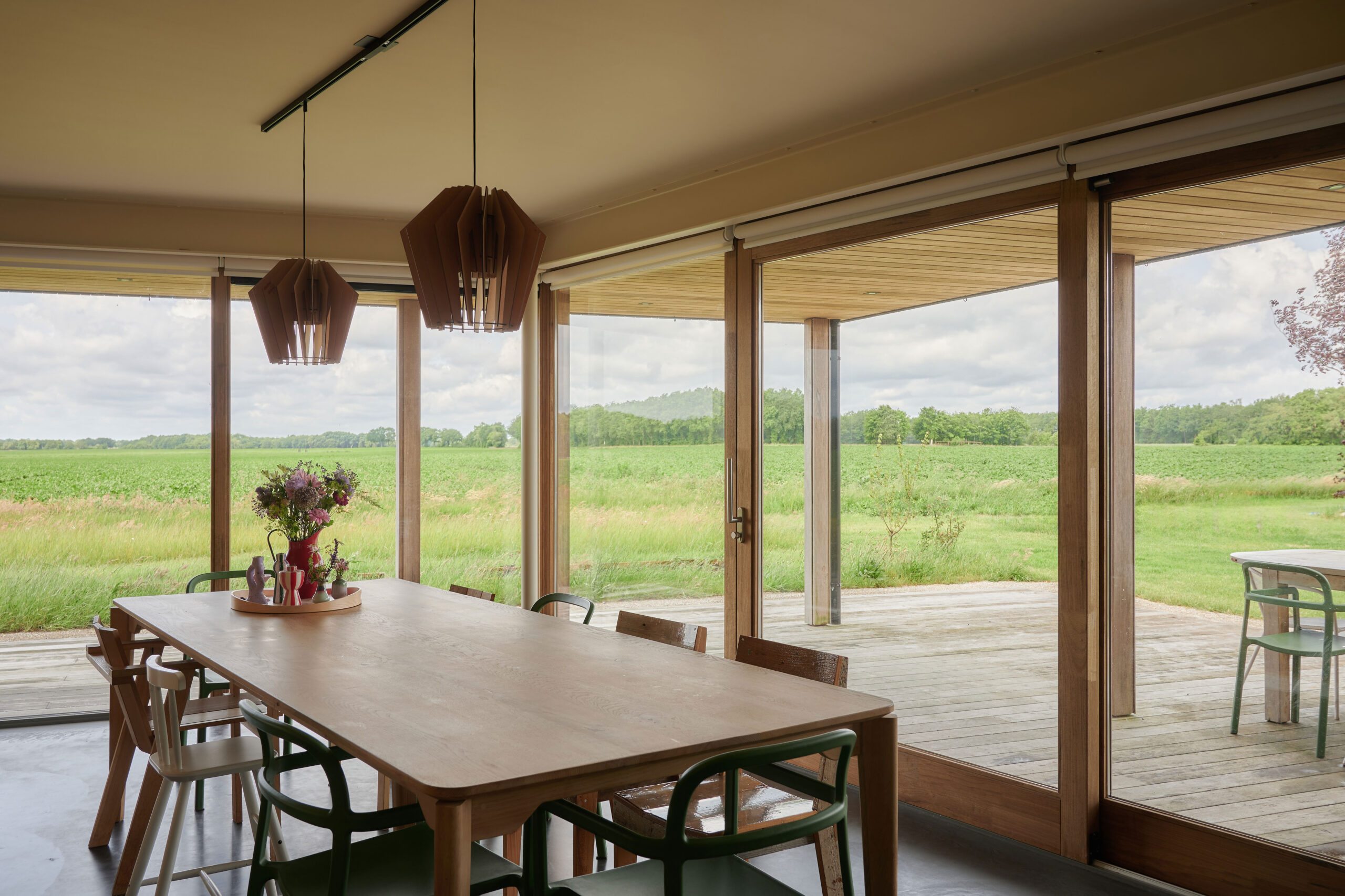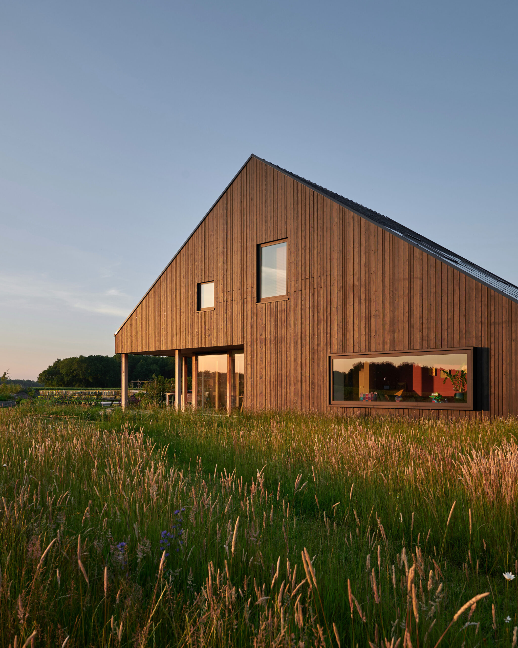 Projekt domu w Eext powstał z myślą o pełnym wykorzystaniu walorów lokalizacji. Otaczające teren łąki, drzewa i wody stały się nie tylko inspiracją dla architektów, ale też kluczowym elementem układu przestrzennego budynku. Lekka, prefabrykowana konstrukcja została posadowiona tak, aby maksymalnie otworzyć wnętrza na widoki oraz światło dzienne. Duże przeszklenia, starannie zaplanowane przesłony i przemyślane kadrowanie otaczającej natury sprawiają, że dom żyje w bezpośrednim kontakcie z otoczeniem.