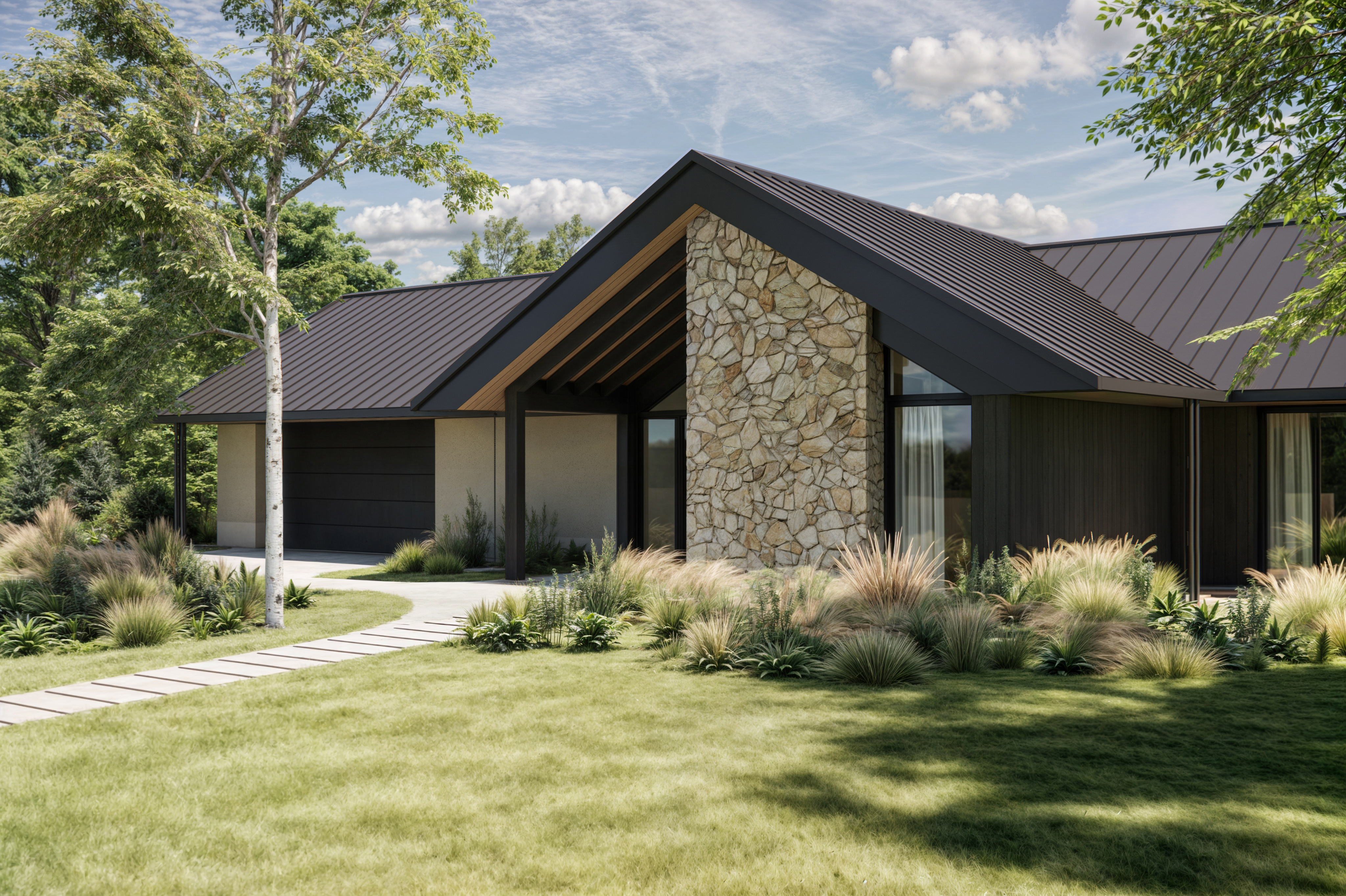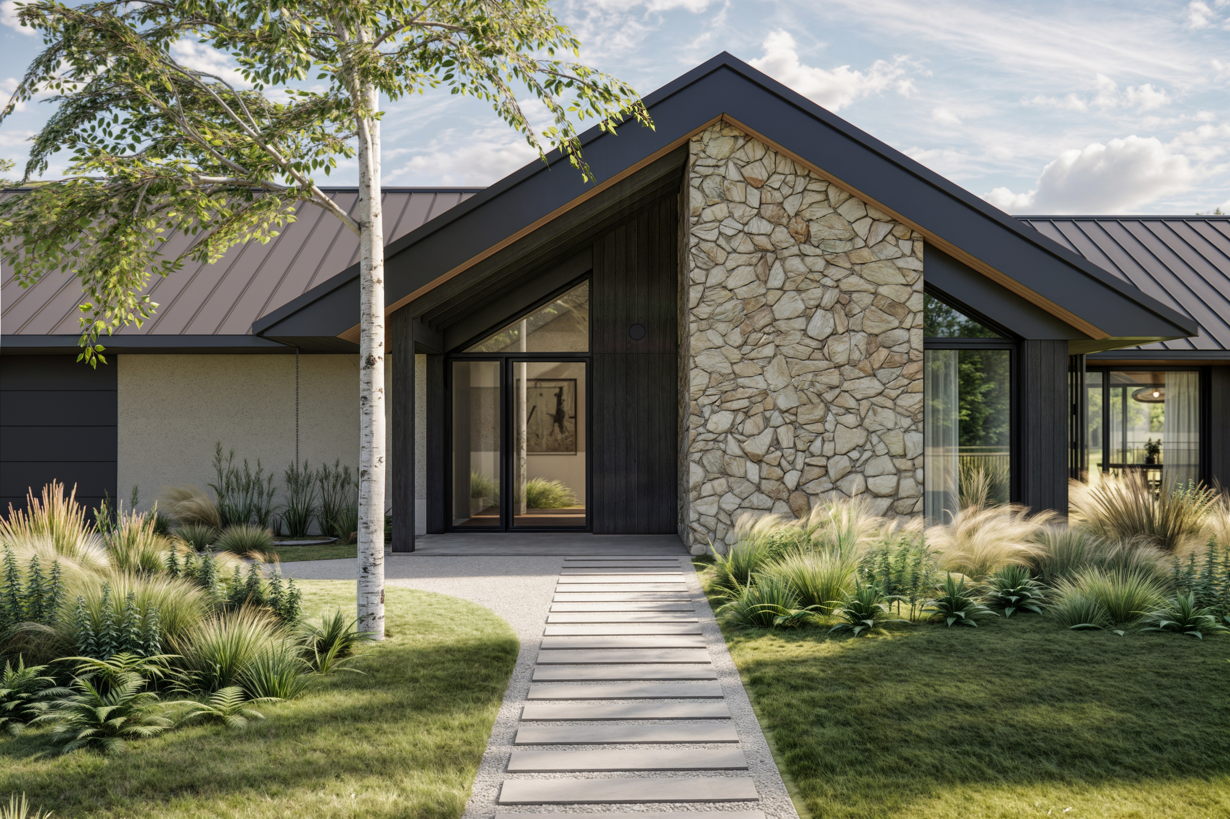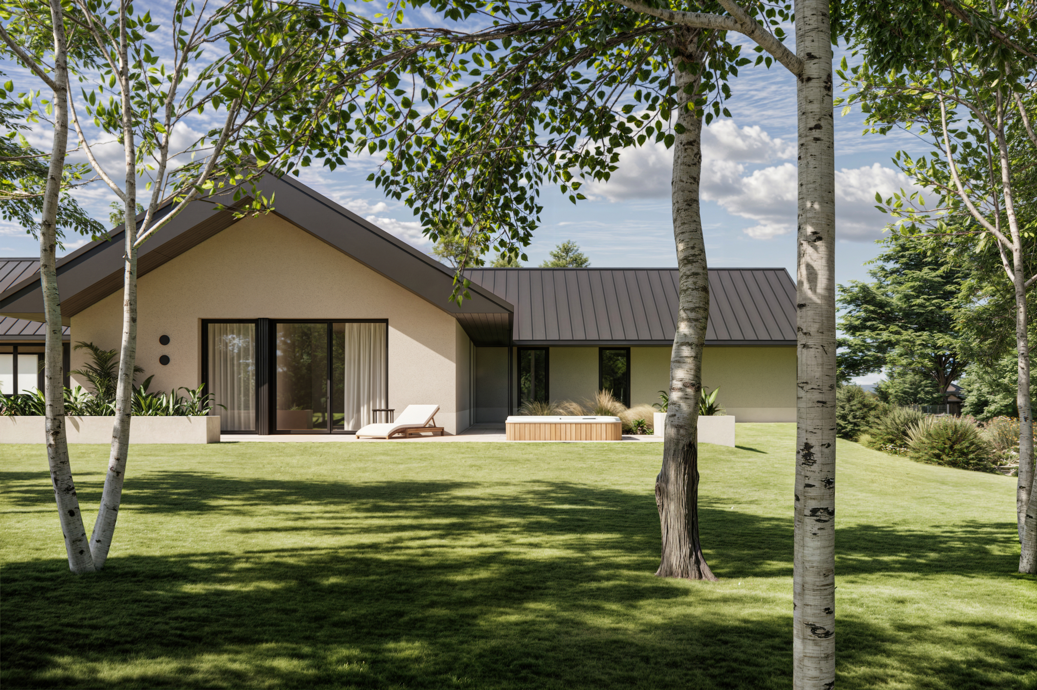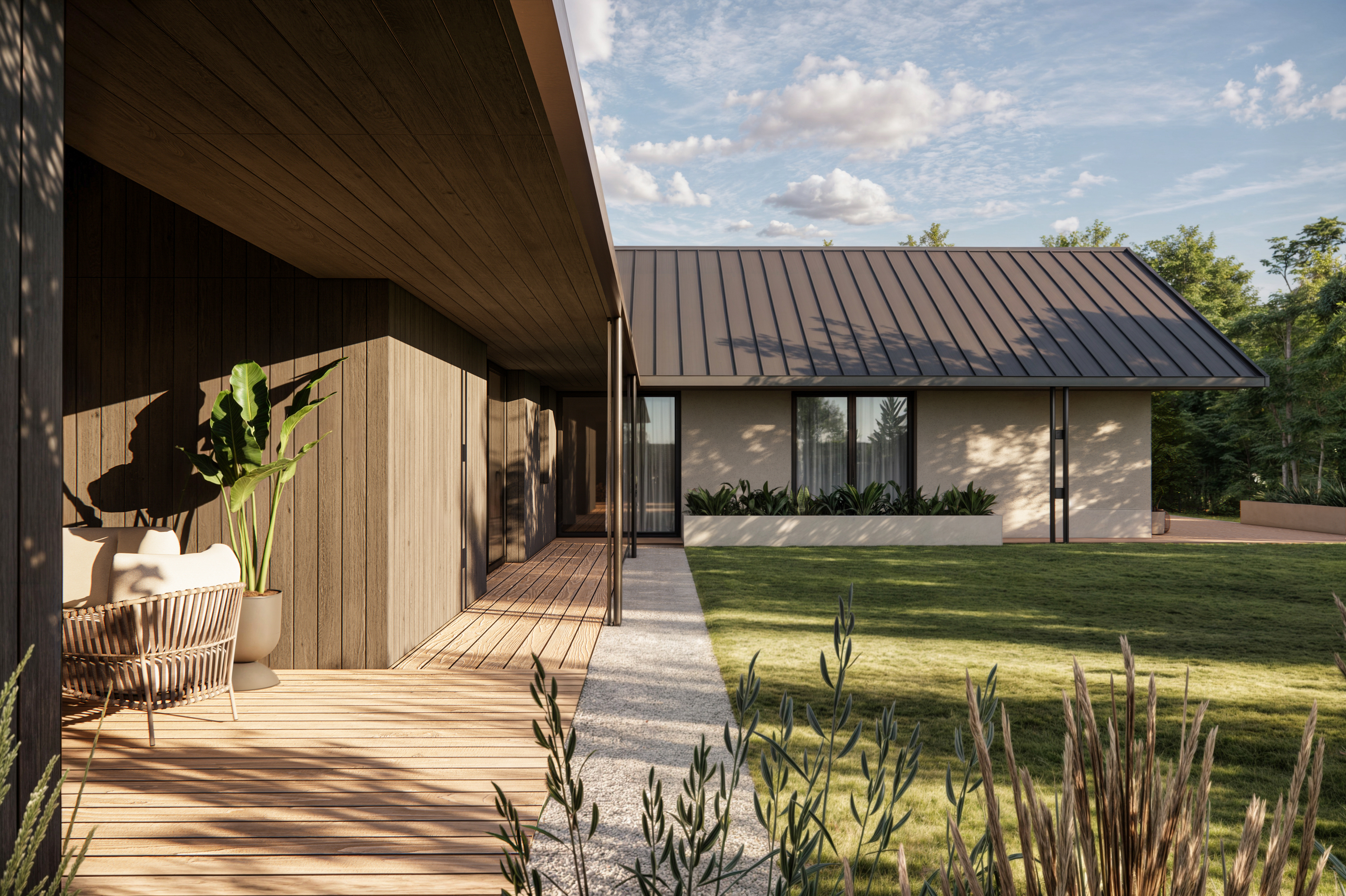 Rozległy dom parterowy harmonijnie wpisuje się w dużą działkę, oferując mieszkańcom komfortowe i intymne tarasy, zabezpieczone przed wiatrem. Mimo prostoty geometrii, budynek nie jest minimalistyczny. Architektura łączy w sobie różnorodność faktur: drewna, kamienia, betonu i tynku. Szczególną uwagę zwracają starannie zaprojektowane detale, funkcjonalne okapy oraz oryginalny element – podwójne rury spustowe, które wraz z dachem tworzą nietypowy motyw arkadowy. Duże przeszklenia dodatkowo potęgują efekt otwartości i łączą wnętrze domu z otaczającą naturą.