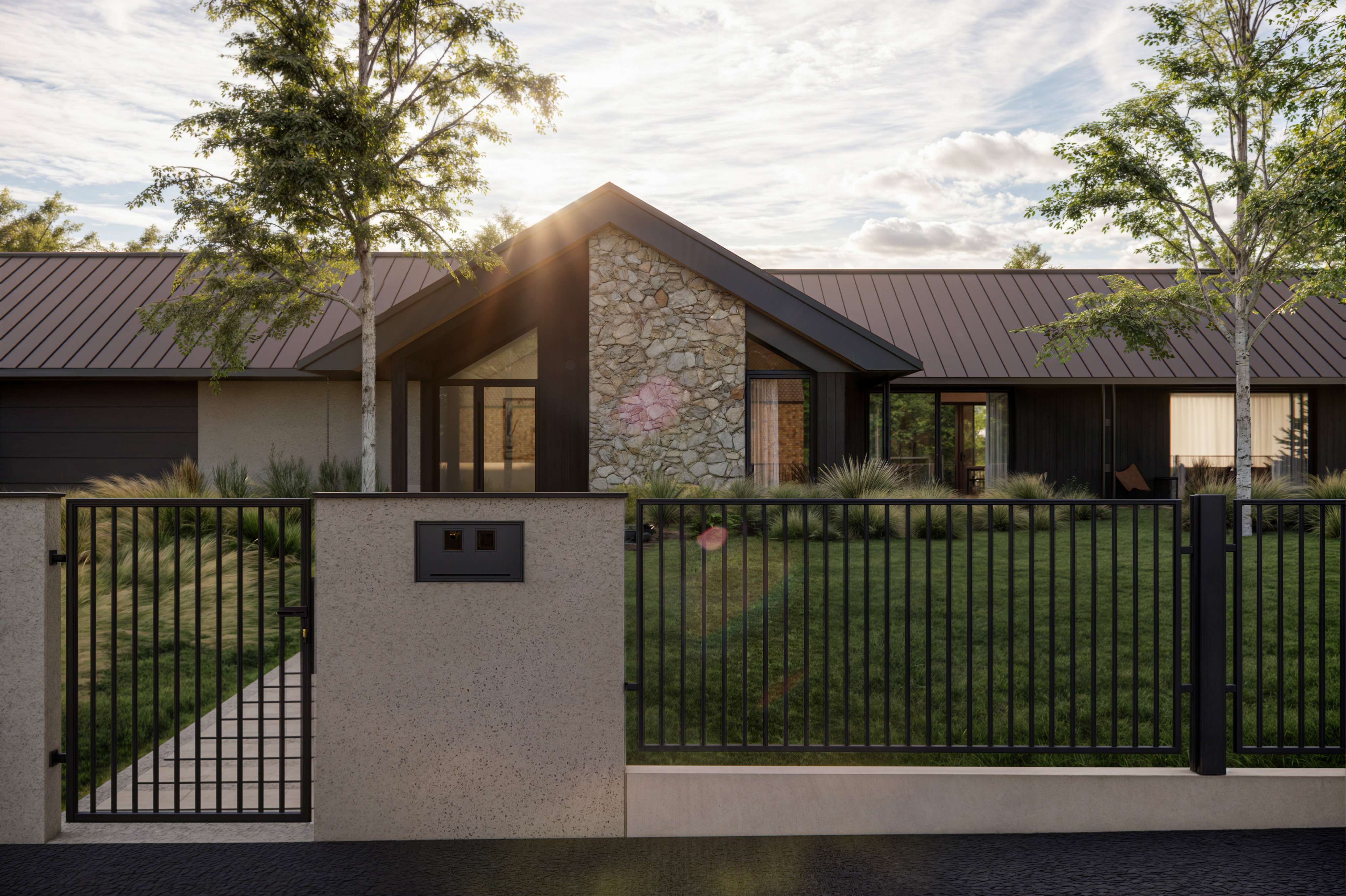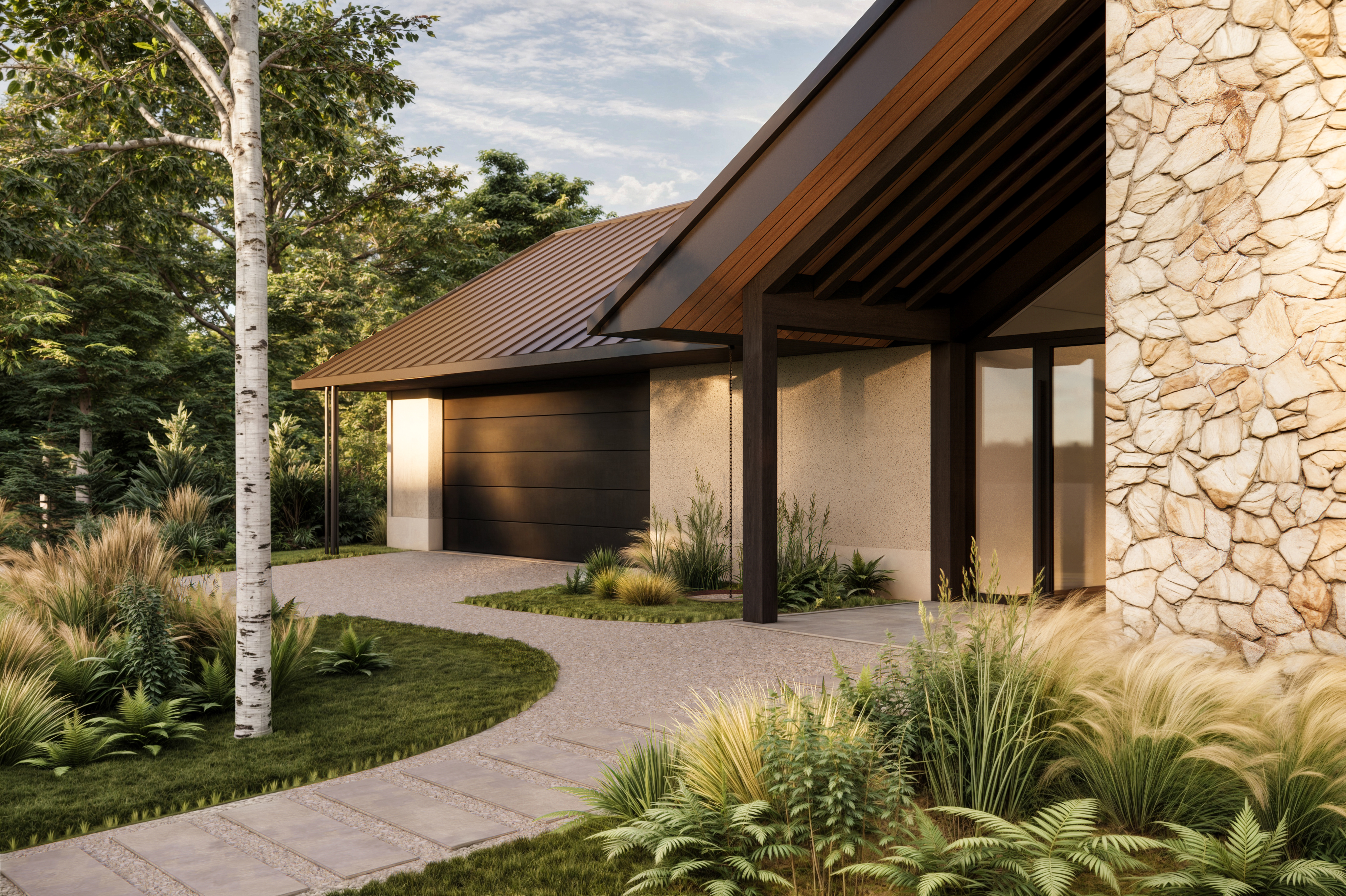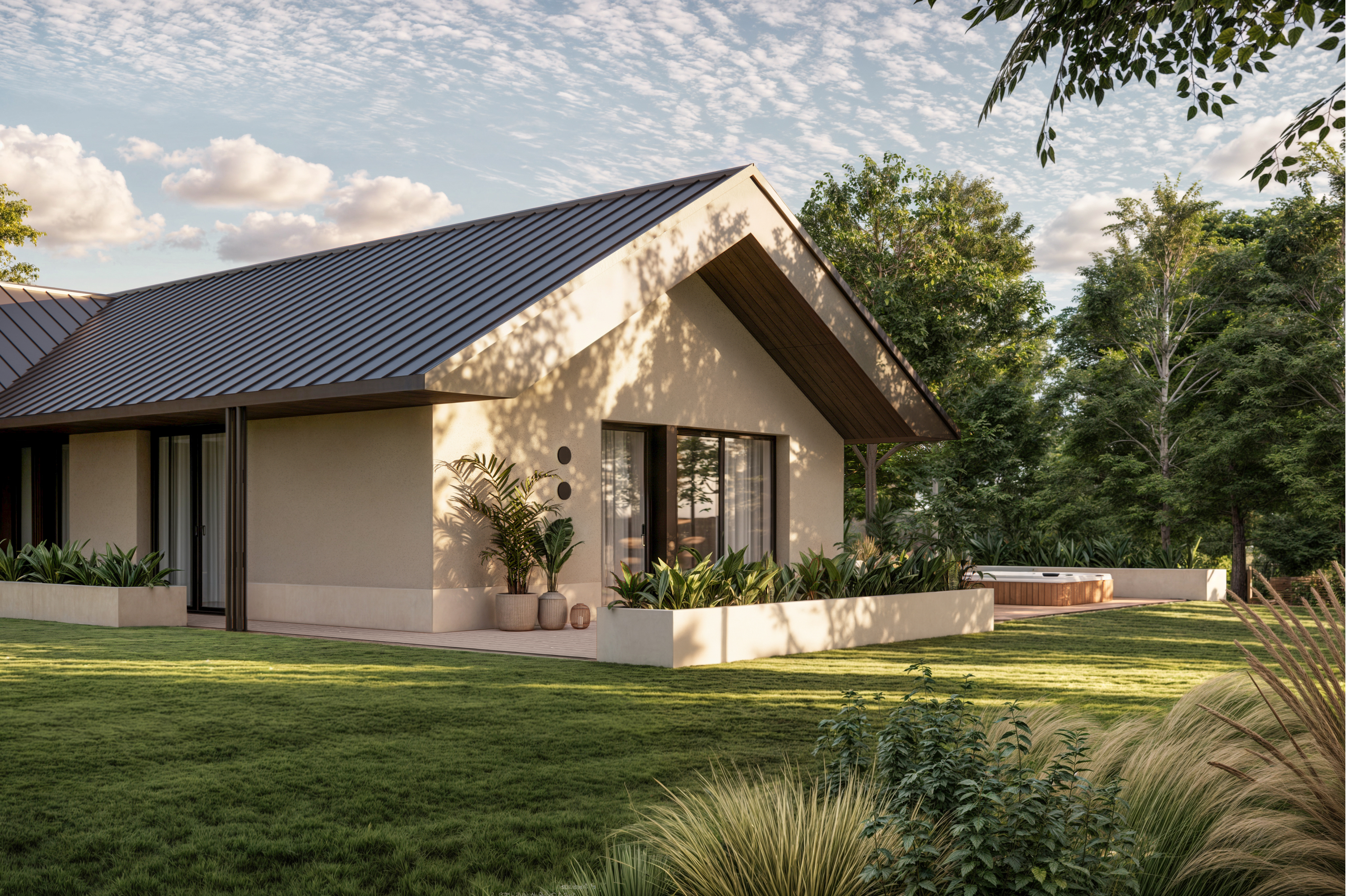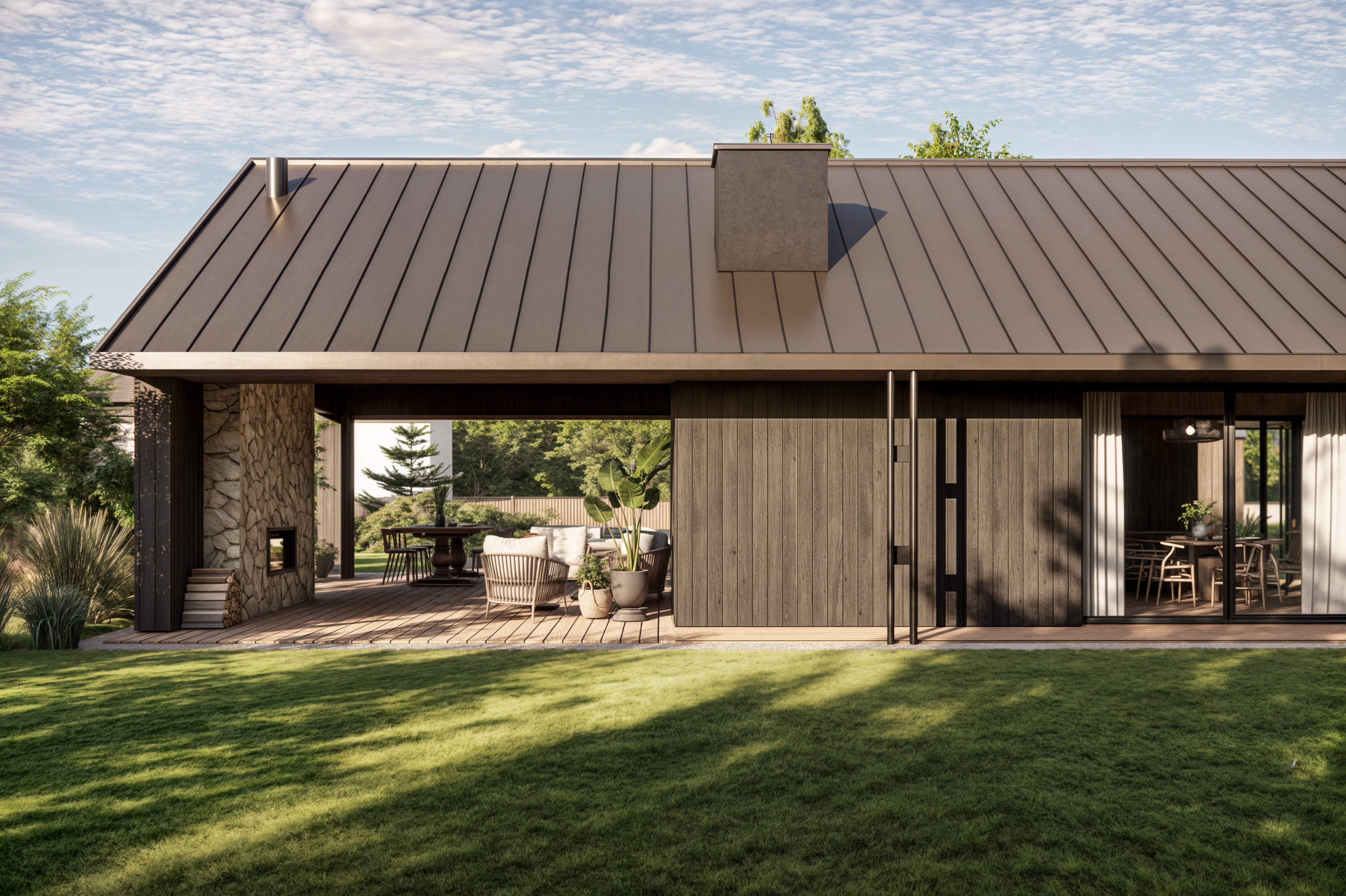 Rozległy dom parterowy harmonijnie wpisuje się w dużą działkę, oferując mieszkańcom komfortowe i intymne tarasy, zabezpieczone przed wiatrem. Mimo prostoty geometrii, budynek nie jest minimalistyczny. Architektura łączy w sobie różnorodność faktur: drewna, kamienia, betonu i tynku. Szczególną uwagę zwracają starannie zaprojektowane detale, funkcjonalne okapy oraz oryginalny element – podwójne rury spustowe, które wraz z dachem tworzą nietypowy motyw arkadowy. Duże przeszklenia dodatkowo potęgują efekt otwartości i łączą wnętrze domu z otaczającą naturą.