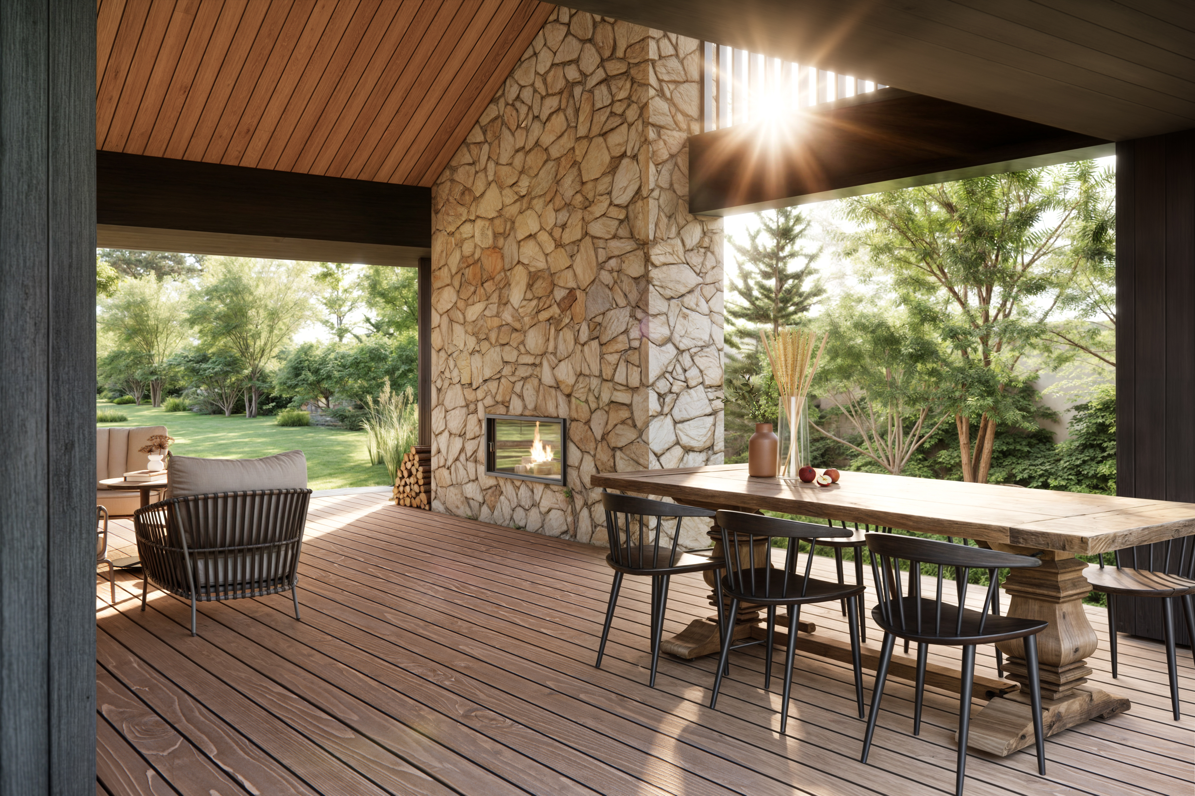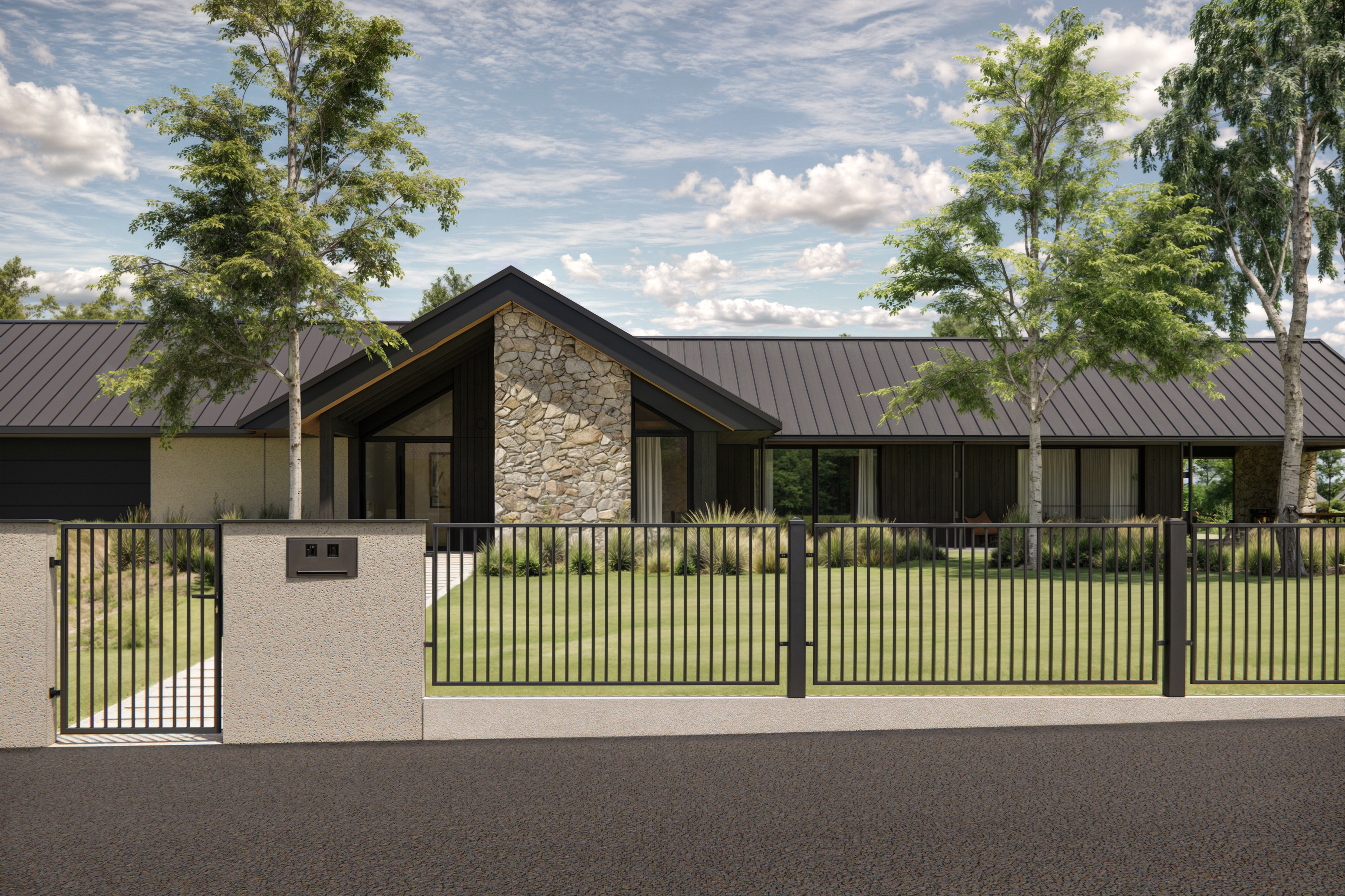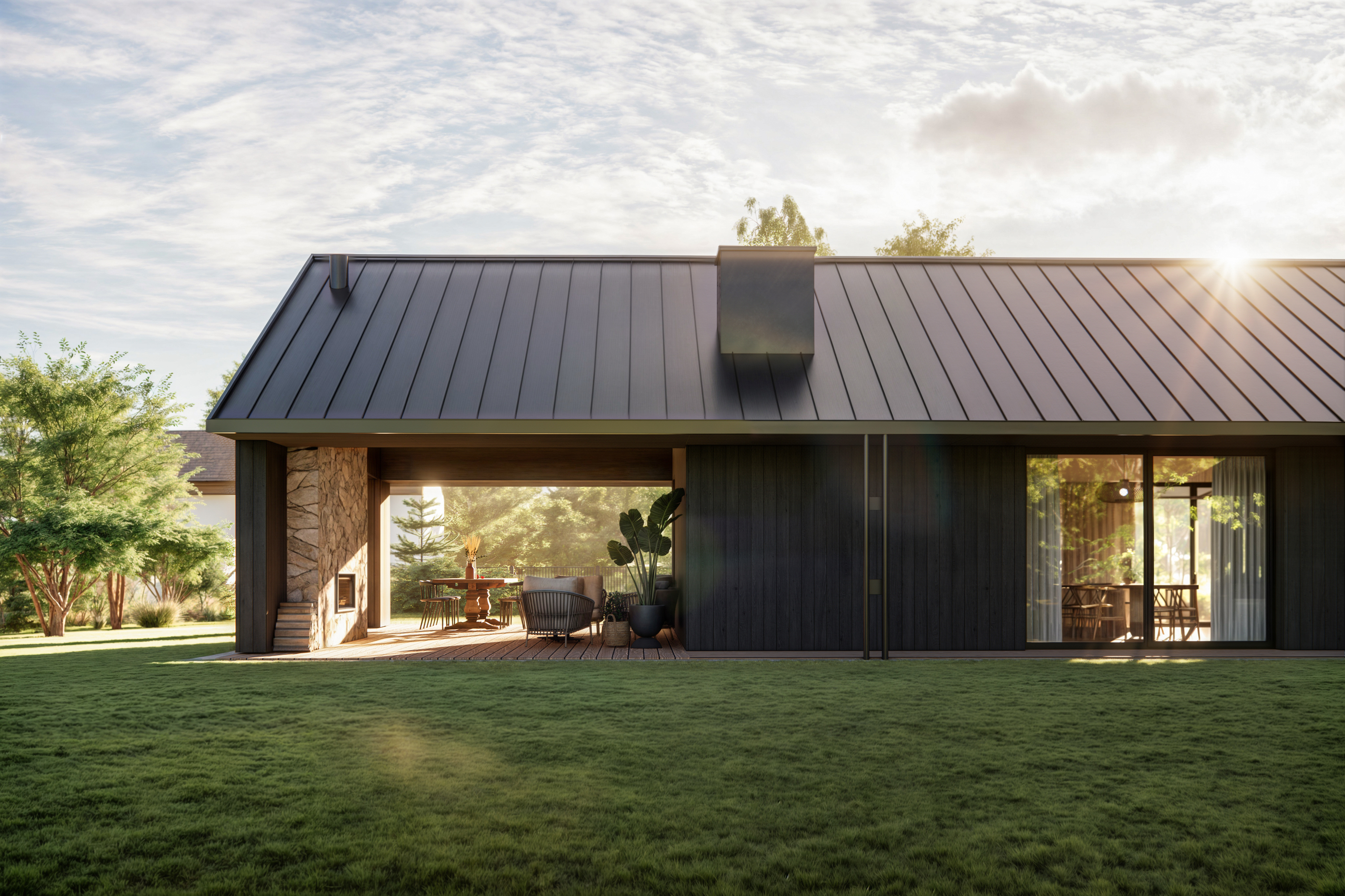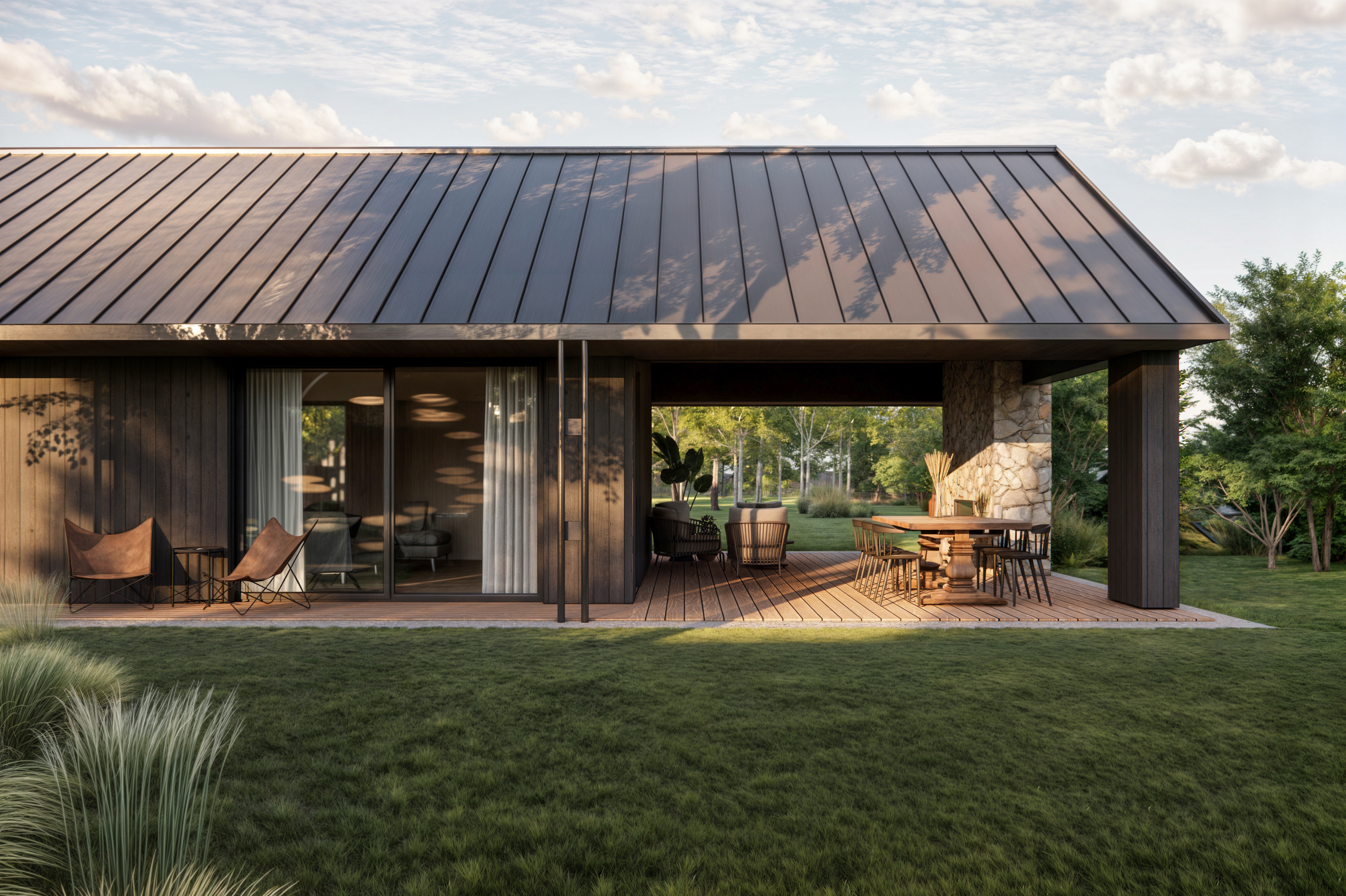Rozległy dom parterowy harmonijnie wpisuje się w dużą działkę, oferując mieszkańcom komfortowe i intymne tarasy, zabezpieczone przed wiatrem. Mimo prostoty geometrii, budynek nie jest minimalistyczny. Architektura łączy w sobie różnorodność faktur: drewna, kamienia, betonu i tynku. Szczególną uwagę zwracają starannie zaprojektowane detale, funkcjonalne okapy oraz oryginalny element – podwójne rury spustowe, które wraz z dachem tworzą nietypowy motyw arkadowy. Duże przeszklenia dodatkowo potęgują efekt otwartości i łączą wnętrze domu z otaczającą naturą.