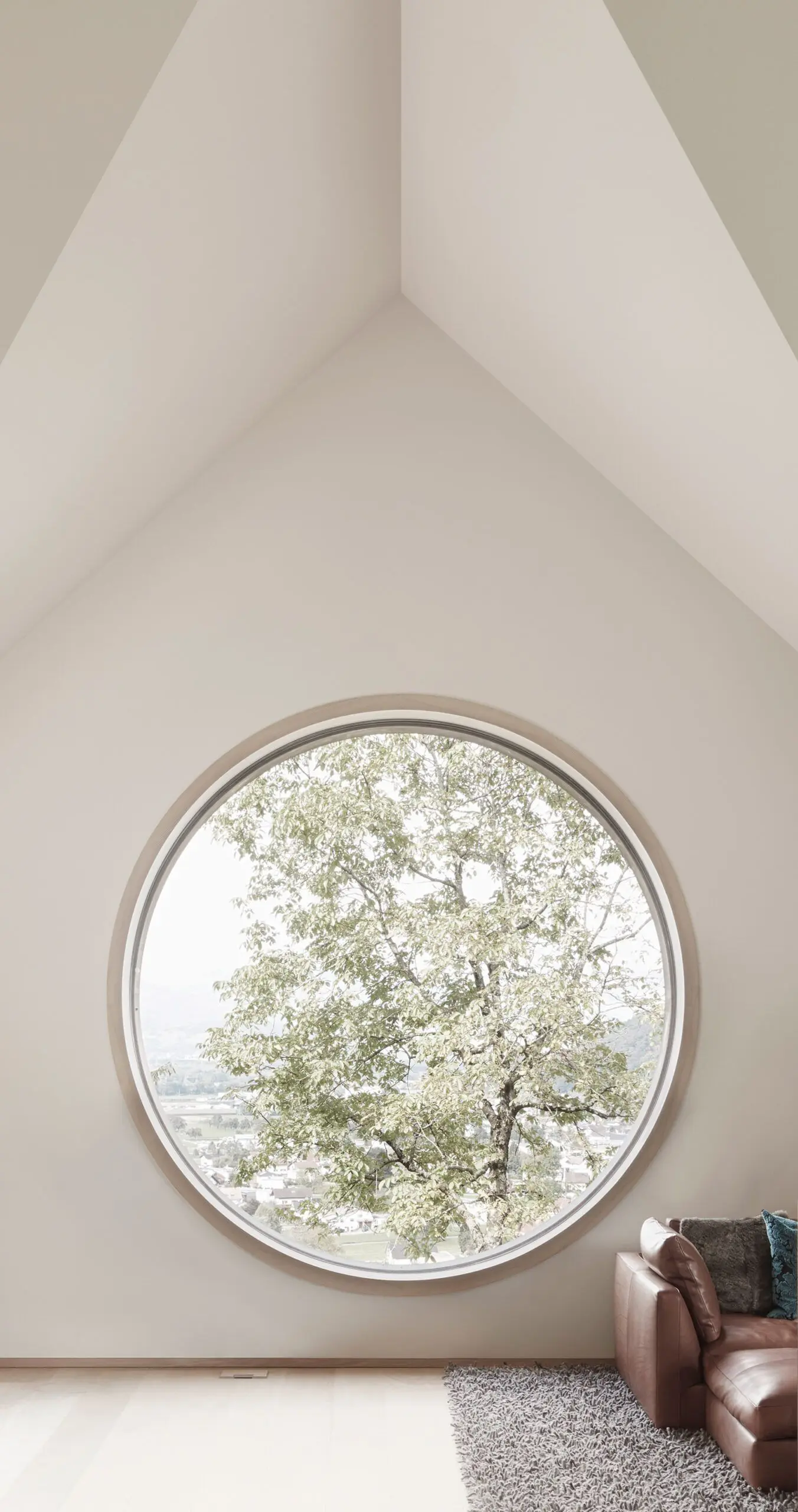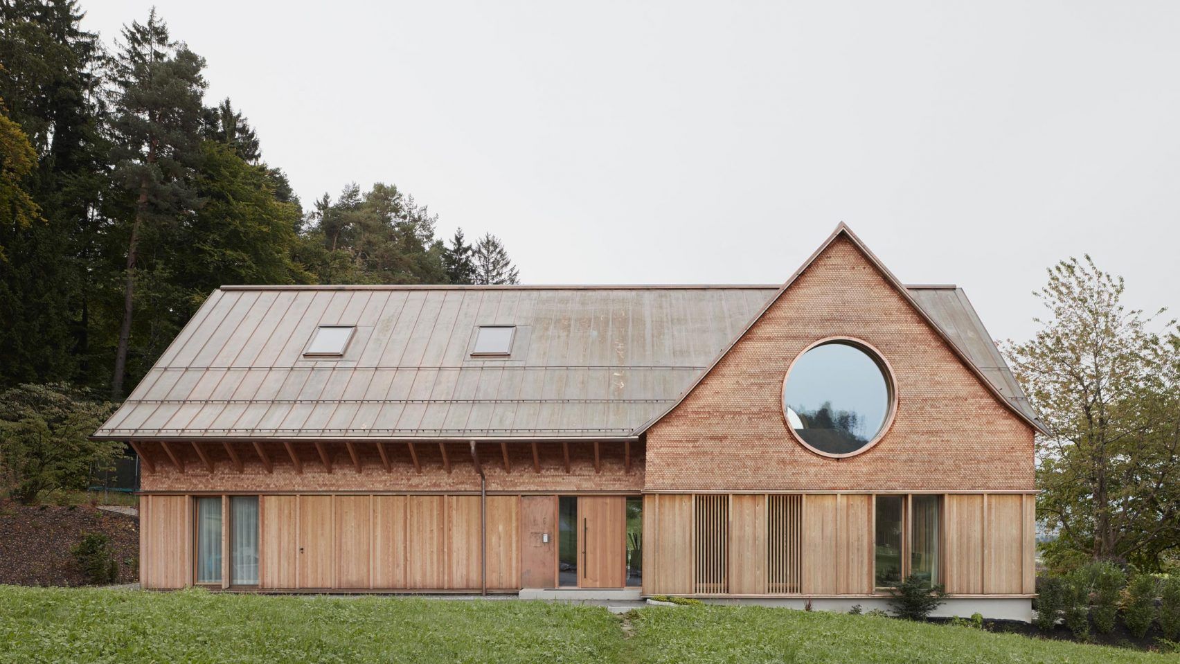 Trzy duże, okrągłe okna wyróżniają się w fasadzie domu zaprojektowanym przez firmę Innauer-Matt Architekten. Dom z widokiem na Dolinę Renu zachwyca.