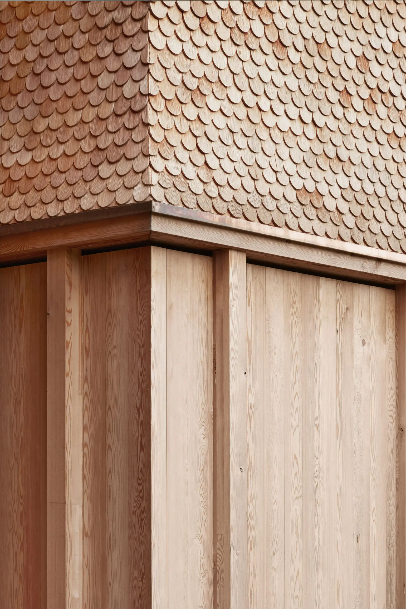 Parter, który powstał na betonie, ma elewację z modrzewiowych desek. W niektórych miejscach przechodzą one w listwy stanowiące częściową przesłonę dla pełnych przeszkleń. Ścianę na poziomie wyższym, łącznie ze ścianami szczytowymi, pokrywa natomiast charakterystyczny gont wykonany również z drewna modrzewiowego. Świetnie współgra z miedzianym dachem. „Z czasem oba materiały pokryją się naturalną patyną” zaznaczają architekci.