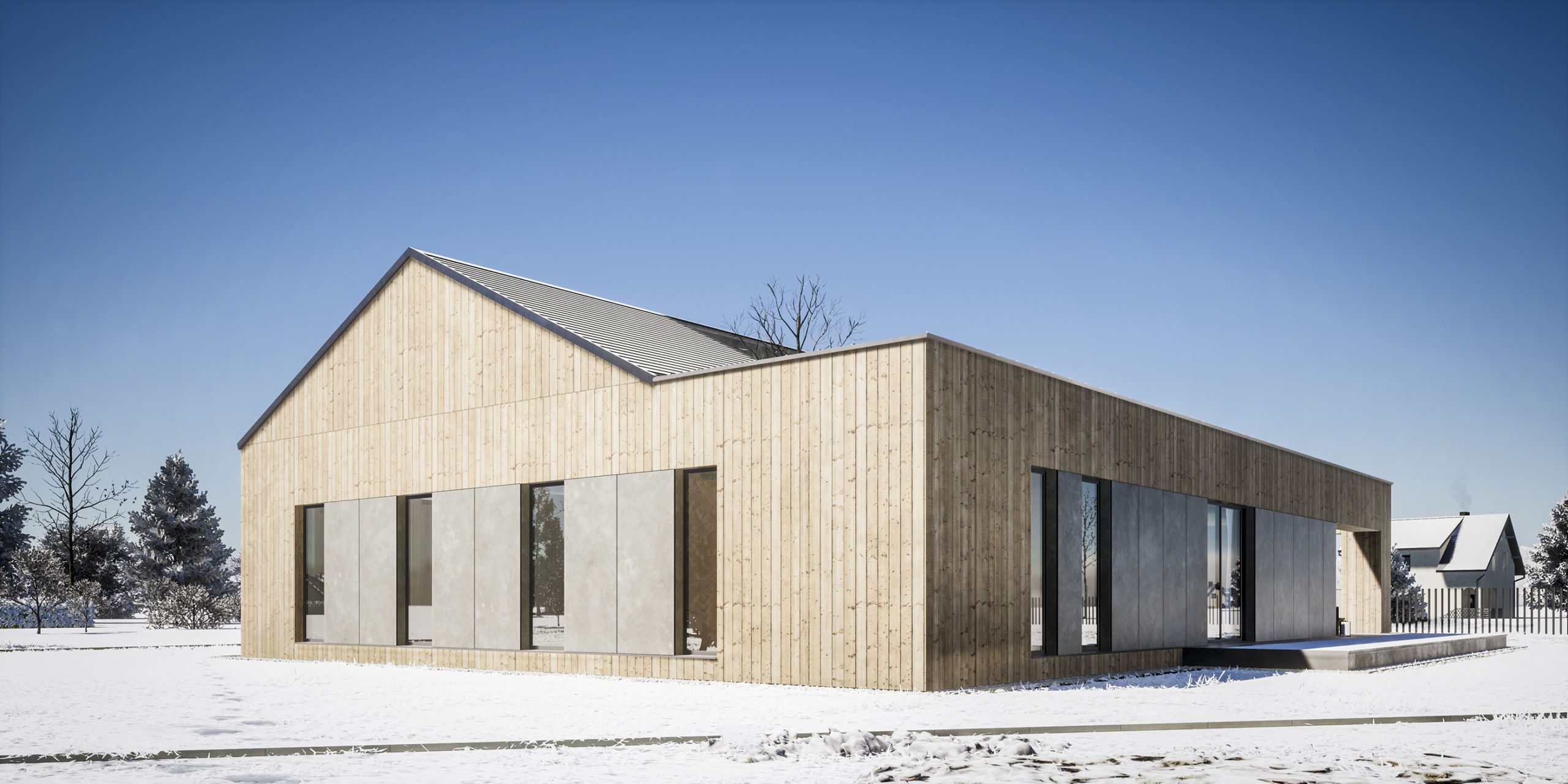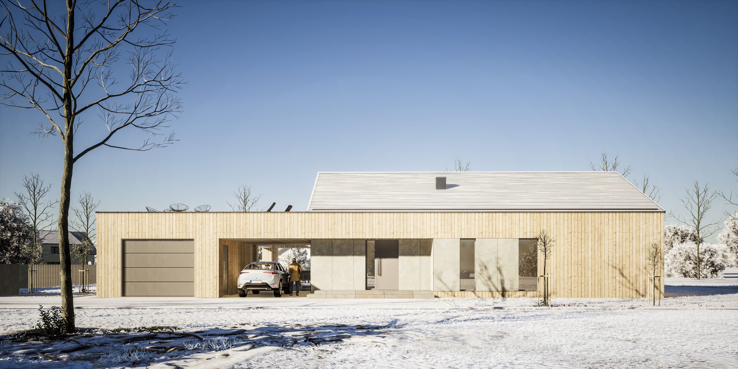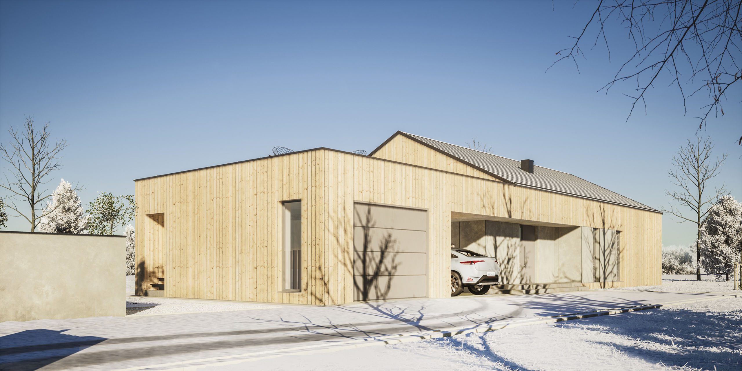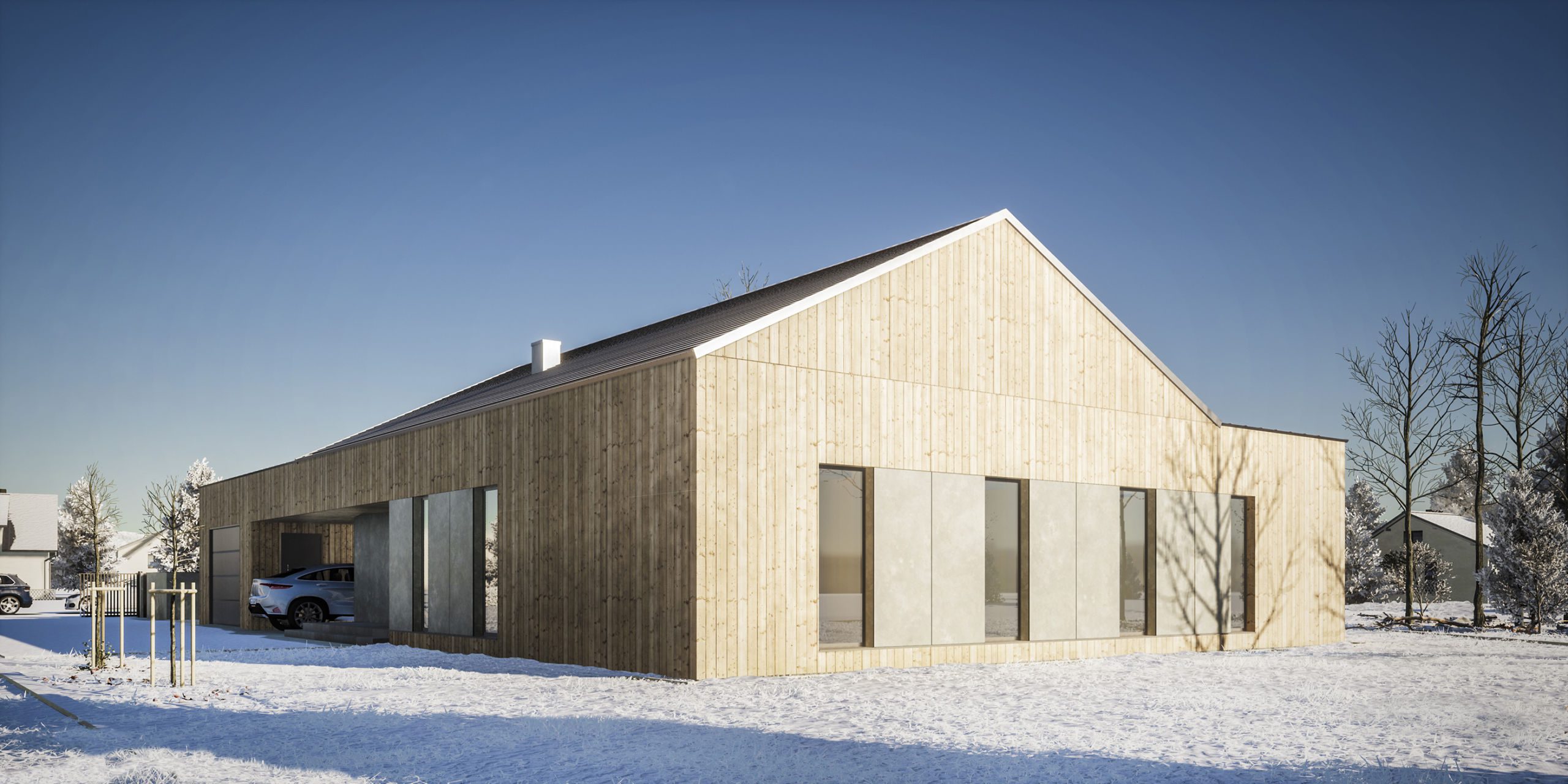 Bryła budynku została oparta na klasycznej formie nowoczesnej stodoły – prostej, dwuspadowej konstrukcji o kącie nachylenia połaci 26°, zaprojektowanej jako dach bezokapowy. Nowoczesna stodoła została rozbudowana o prostopadłościenną bryłę garażu z płaskim dachem, który funkcjonalnie łączy się z domem, tworząc spójną, zwartą kompozycję.