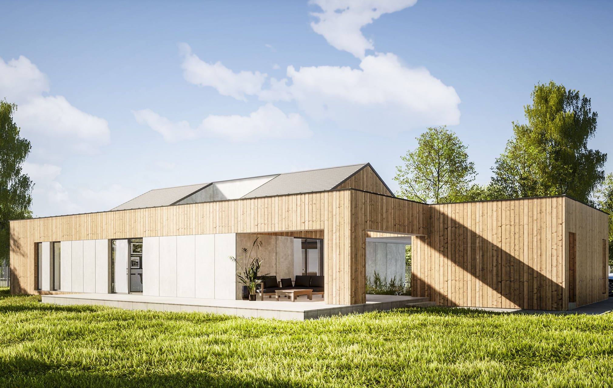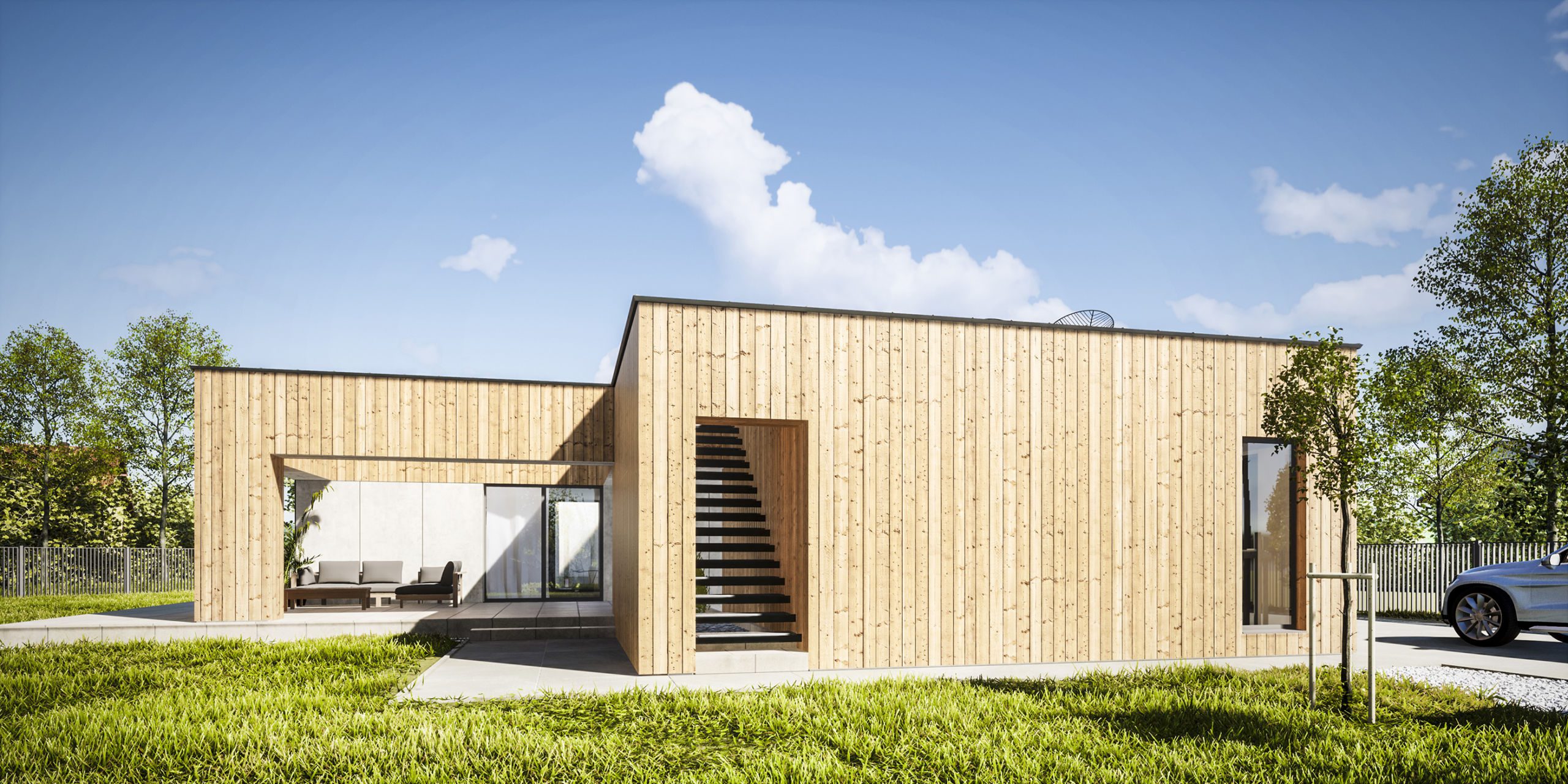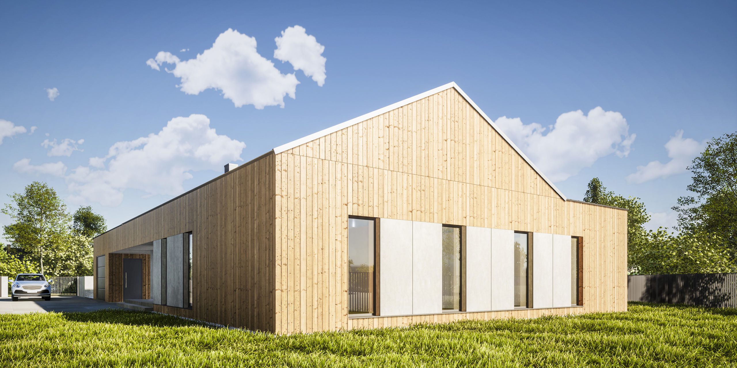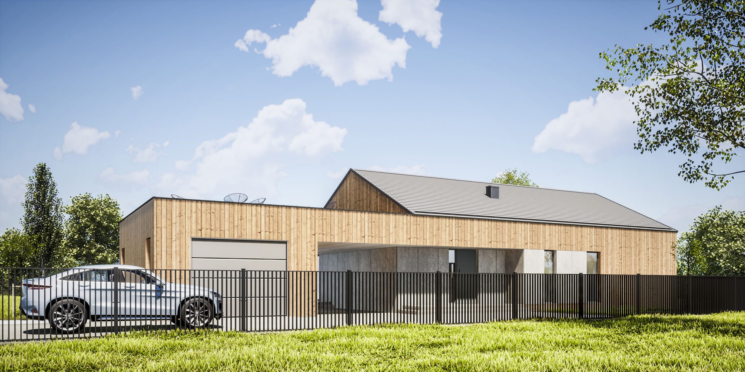 Bryła budynku została oparta na klasycznej formie nowoczesnej stodoły – prostej, dwuspadowej konstrukcji o kącie nachylenia połaci 26°, zaprojektowanej jako dach bezokapowy. Nowoczesna stodoła została rozbudowana o prostopadłościenną bryłę garażu z płaskim dachem, który funkcjonalnie łączy się z domem, tworząc spójną, zwartą kompozycję.