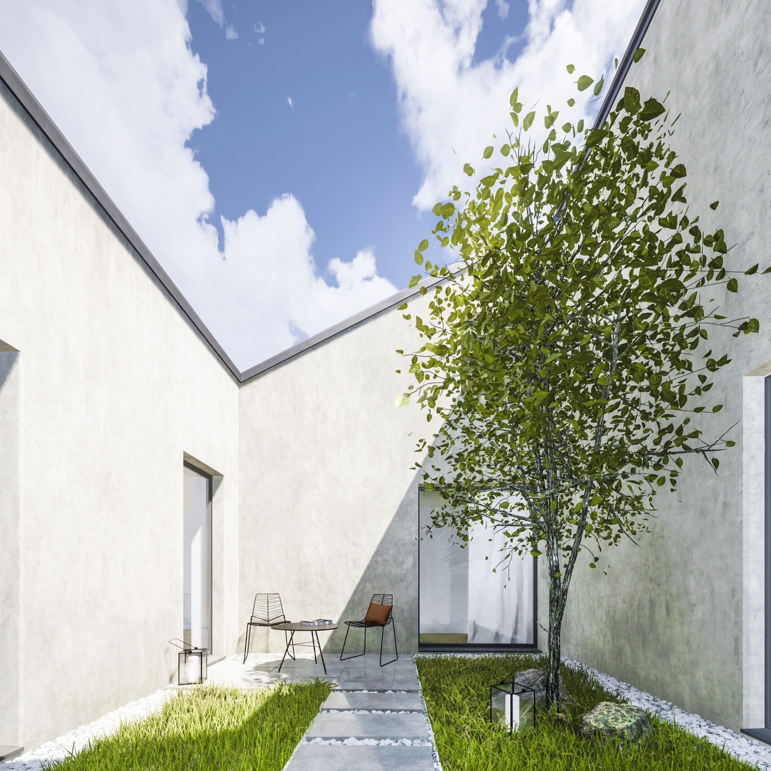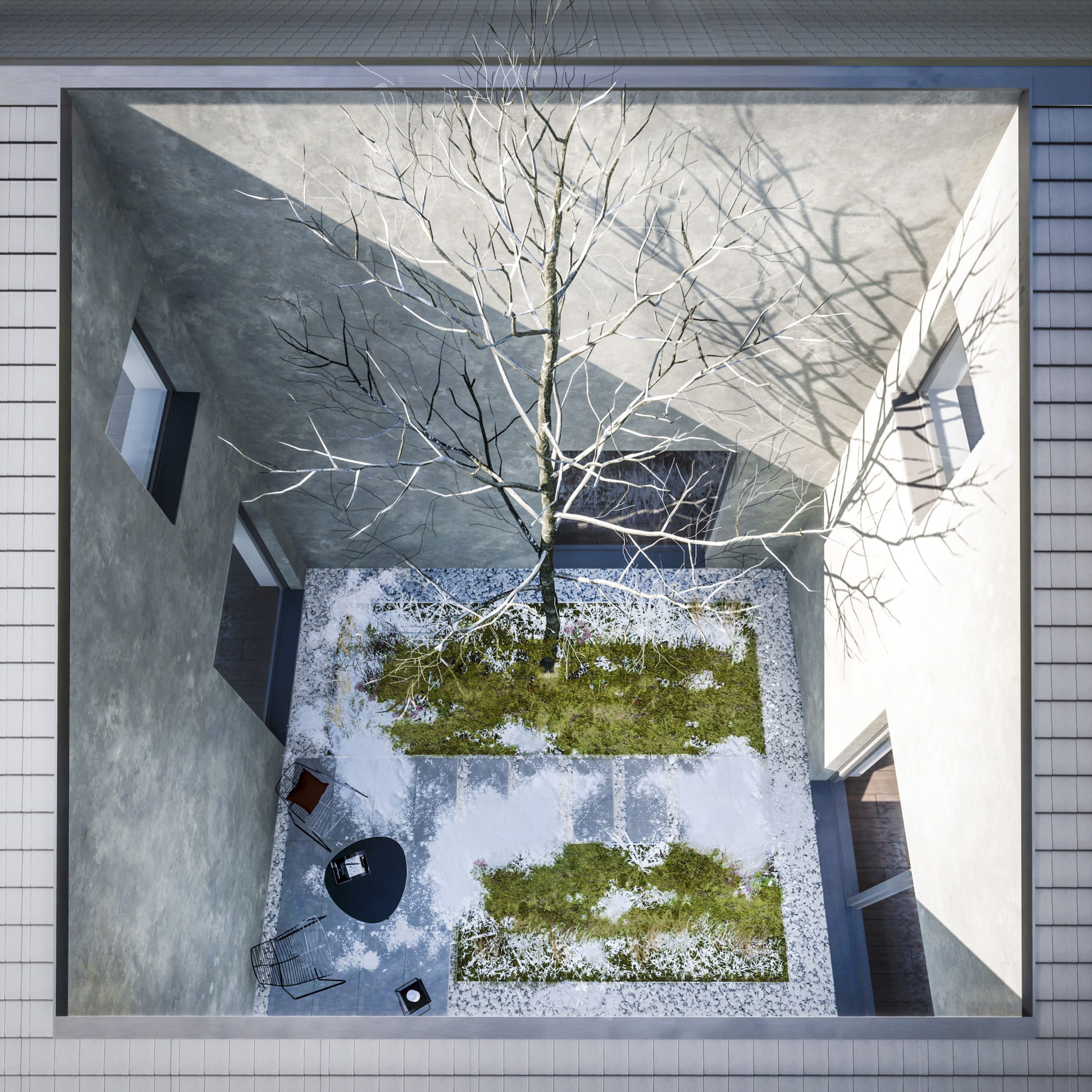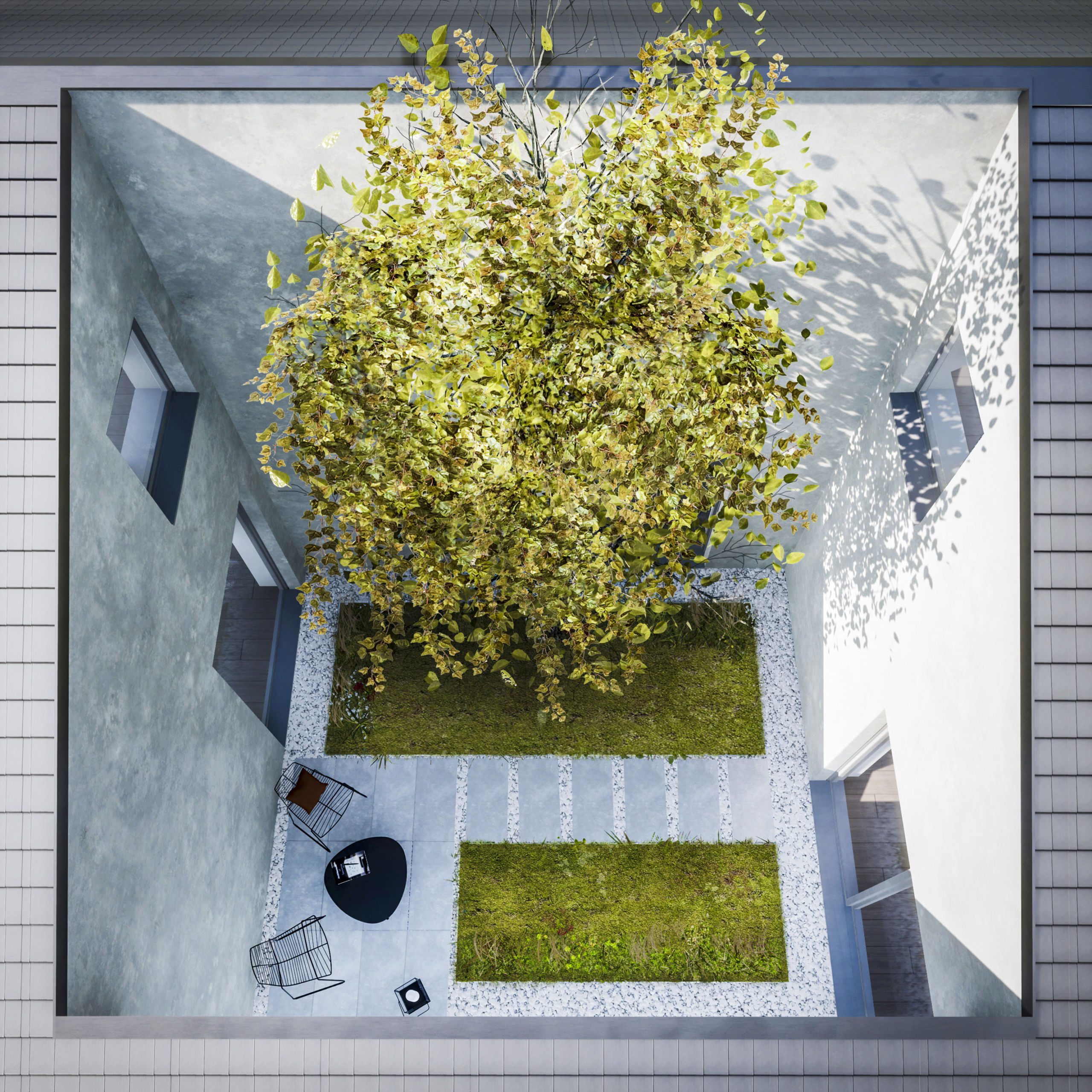 Wejście do domu oraz droga dojazdowa zostały zlokalizowane od strony południowej, co przełożyło się na przemyślane rozplanowanie wnętrz. Strefa dzienna wraz z kuchnią została umieszczona od strony zachodniej, by maksymalnie wykorzystać światło dzienne. Centralnym punktem domu stało się wewnętrzne atrium – zielony dziedziniec wprowadzający światło i przyrodę do wnętrza, jednocześnie zapewniając mieszkańcom intymność i dodatkową przestrzeń rekreacyjną.