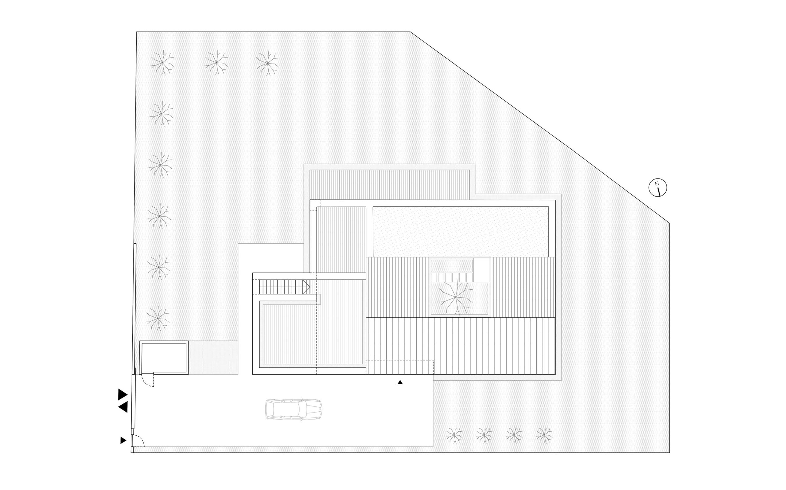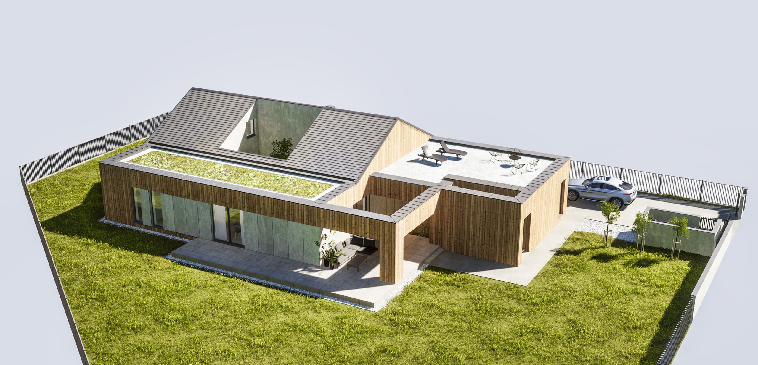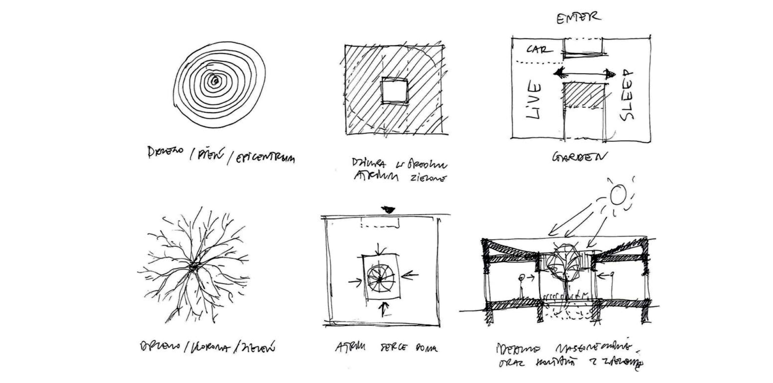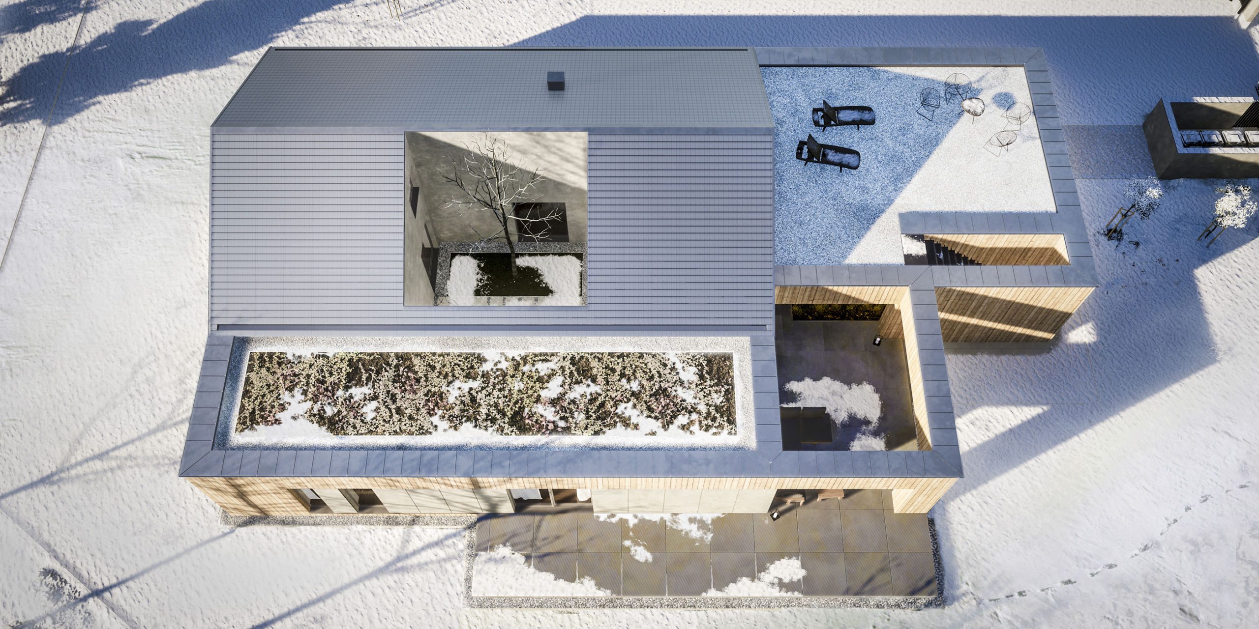 Wejście do domu oraz droga dojazdowa zostały zlokalizowane od strony południowej, co przełożyło się na przemyślane rozplanowanie wnętrz. Strefa dzienna wraz z kuchnią została umieszczona od strony zachodniej, by maksymalnie wykorzystać światło dzienne. Centralnym punktem domu stało się wewnętrzne atrium – zielony dziedziniec wprowadzający światło i przyrodę do wnętrza, jednocześnie zapewniając mieszkańcom intymność i dodatkową przestrzeń rekreacyjną.