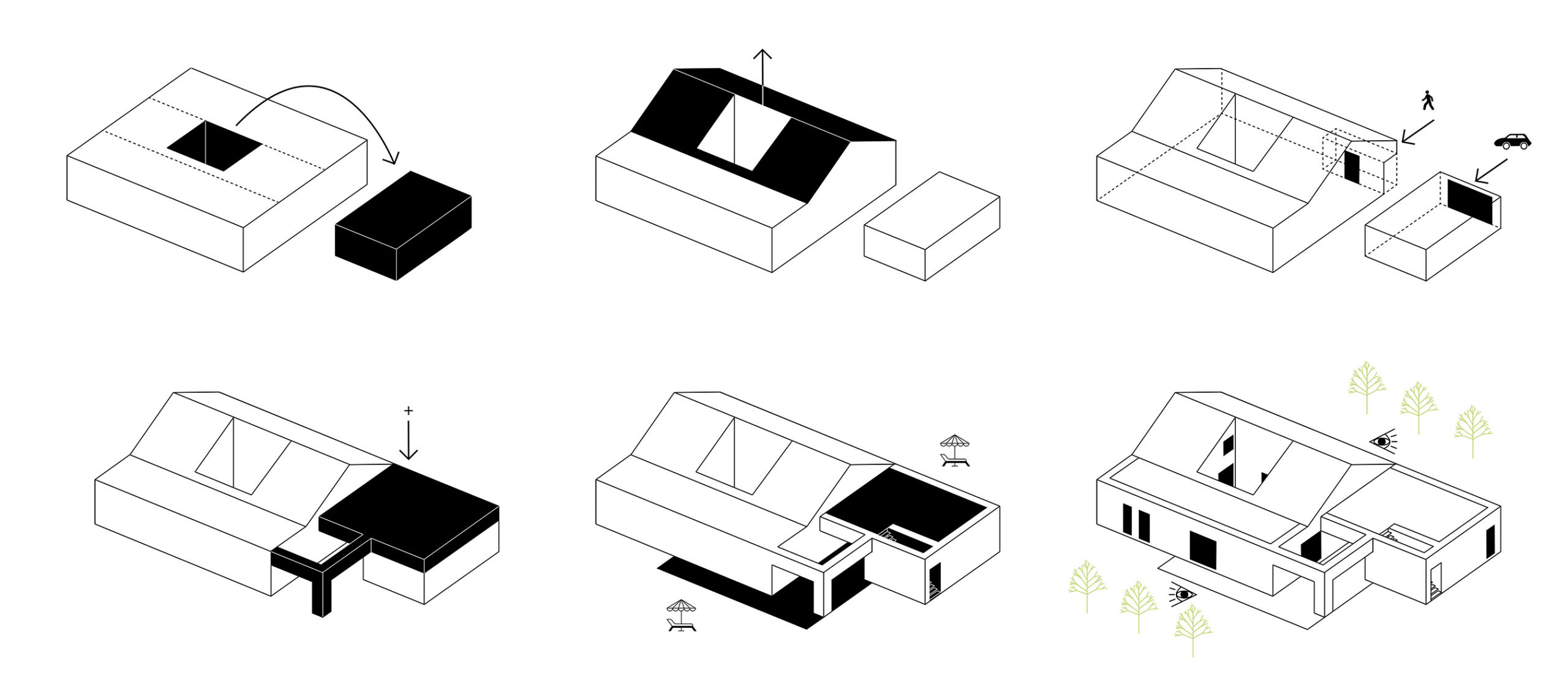 Celem projektu było stworzenie kameralnej enklawy dla mieszkańców, gdzie przestrzeń półprywatna i prywatna zostały wyraźnie wydzielone. Inspiracją stała się zarówno tradycyjna zabudowa zagrodowa, jak i naturalne otoczenie.