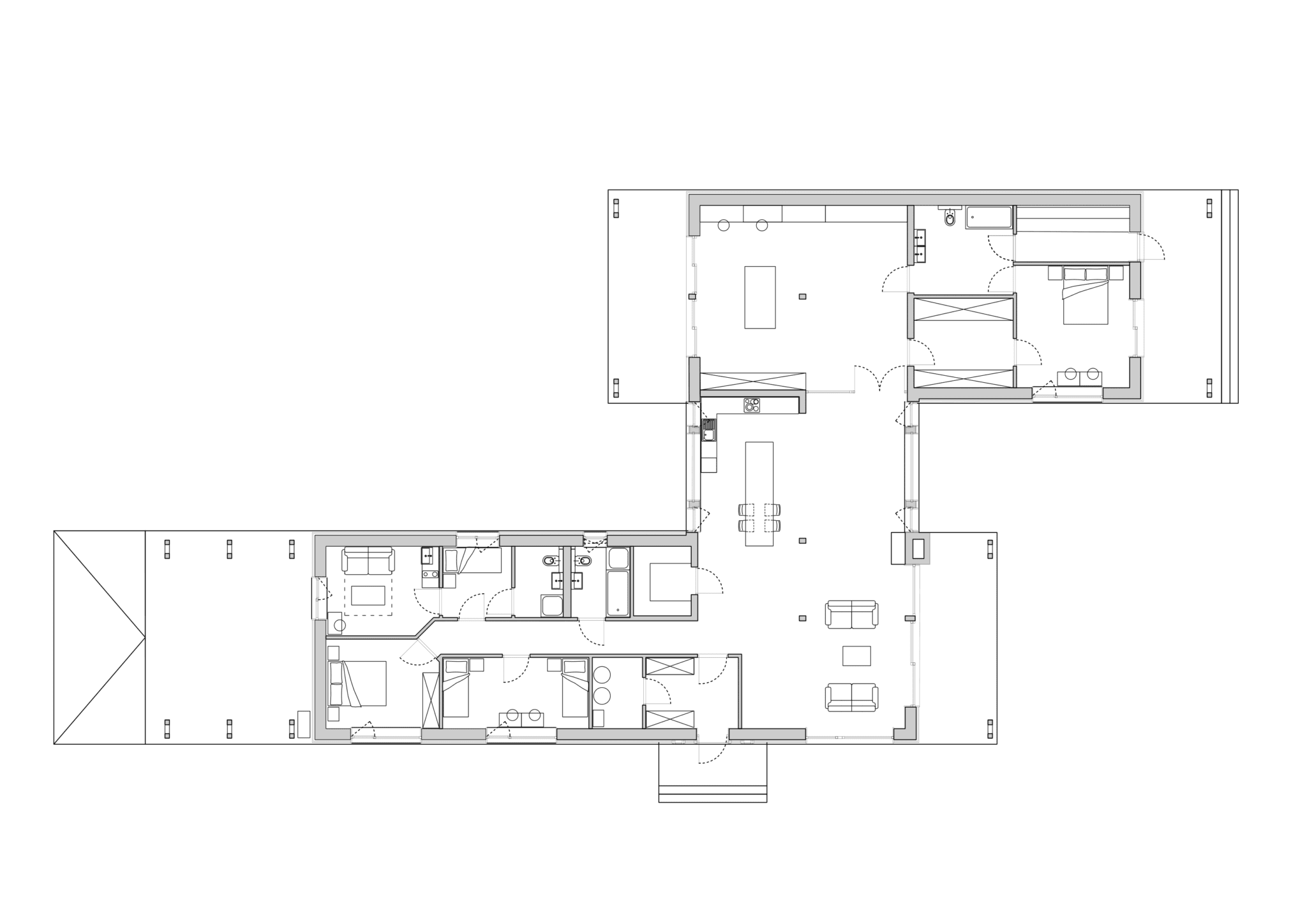 Na parterze znajduje się otwarta strefa dzienna: jasny salon z kominkiem, jadalnia oraz kuchnia z ergonomicznym układem. Przestrzeń ta płynnie łączy się z jedną z werand, tworząc naturalne przedłużenie domu. Uzupełnieniem parteru są łazienka, pomieszczenia gospodarcze i kotłownia. Poddasze pełni funkcję prywatnej strefy domowników. Sypialnia główna z garderobą oraz trzy dodatkowe pokoje idealnie sprawdzą się jako przestrzeń dla dzieci, biuro lub pokój gościnny. Całość dopełnia wygodna łazienka rodzinna.