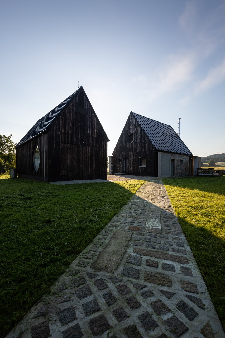 Projekt TŘI.ČTRNÁCT architekti to przykład architektury, która nie konkuruje z otoczeniem, lecz je uzupełnia. Nowy dom i pracownia tworzą spokojne założenie, w którym historia miejsca, krajobraz Jesioników i codzienne potrzeby mieszkańców splatają się w spójną całość.