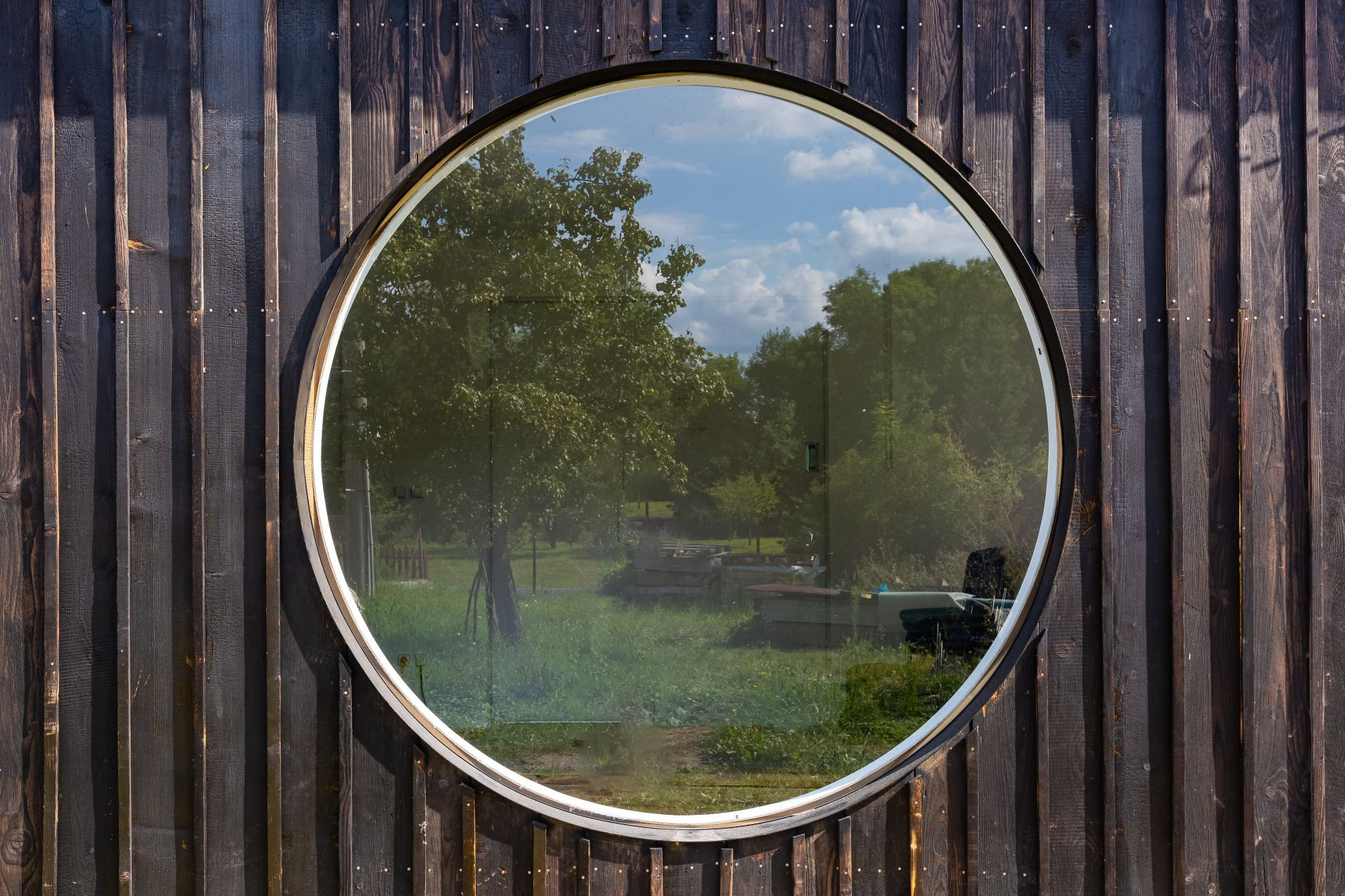 Założenie składa się z dwóch oddzielnych obiektów. Główny budynek mieszkalny oraz odsunięty od niego drugi obiekt, w którym mieści się pracownia i garaż, tworzą pomiędzy sobą kameralny dziedziniec. Ten niewielki dworek porządkuje przestrzeń działki, daje poczucie prywatności i stanowi bufor pomiędzy domem a otaczającym krajobrazem.