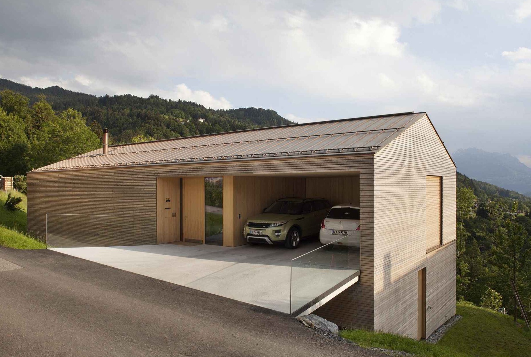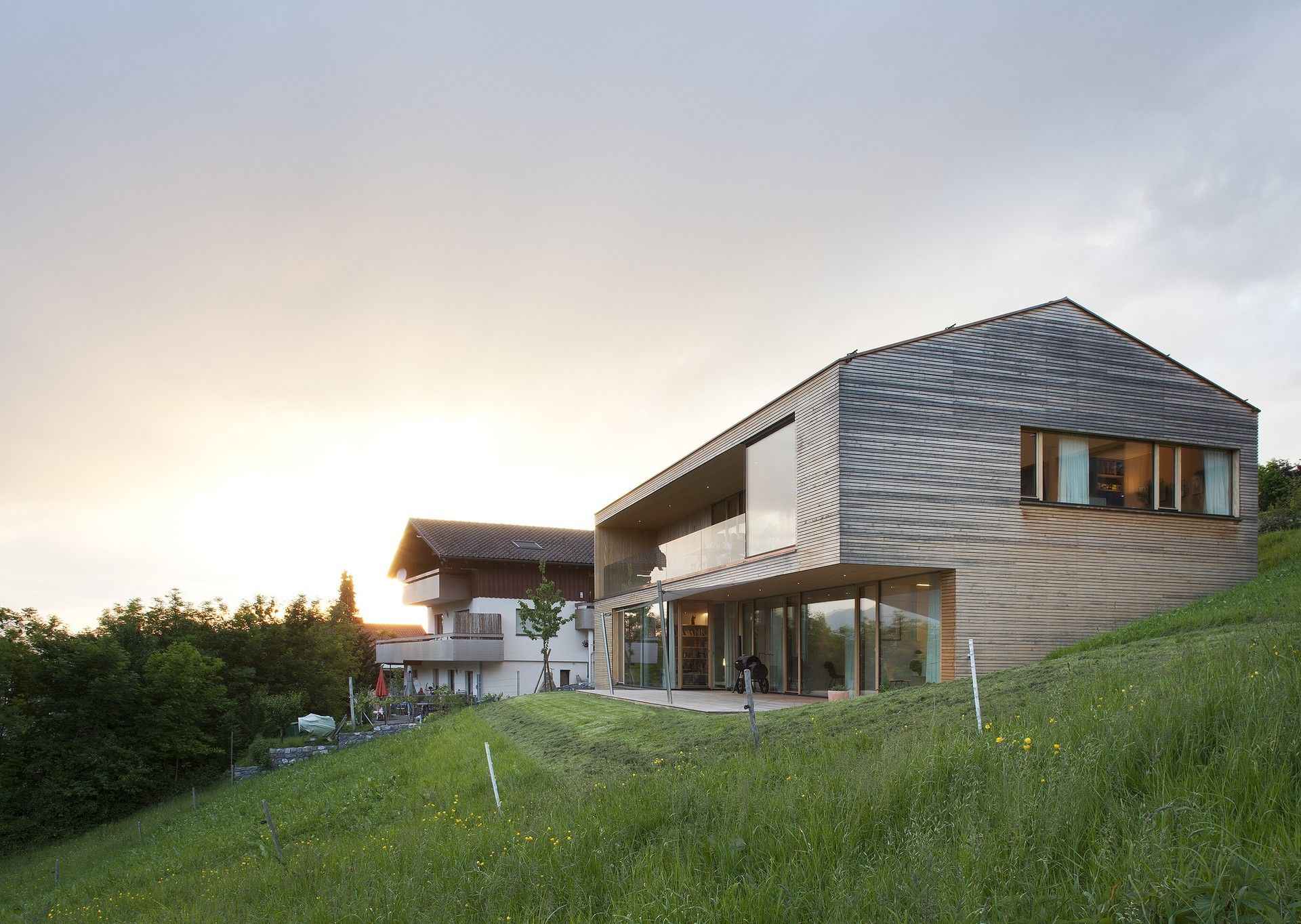 Dla kontrastu, dwupiętrowa fasada południowa domu została w pełni przeszklona i otwiera wnętrza na spektakularne, panoramiczne widoki doliny. Duże przeszklenia zapewniają maksymalny dostęp do światła dziennego oraz bezpośredni kontakt z otaczającą naturą. Balkon i taras zostały zintegrowane z drewnianą konstrukcją budynku, tworząc harmonijną całość z elewacją i krajobrazem. Takie rozwiązania architektoniczne podkreślają nowoczesny charakter domu jednorodzinnego oraz jego silne powiązanie z otoczeniem.