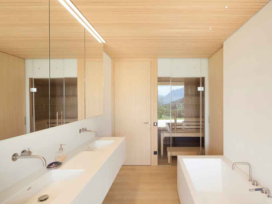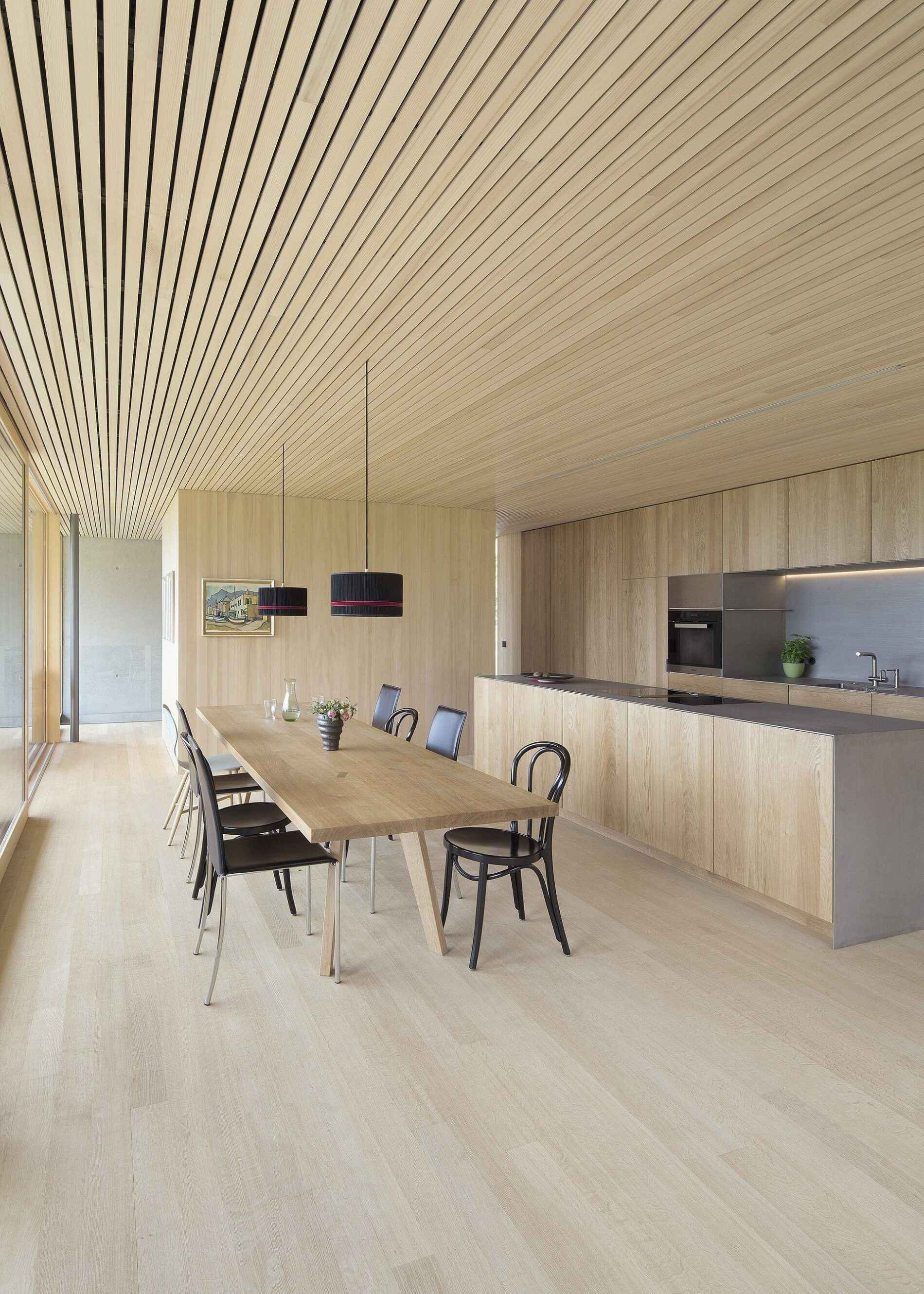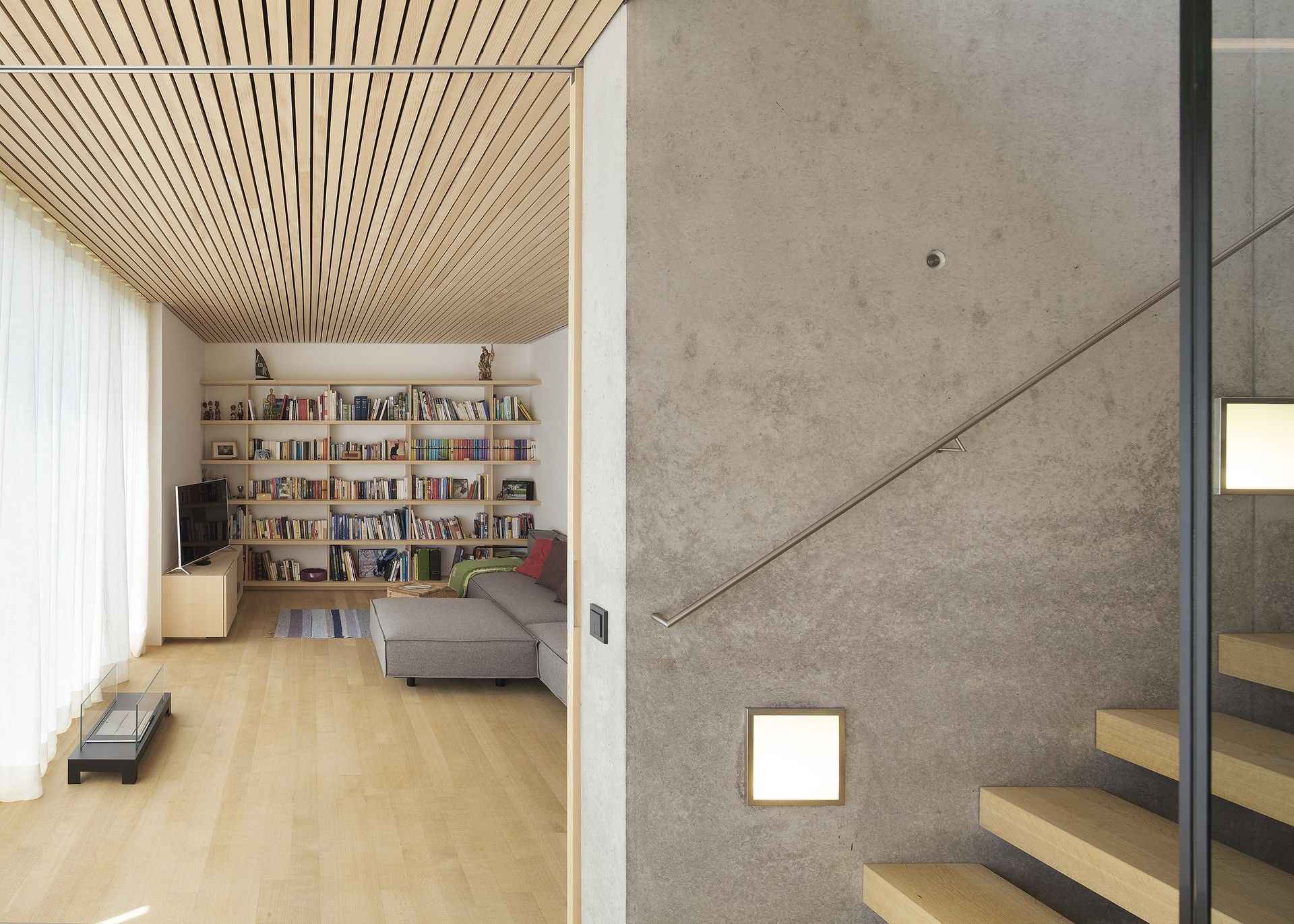 Salon zlokalizowany na piętrze został zaprojektowany jako przestrzeń otwarta, sprzyjająca wspólnemu spędzaniu czasu. Kuchnia w formie wolnostojącego bloku oraz centralnie usytuowany kominek dzielą wnętrze na strefy gotowania, jadalnię, część wypoczynkową oraz bibliotekę. Klatka schodowa, oddzielona surową betonową ścianą, prowadzi na niższy poziom, gdzie znajdują się sypialnie, pokoje gościnne, pomieszczenia użytkowe oraz warsztat umieszczony pod garażem. Układ funkcjonalny domu łączy estetykę z wygodą codziennego użytkowania.