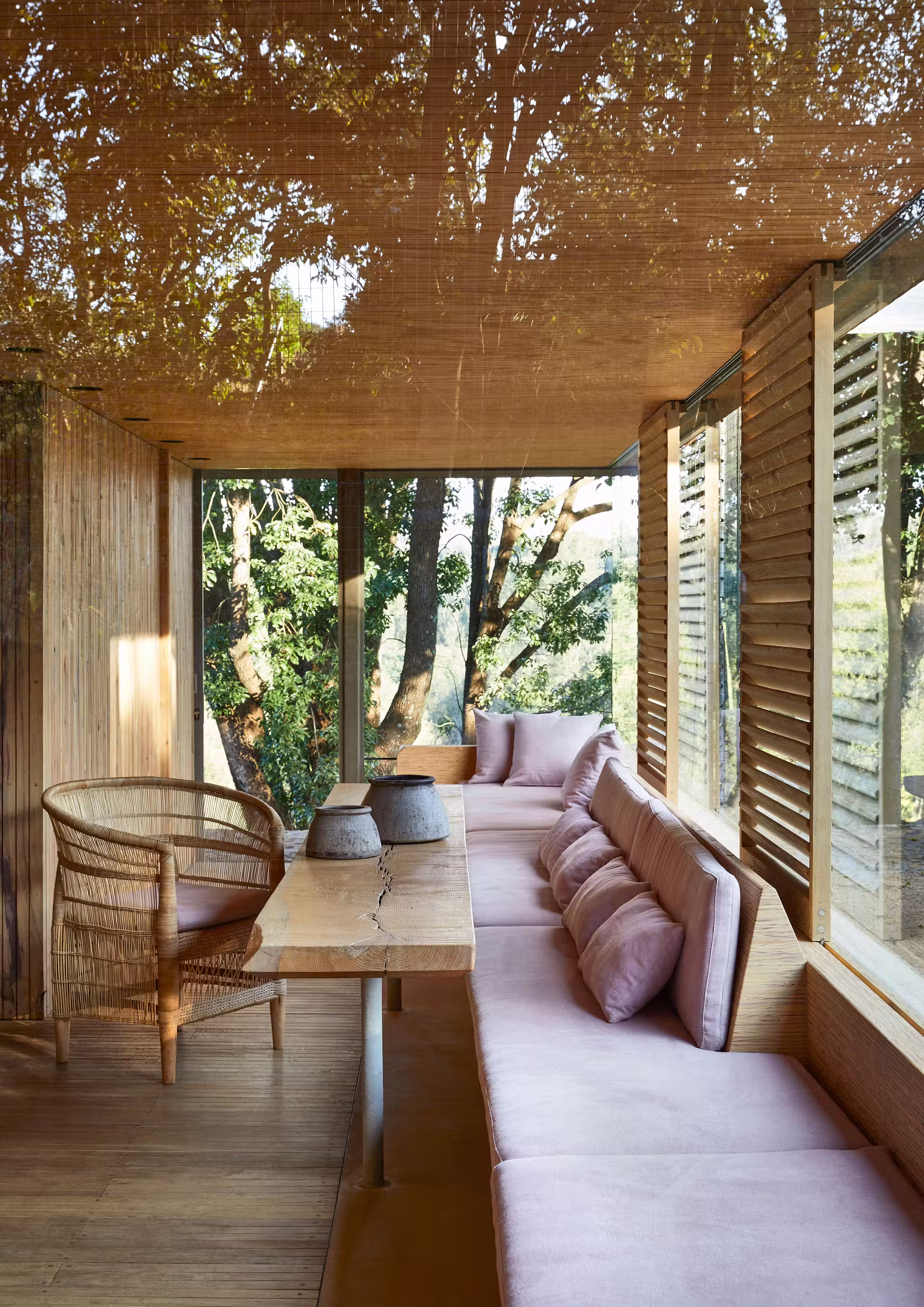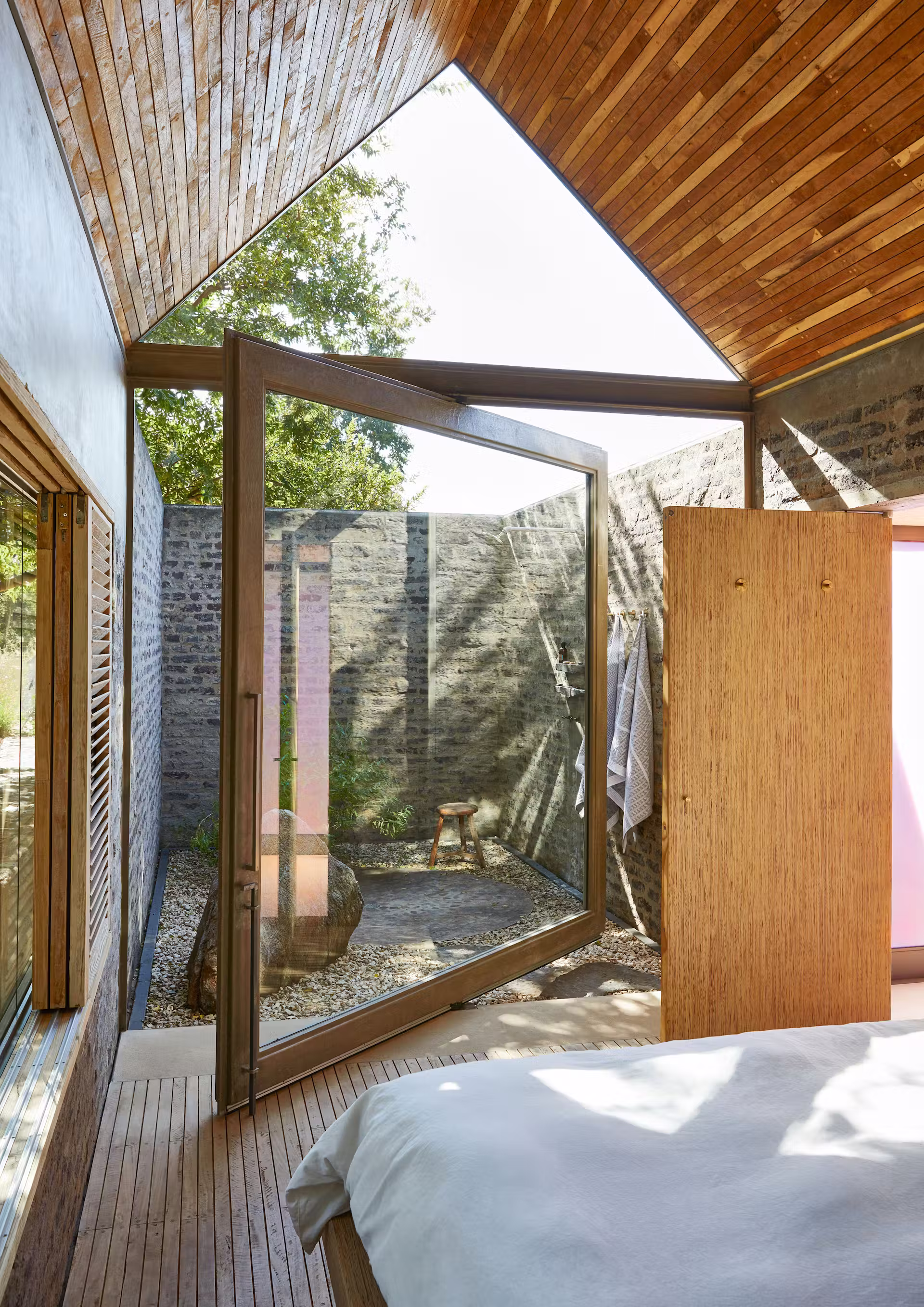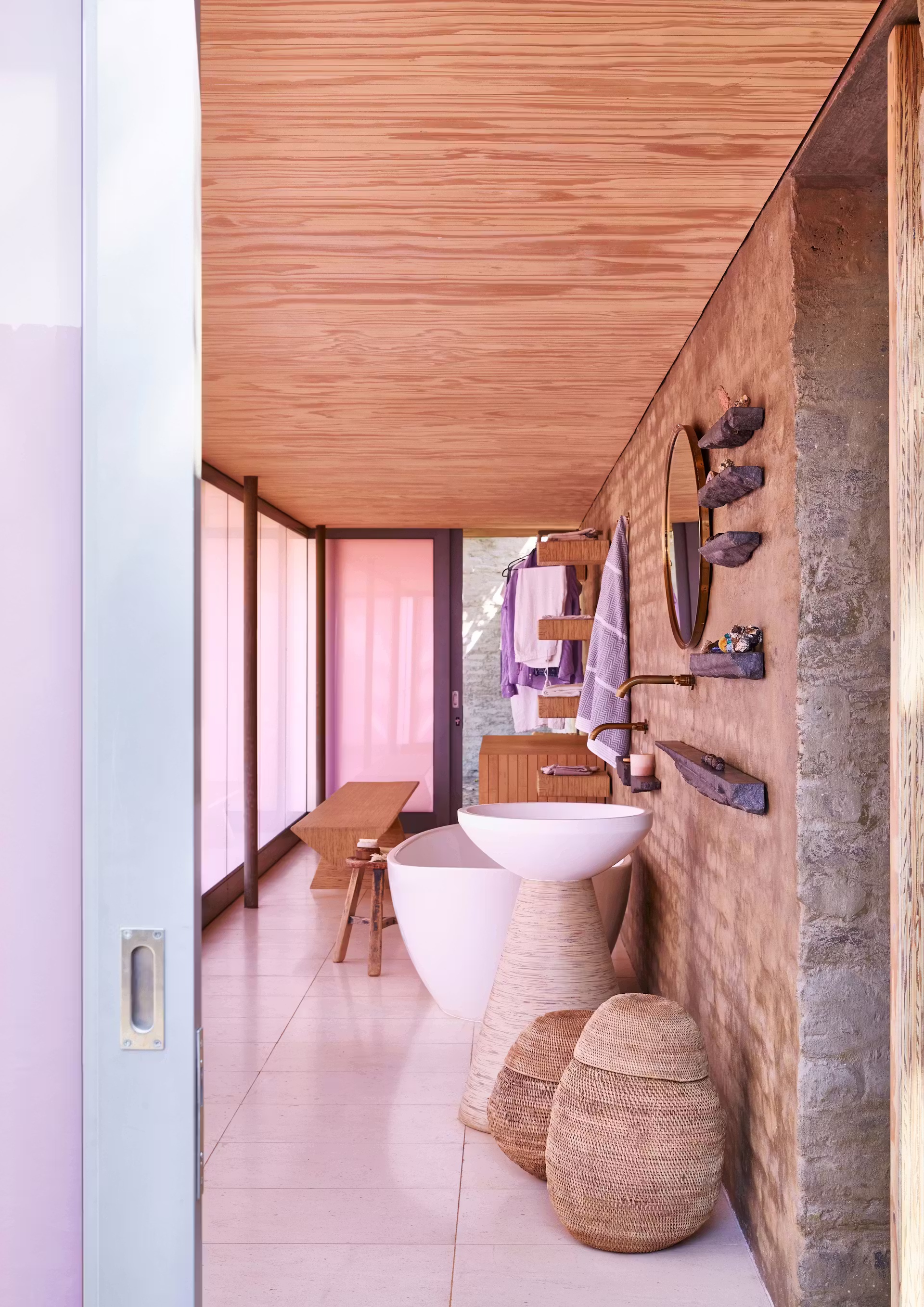 Granica między wnętrzem a zewnętrzem jest tu celowo rozmyta. Sypialnia otwiera się na prywatny dziedziniec z zewnętrznym prysznicem, kuchnia wychodzi bezpośrednio do ogrodu warzywnego, a łazienka osłonięta półprzezroczystymi, różowymi panelami winylowymi łapie barwy wschodu i zachodu słońca. Architektura nie zamyka się w murach – pozwala doświadczać miejsca wszystkimi zmysłami.