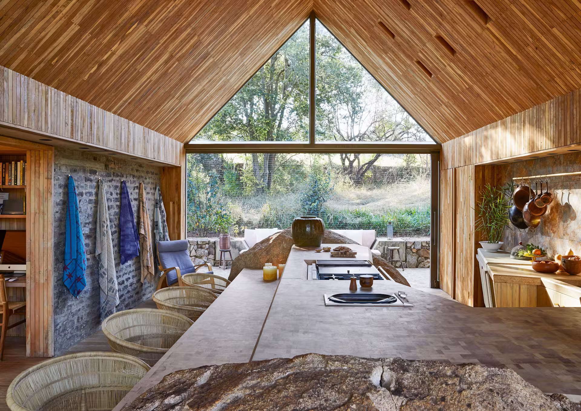 Każdy element domu niesie ze sobą historię. Kamienie wydobyte na miejscu stały się podstawą kuchennej wyspy. Drewno ze zwalonych drzew – eukaliptusa i dębu – po roku sezonowania posłużyło jako podłogi, okładziny ścian i sufitów, a nawet blaty. Stare cegły oczyszczono i użyto ponownie w murach. Dach, pierwotnie pełen ubytków, naprawiono i zaizolowano lekkim betonem, który pozwolił zachować jego strukturę i nadać jej nową funkcję.