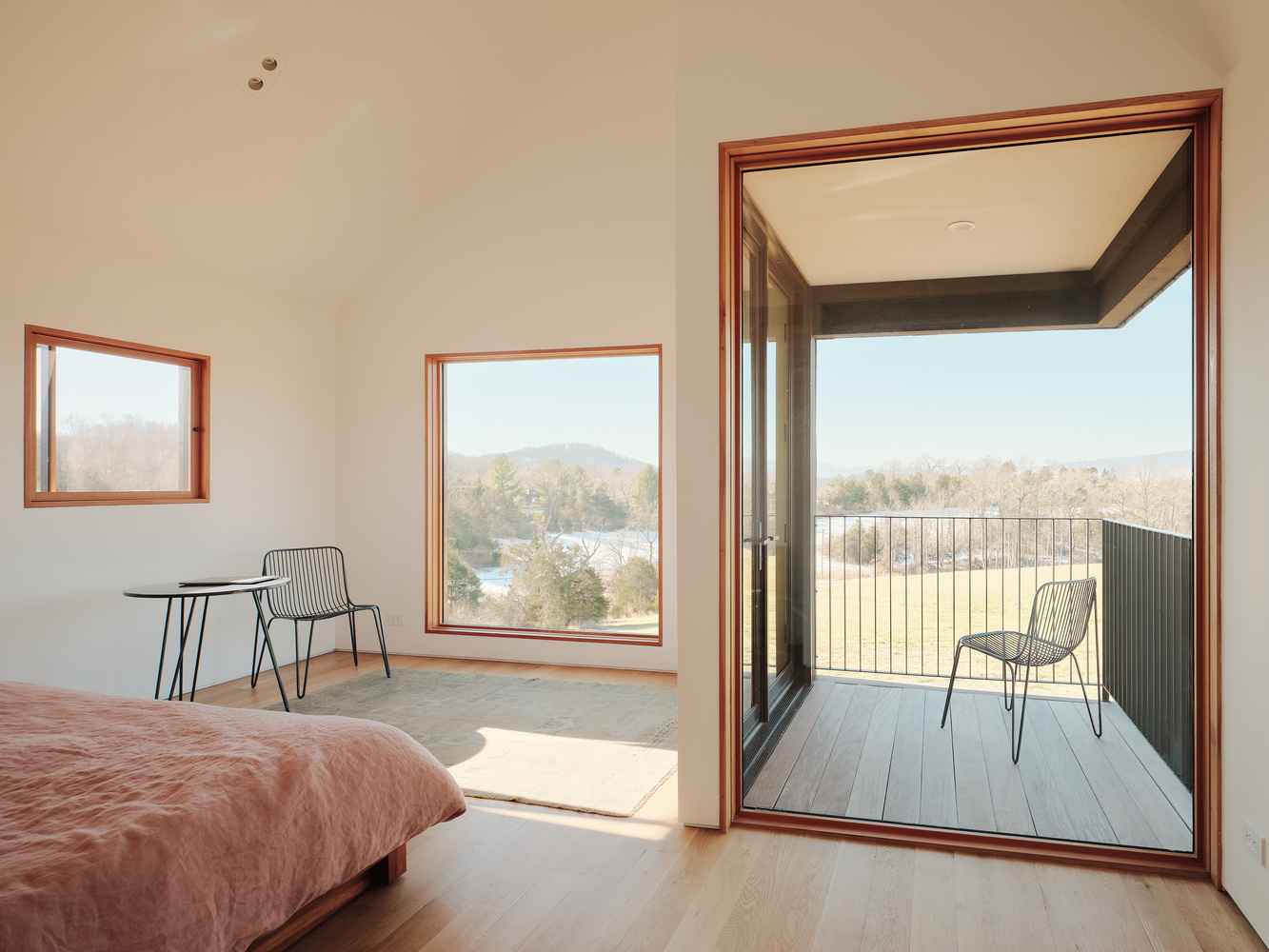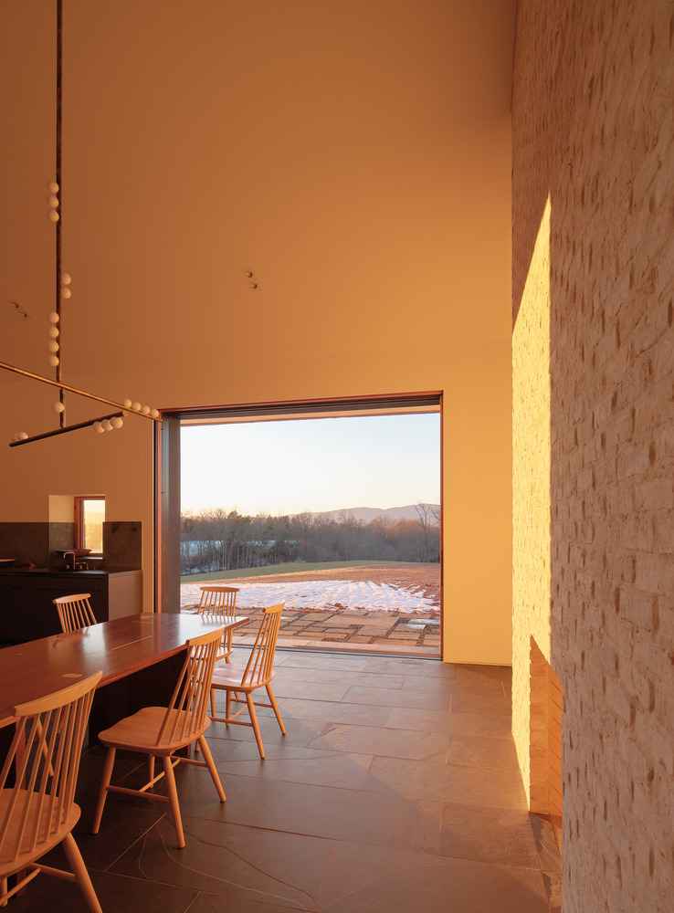 Materiały użyte w projekcie zostały dobrane tak, by z czasem nabrały szlachetnej patyny i wtopiły się w naturalne otoczenie, nawiązując do dawnych kolonialnych zabudowań. Surowe, nieotynkowane ceglane ściany definiują dynamikę bryły i selektywnie odsłaniają widoki, podczas gdy część sypialna została wykończona drewnem cedrowym – tradycyjnym materiałem stosowanym w wiejskich domach i stodołach w regionie Charlottesville. Całość uzupełniają miedziane dachy inspirowane Monticello Thomasa Jeffersona, montowane w sposób tworzący wyraziste, ostre krawędzie. Z czasem pokryją się naturalną patyną, podkreślając upływ czasu i związek domu z otoczeniem.