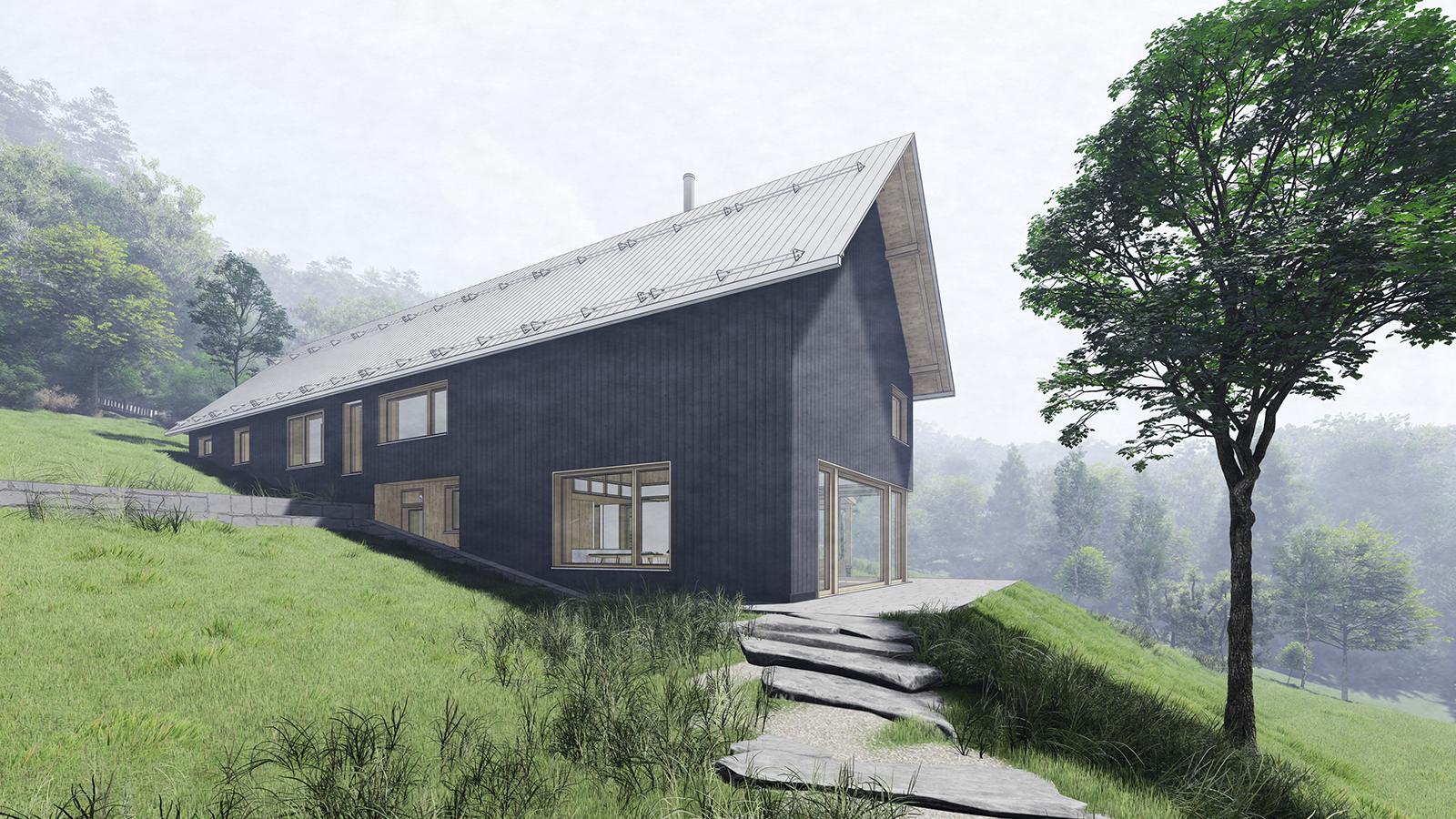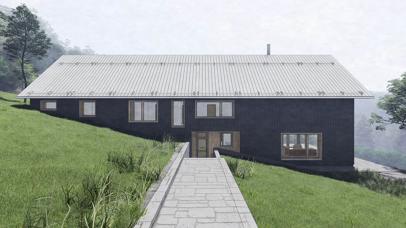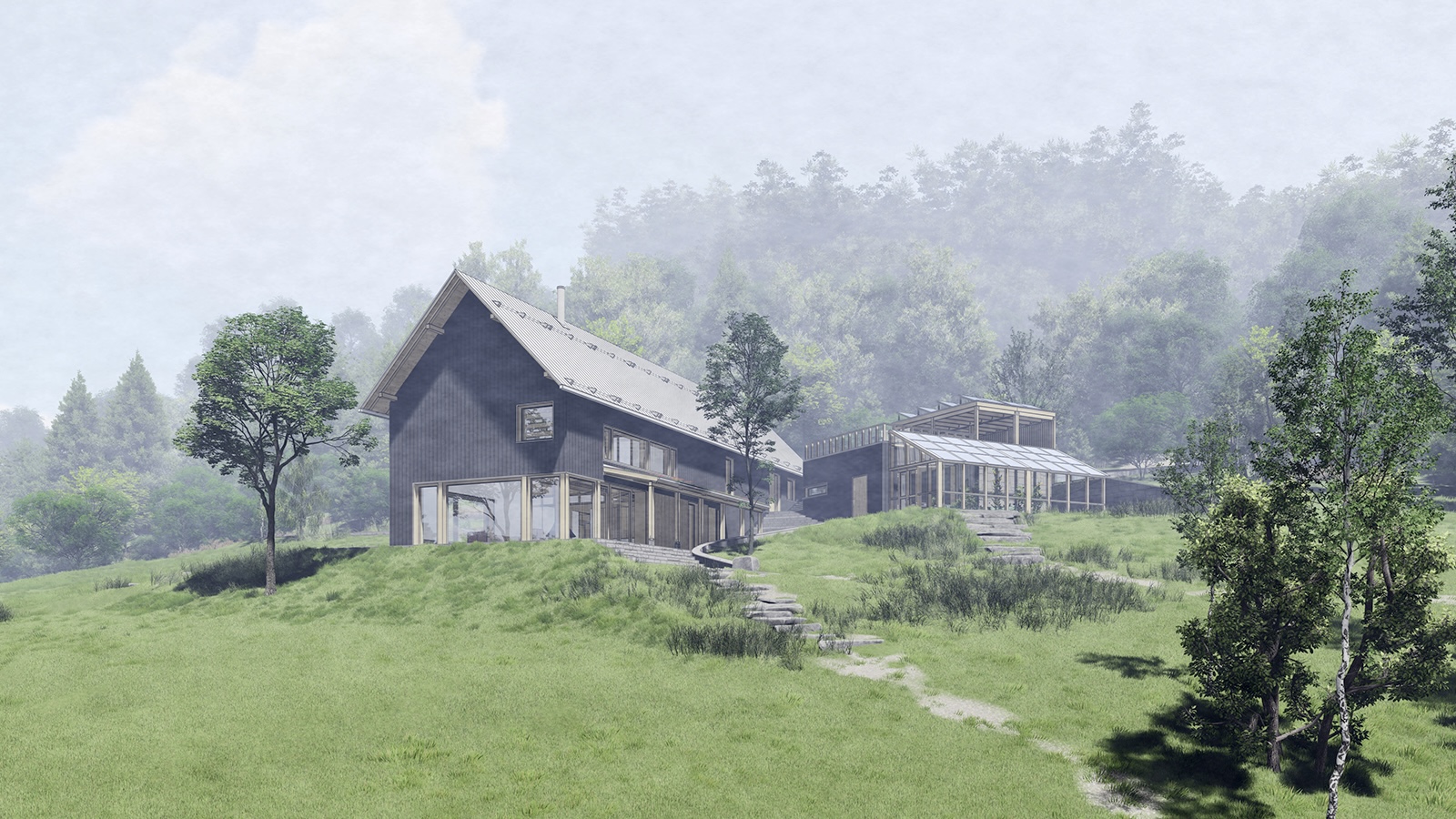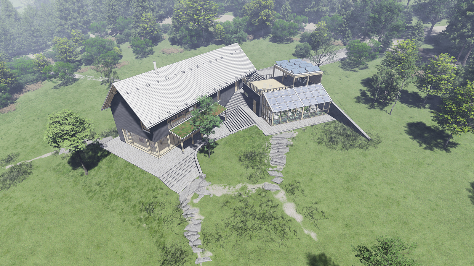Nowoczesna stodoła płynnie łączy się z krajobrazem dzięki systemowi schodów i tarasów wykonanych z lokalnego kamienia, prowadzących do samowystarczalnego warsztatu. Budynek gospodarczy ogrzewany jest pasywnie przez szklarnię akumulującą ciepło w masywnych ścianach i podłodze, a jego płaski dach pełni funkcję tarasu. Przy wjeździe na posesję znajduje się wiata garażowa z panelami fotowoltaicznymi zorientowanymi na południe.