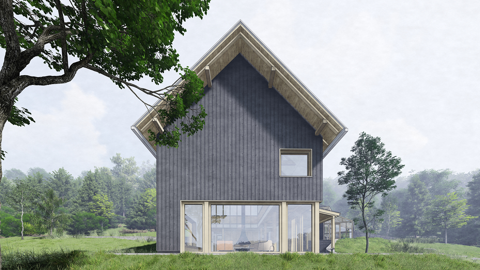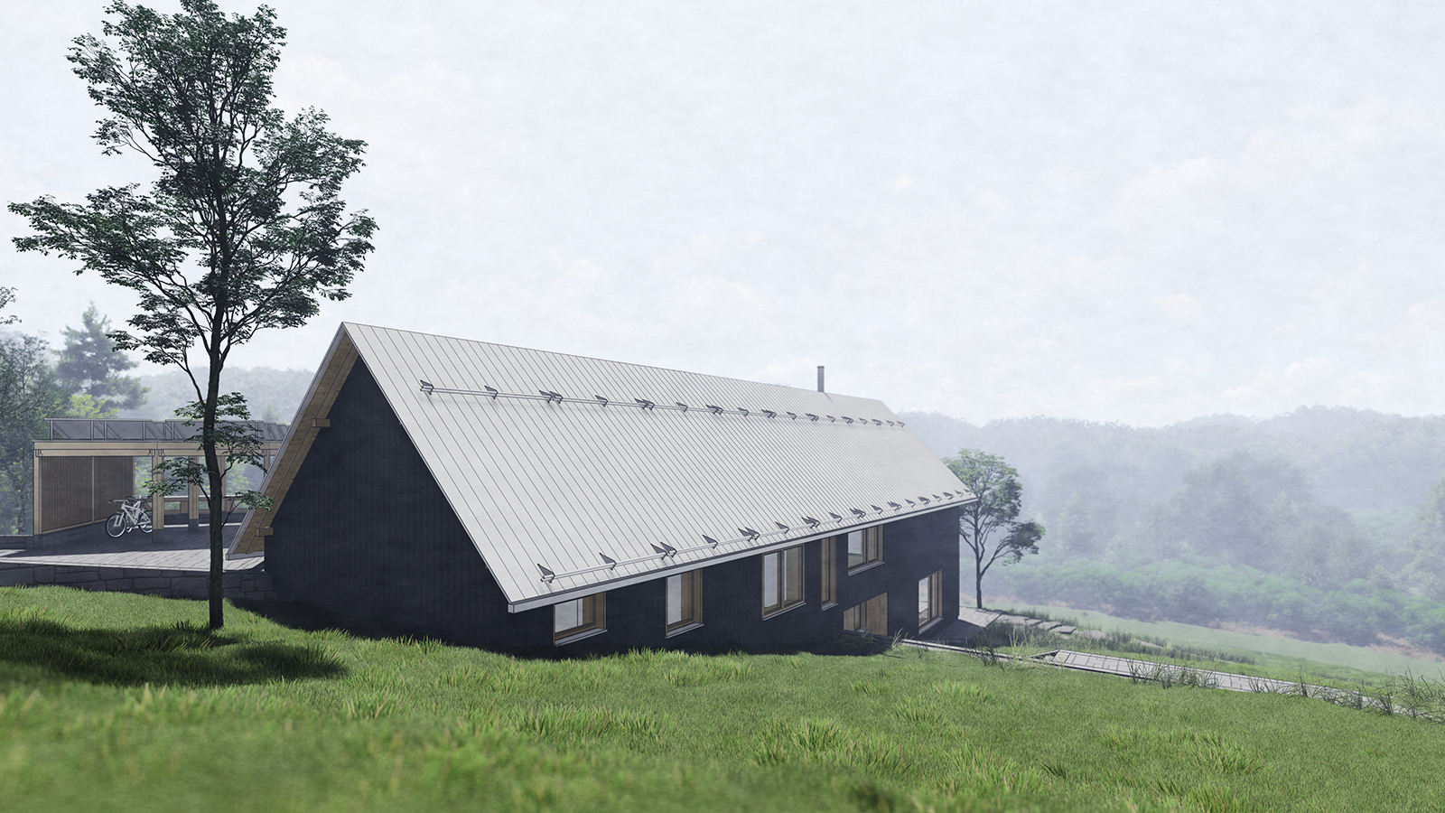 Dom zatopiony w południowym stoku wzgórza oferuje zapierający dech w piersiach widok na lśniące w oddali wody zbiornika elektrowni Żar. Kontrast pomiędzy jasnym dachem i detalami a surową, czarną bryłą budynku podkreśla jego dynamiczny charakter na tle ciemnego lasu.