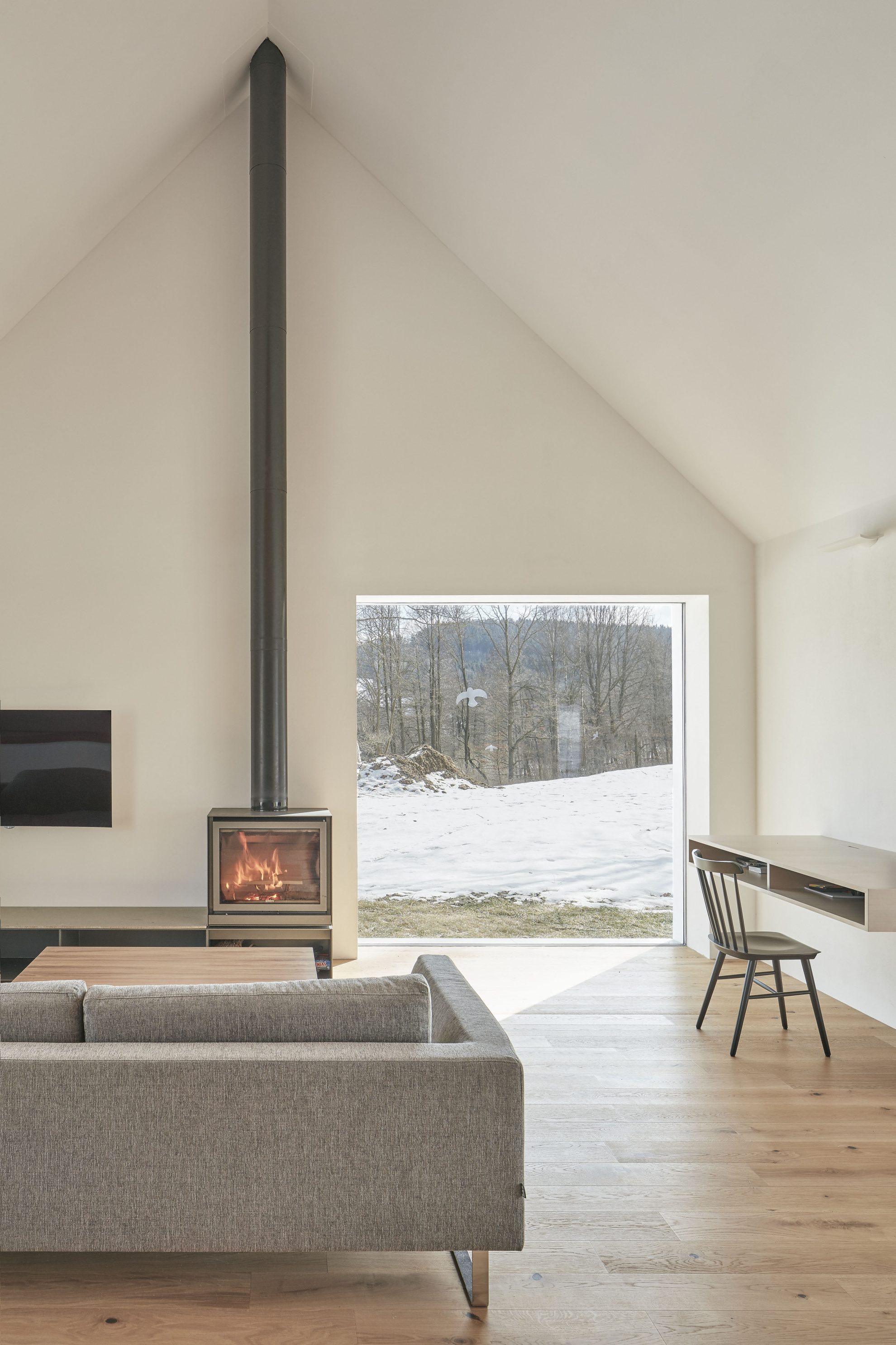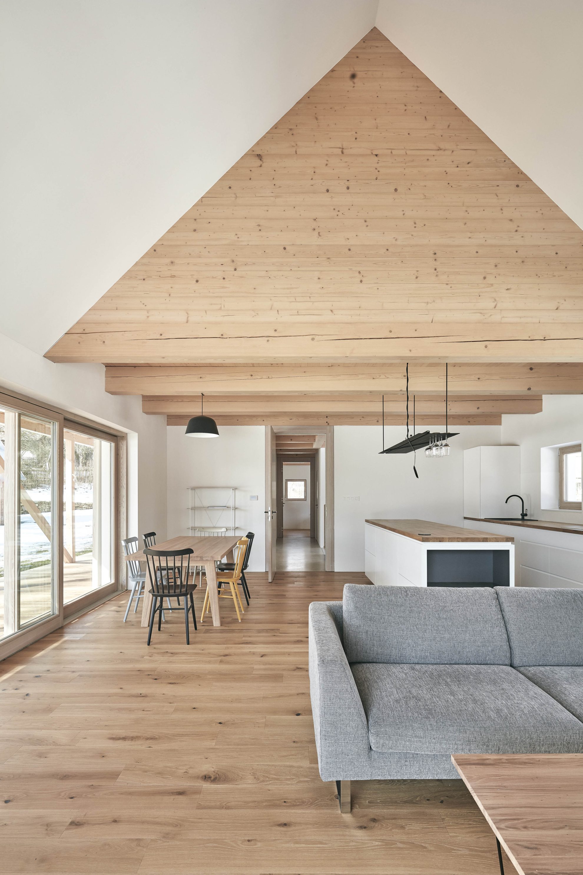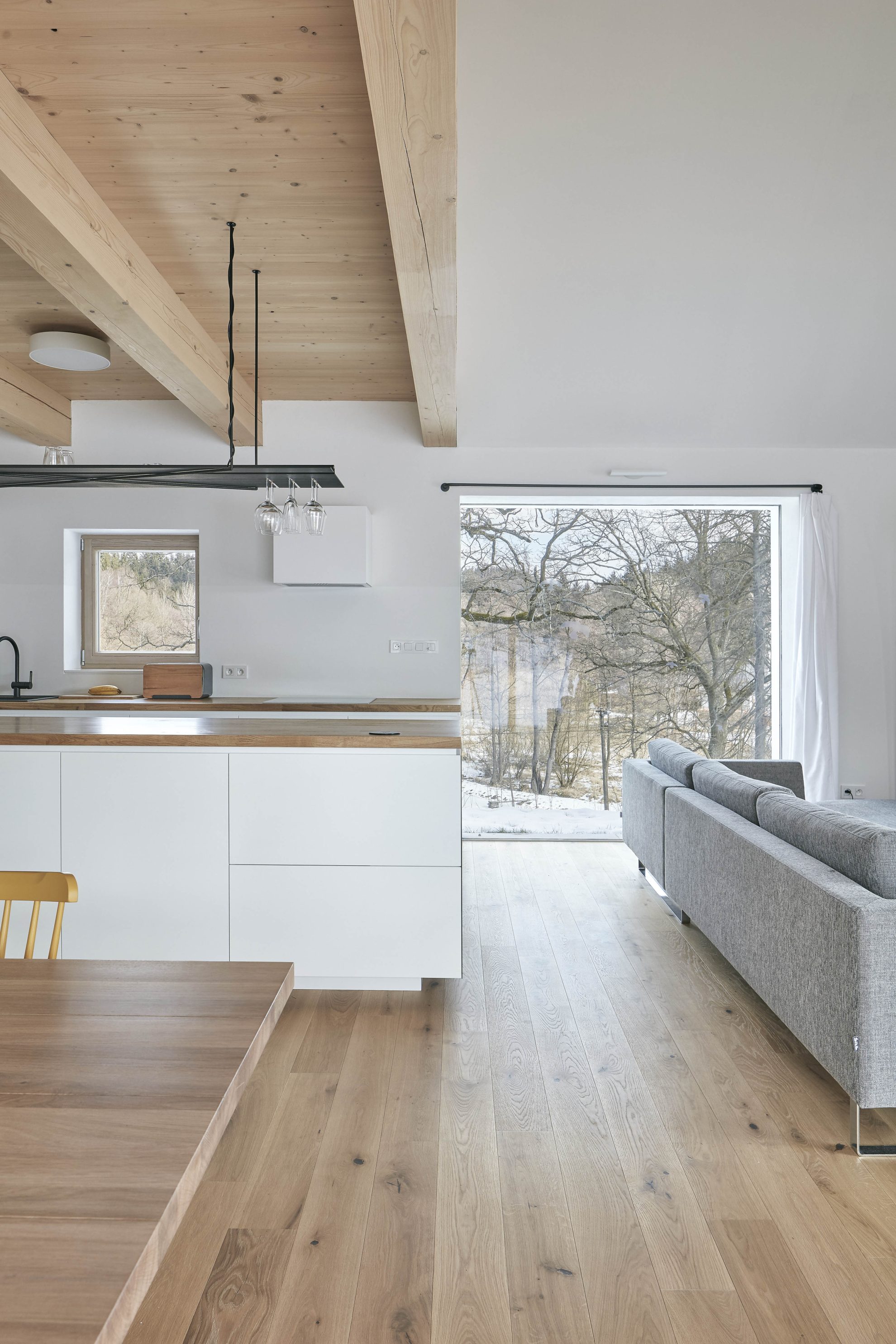 Piwnica mieści pomieszczenia techniczne z kotłami na pelety oraz sklepione pomieszczenie zaprojektowane przez właściciela. Obok domu znajduje się skromniejszy budynek gospodarczy pełniący funkcję garażu i magazynu. W całym obiekcie, zarówno wewnątrz, jak i na zewnątrz, zastosowano połączenie białego tynku z drewnem modrzewiowym i dębowym, tworząc harmonijną, stonowaną estetykę, która nie konkuruje z pięknem otaczającego krajobrazu.
