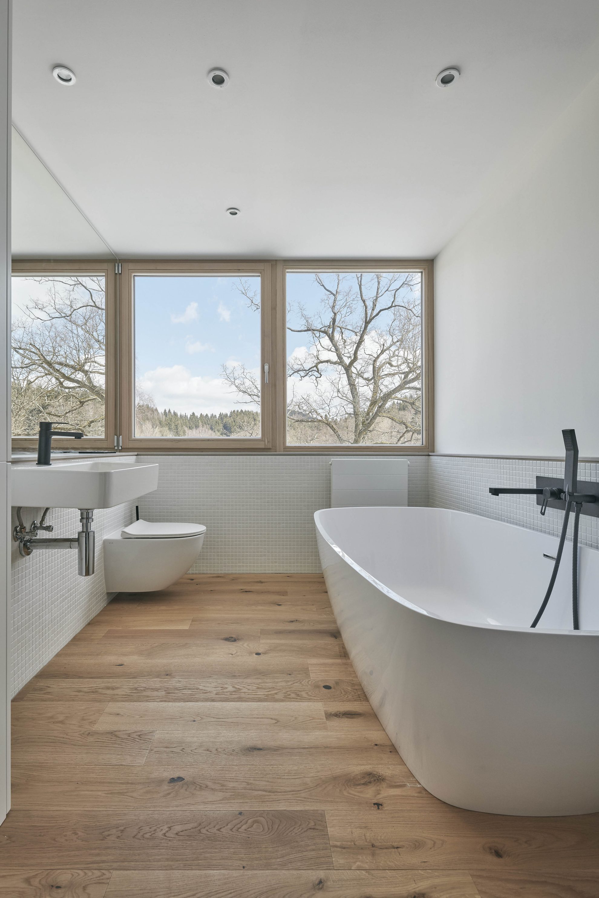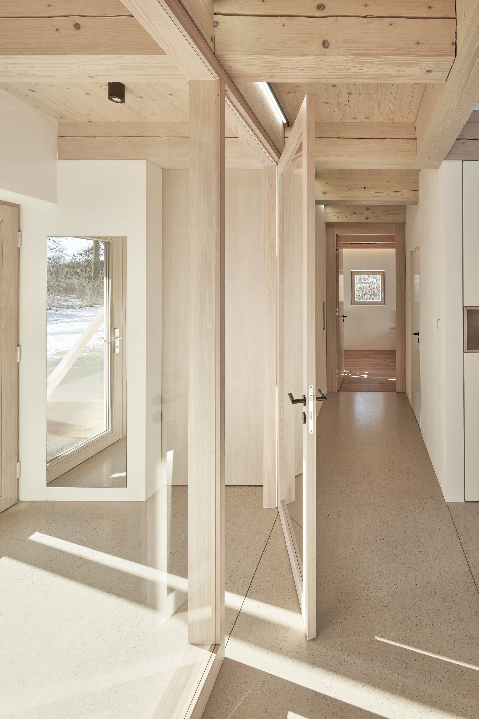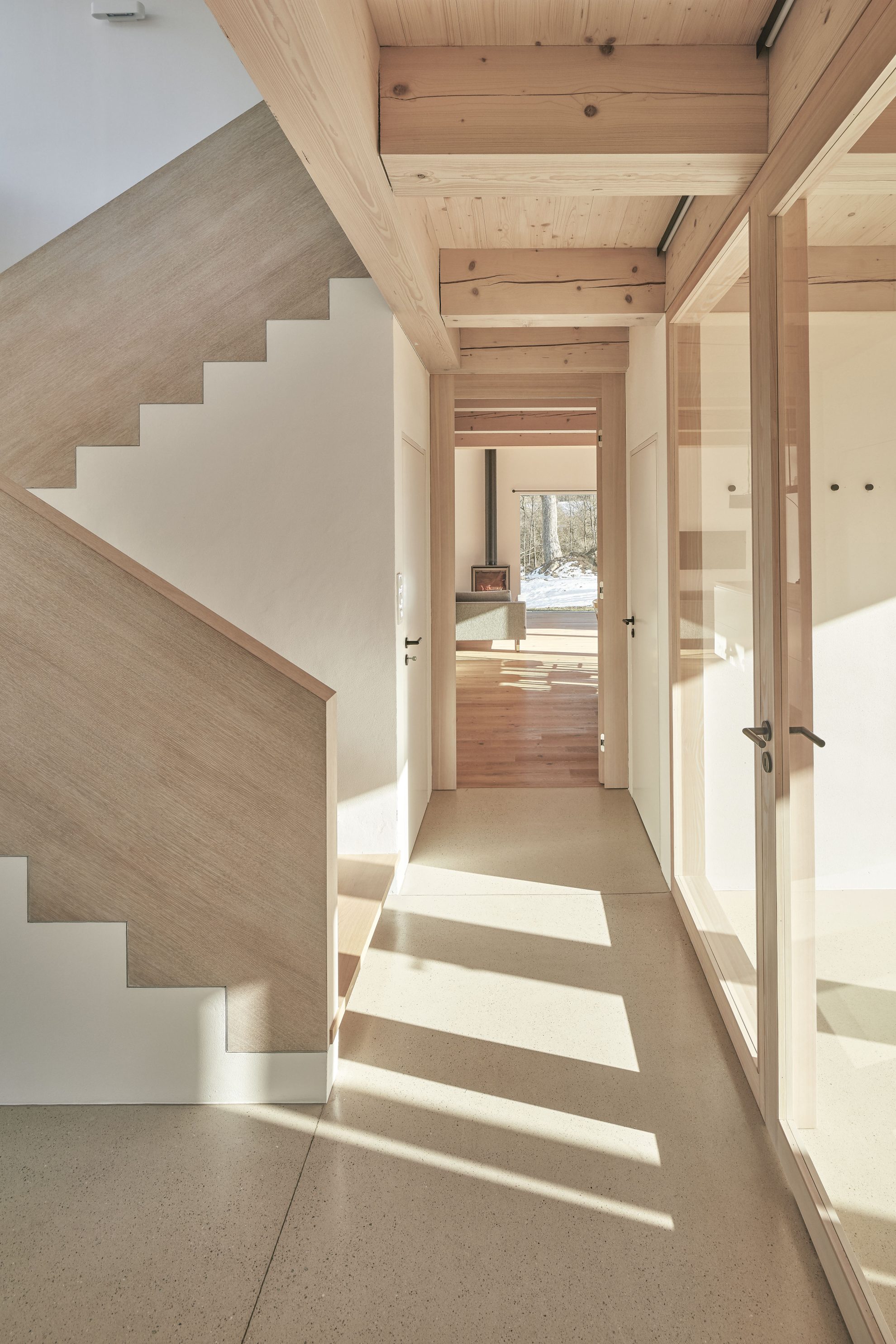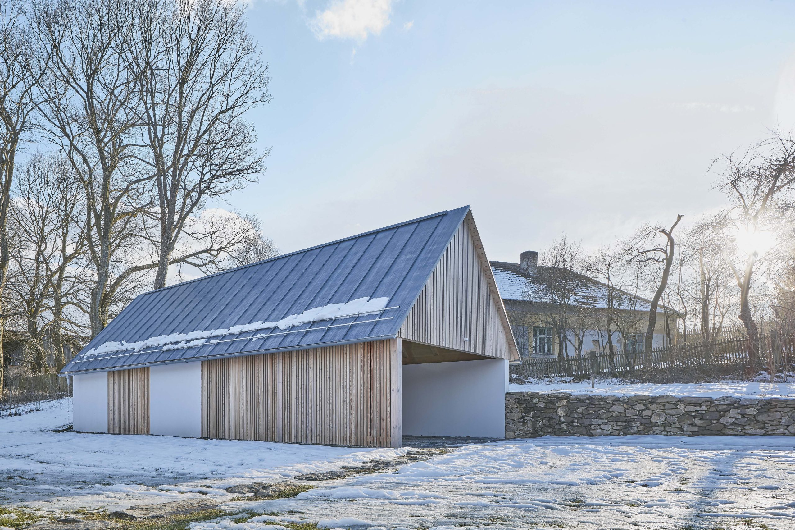 Piwnica mieści pomieszczenia techniczne z kotłami na pelety oraz sklepione pomieszczenie zaprojektowane przez właściciela. Obok domu znajduje się skromniejszy budynek gospodarczy pełniący funkcję garażu i magazynu. W całym obiekcie, zarówno wewnątrz, jak i na zewnątrz, zastosowano połączenie białego tynku z drewnem modrzewiowym i dębowym, tworząc harmonijną, stonowaną estetykę, która nie konkuruje z pięknem otaczającego krajobrazu.