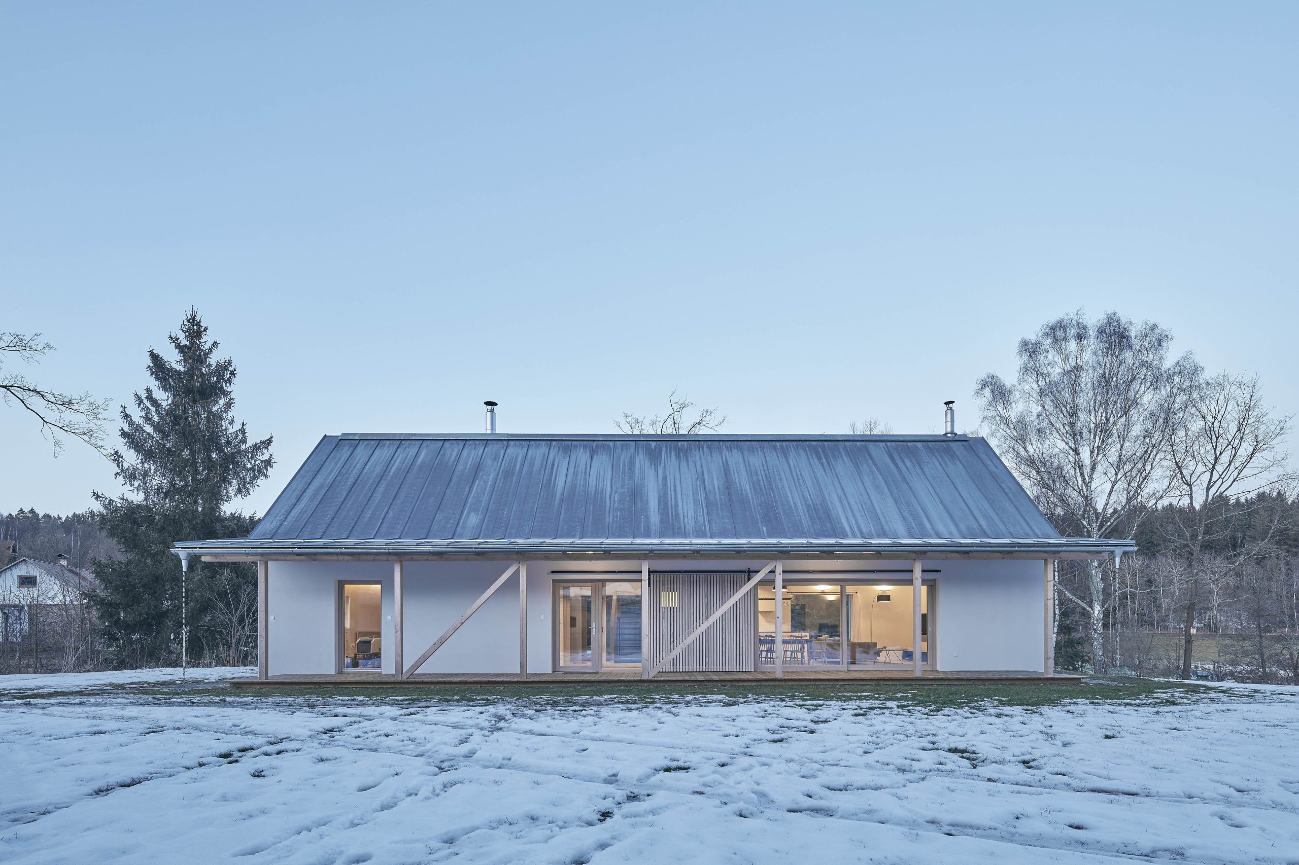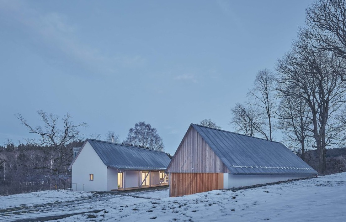 Dom ze stodołą został zaprojektowany na wzór dawnej zagrody w malowniczej wsi Staré Bříště na Wysoczynie. Zabudowania położone są na skraju skarpy, z której rozpościera się widok na stawy i okoliczny krajobraz. Konstrukcję zrealizował lokalny rzemieślnik, korzystając z prostej dokumentacji projektowej. Mur ceramiczny bez dodatkowego ocieplenia został pokryty ręcznie nakładanym tynkiem sztukatorskim, nadającym fasadzie unikalny charakter. Okna w ramach z drewna modrzewiowego harmonizują z naturalnym otoczeniem, a drewniana kratownica została zabezpieczona blachą tytanowo-cynkową.
