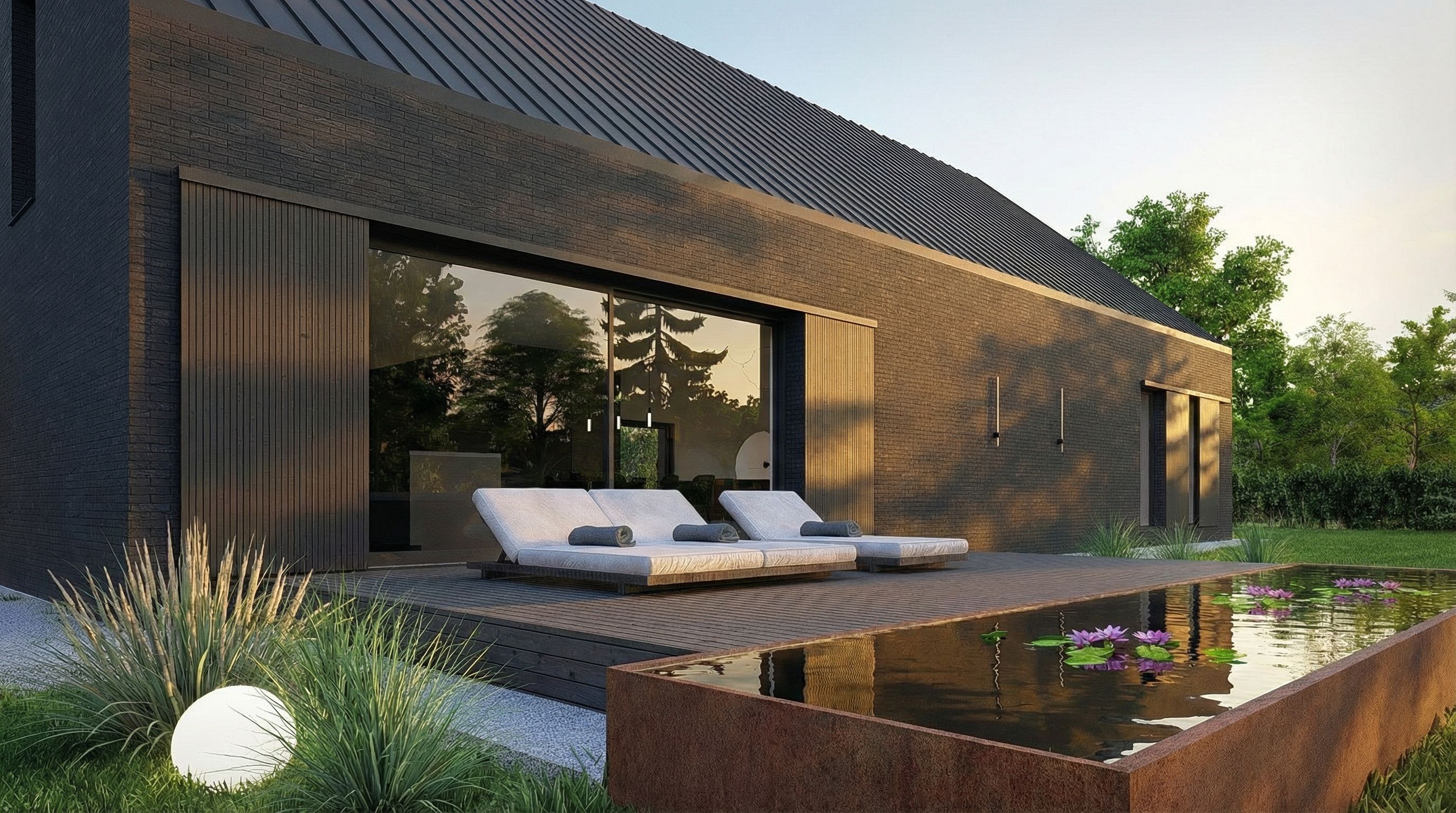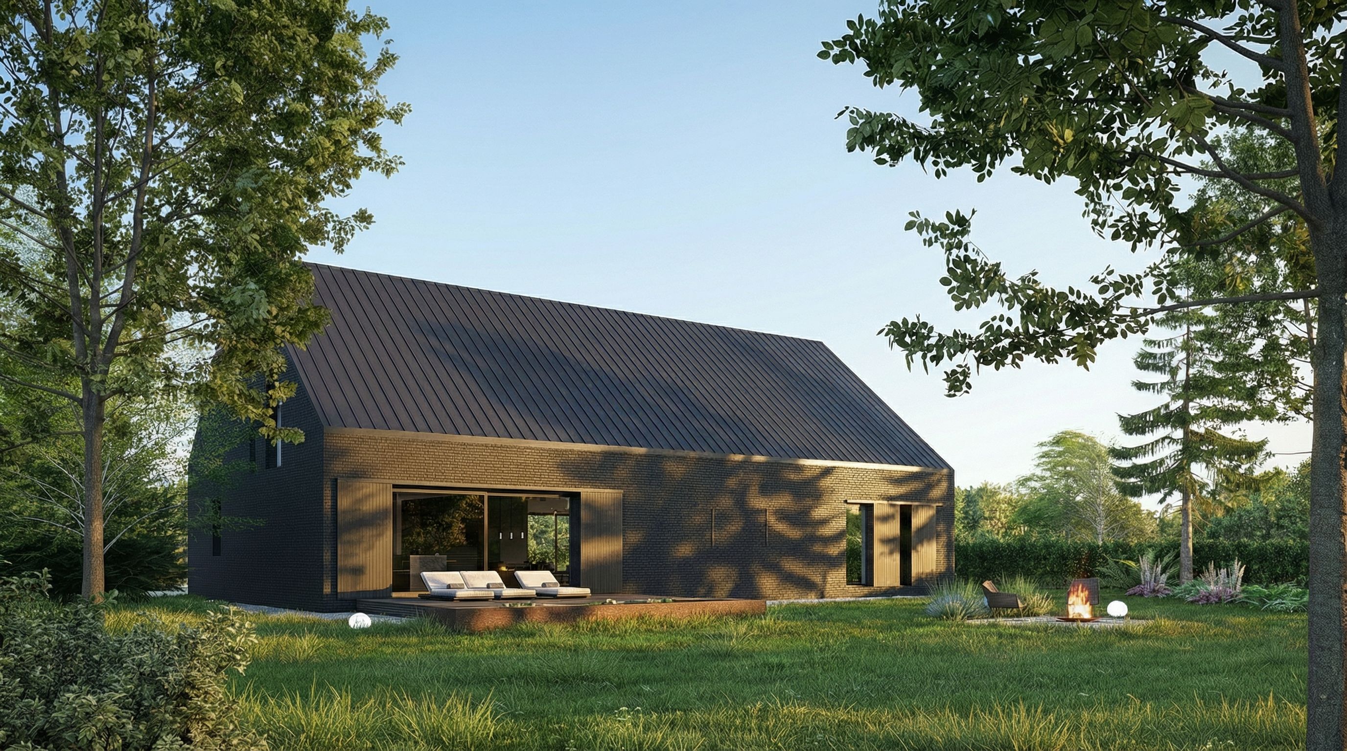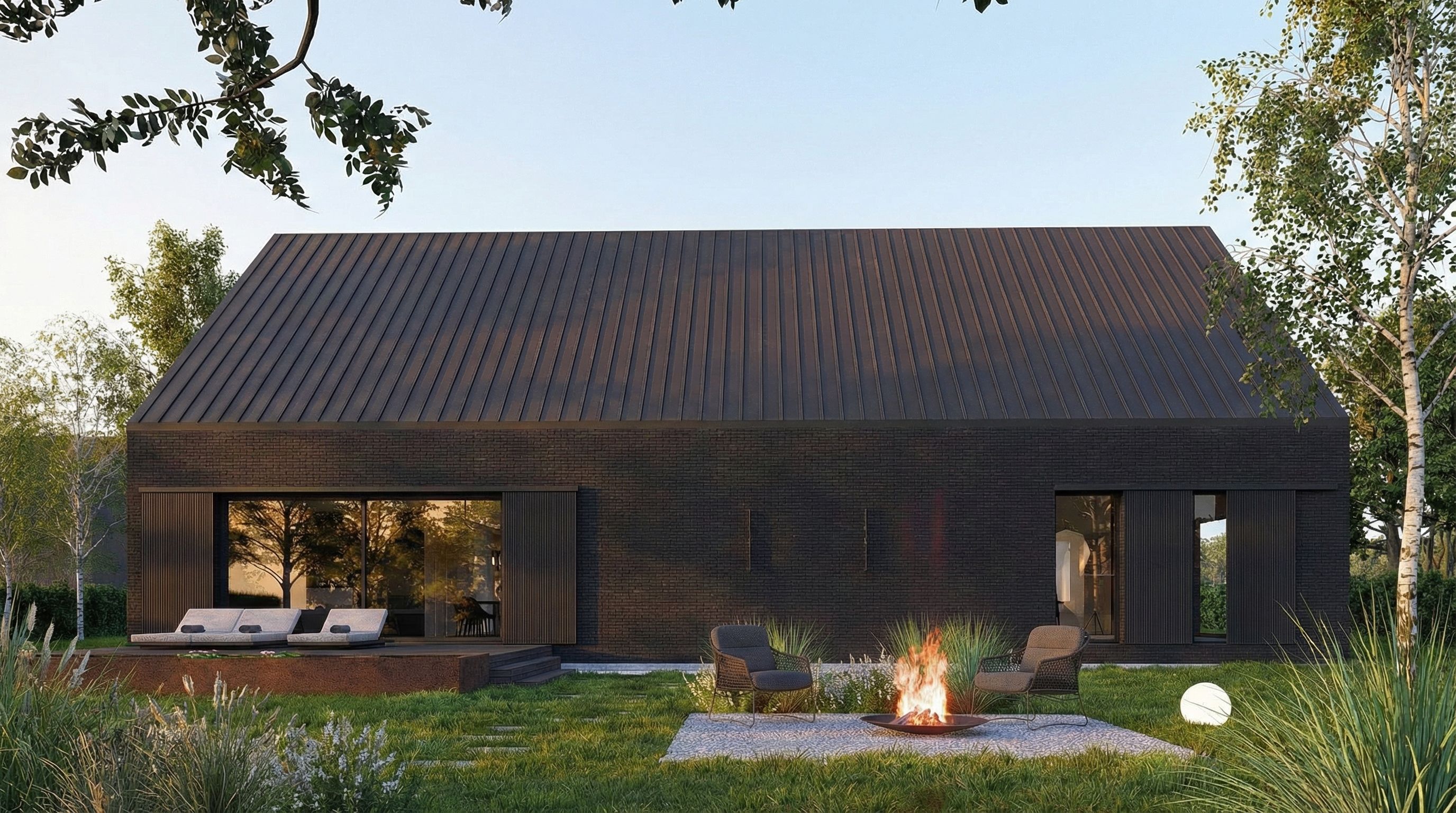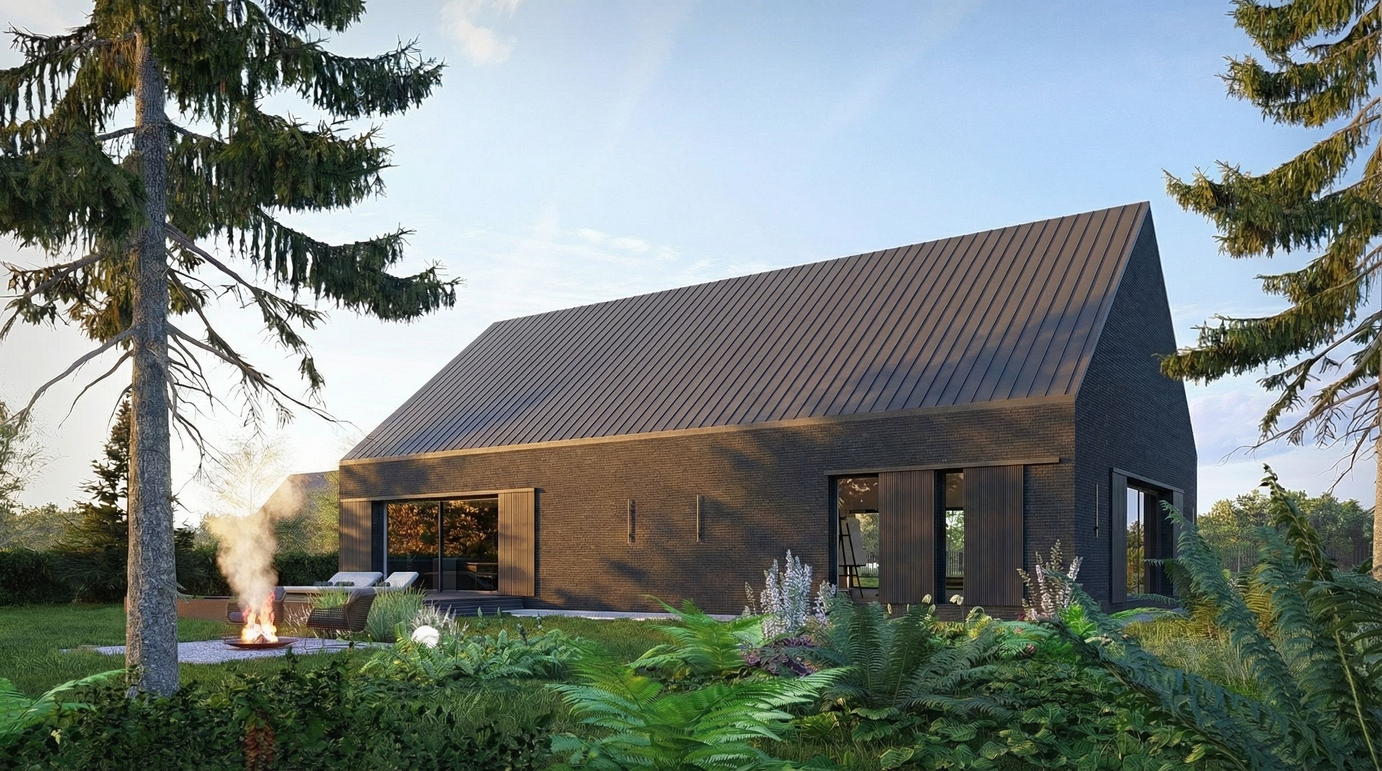 Postawiliśmy w tym projekcie na monolityczną bryłę wykończoną ciemnoszarą płytką ceramiczną. Dach wykończony jest blachą aluminiową w rąbek stojący. Ważnym elementem są również przesuwne okiennice wykonane z opalanego drewna- mają zapewnić bezpieczeństwo, pozwolić na zaciemnienie pomieszczeń w razie potrzeby, ale też komponować się z ceglaną elewacją. To materiały które dobrze zniosą próbę czasu i będą harmonijnym tłem dla otaczającej budynek zieleni.