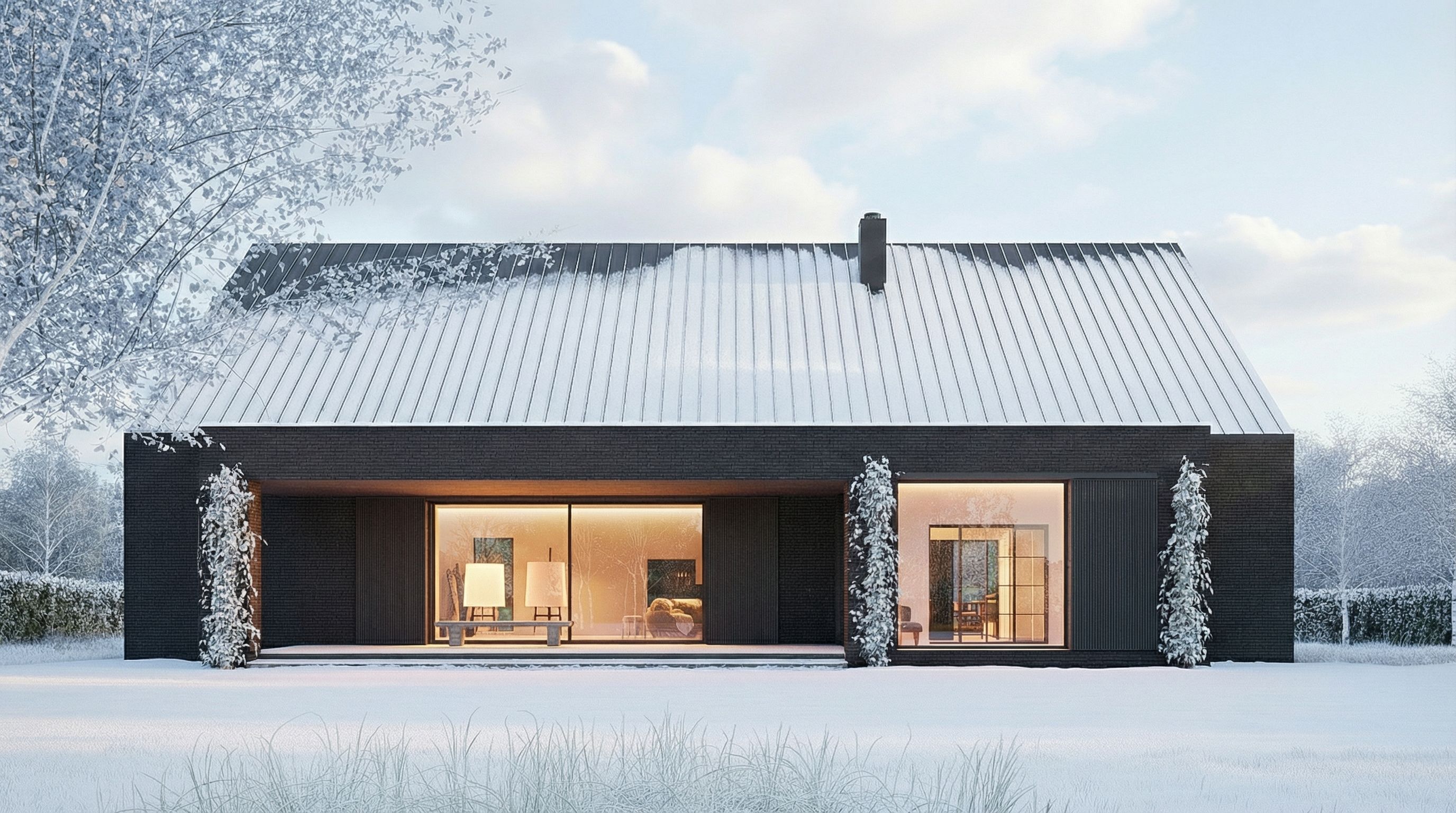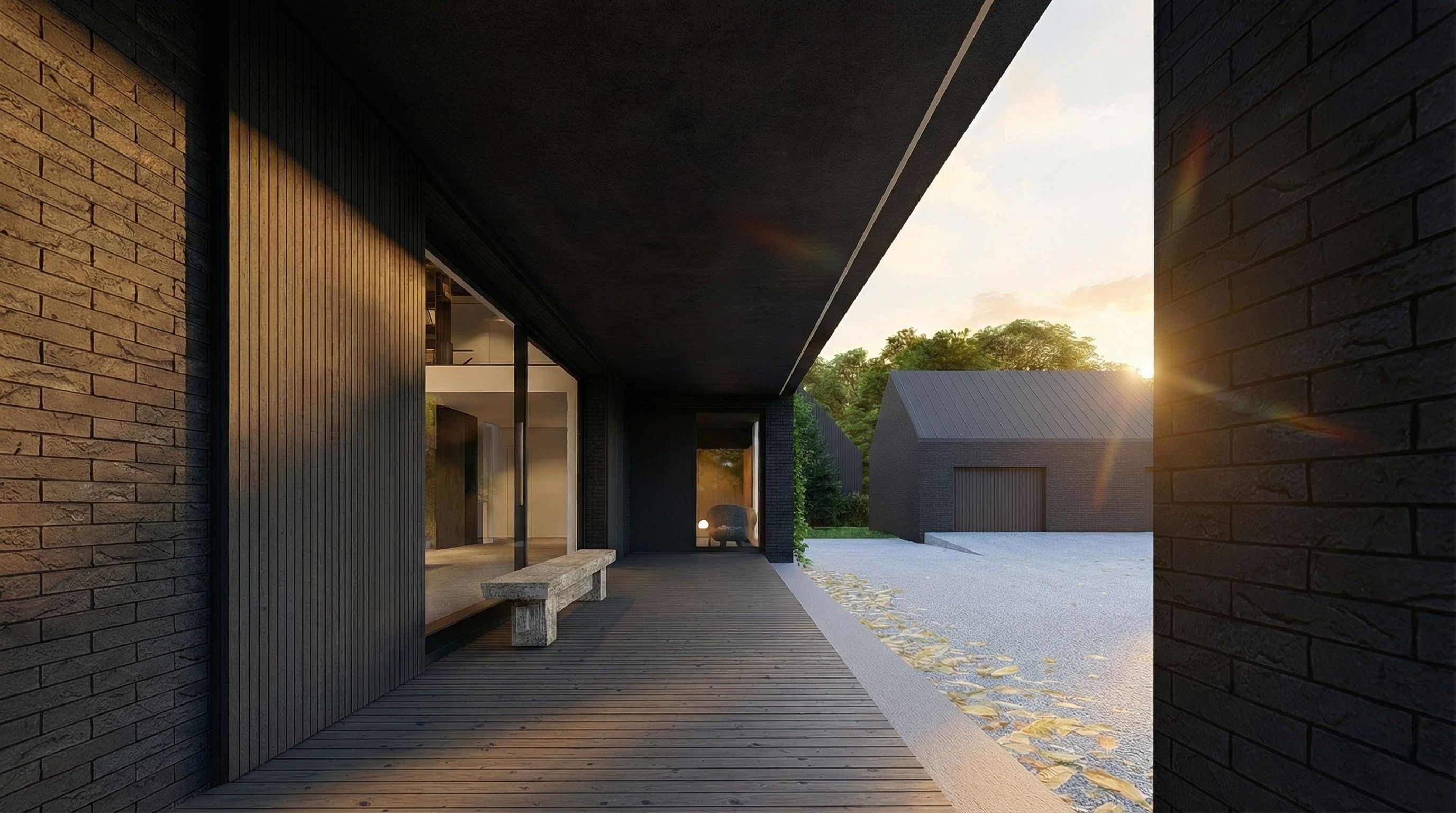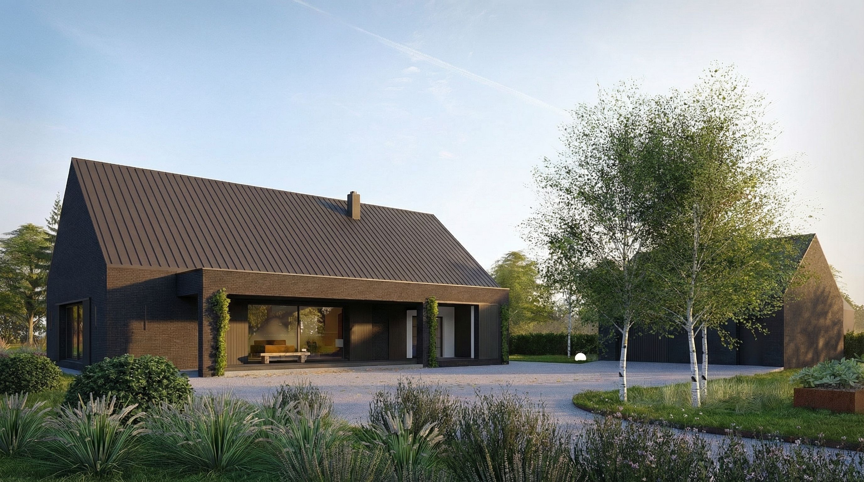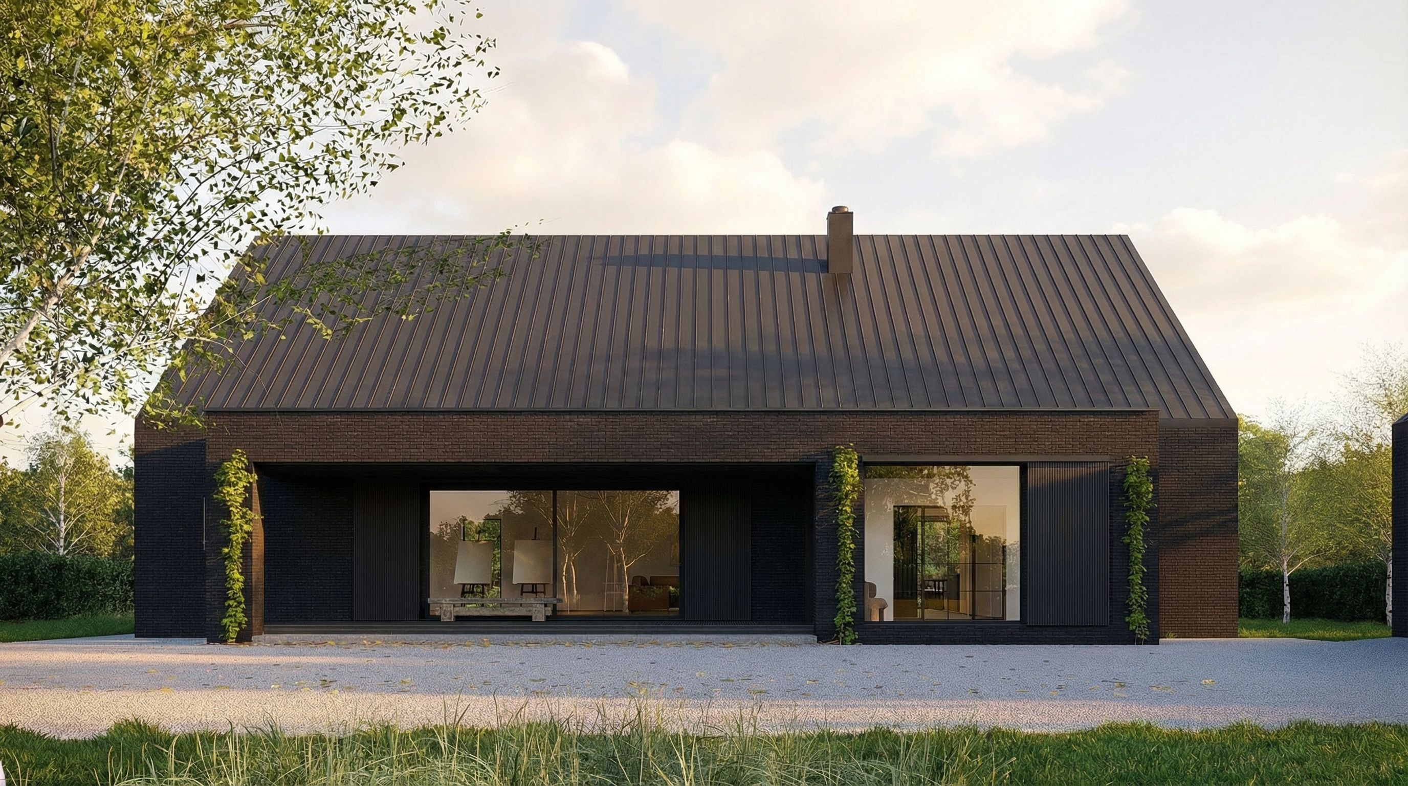 Postawiliśmy w tym projekcie na monolityczną bryłę wykończoną ciemnoszarą płytką ceramiczną. Dach wykończony jest blachą aluminiową w rąbek stojący. Ważnym elementem są również przesuwne okiennice wykonane z opalanego drewna- mają zapewnić bezpieczeństwo, pozwolić na zaciemnienie pomieszczeń w razie potrzeby, ale też komponować się z ceglaną elewacją. To materiały które dobrze zniosą próbę czasu i będą harmonijnym tłem dla otaczającej budynek zieleni.