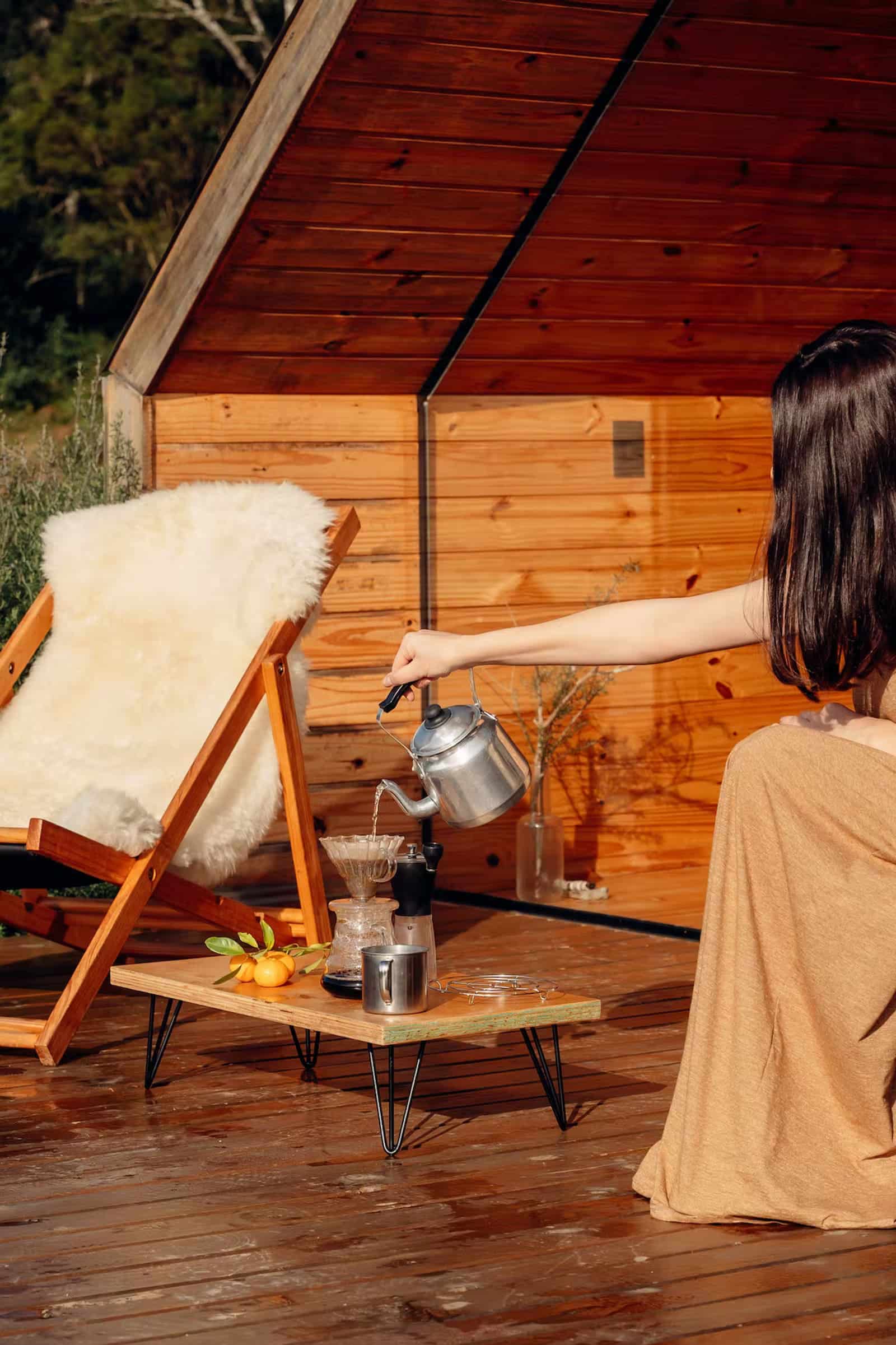 Do chatki przylega łazienka z przeszkloną ścianą od podłogi do sufitu, skierowaną na otaczający krajobraz – pozwala to na prysznic z widokiem na naturę. Całość otwiera się na przestronny drewniany taras z grillem, kominkiem, stołem ogrodowym i balią opalaną drewnem. To miejsce stworzone z myślą o relaksie i odpoczynku, w którym ogień odgrywa kluczową rolę – pojawia się w formie paleniska, pieca, grilla czy gorącej kąpieli pod gołym niebem. Dzięki naturalnym materiałom i otwartej formie budynku, chatka idealnie wpisuje się w ideę życia w zgodzie z naturą.