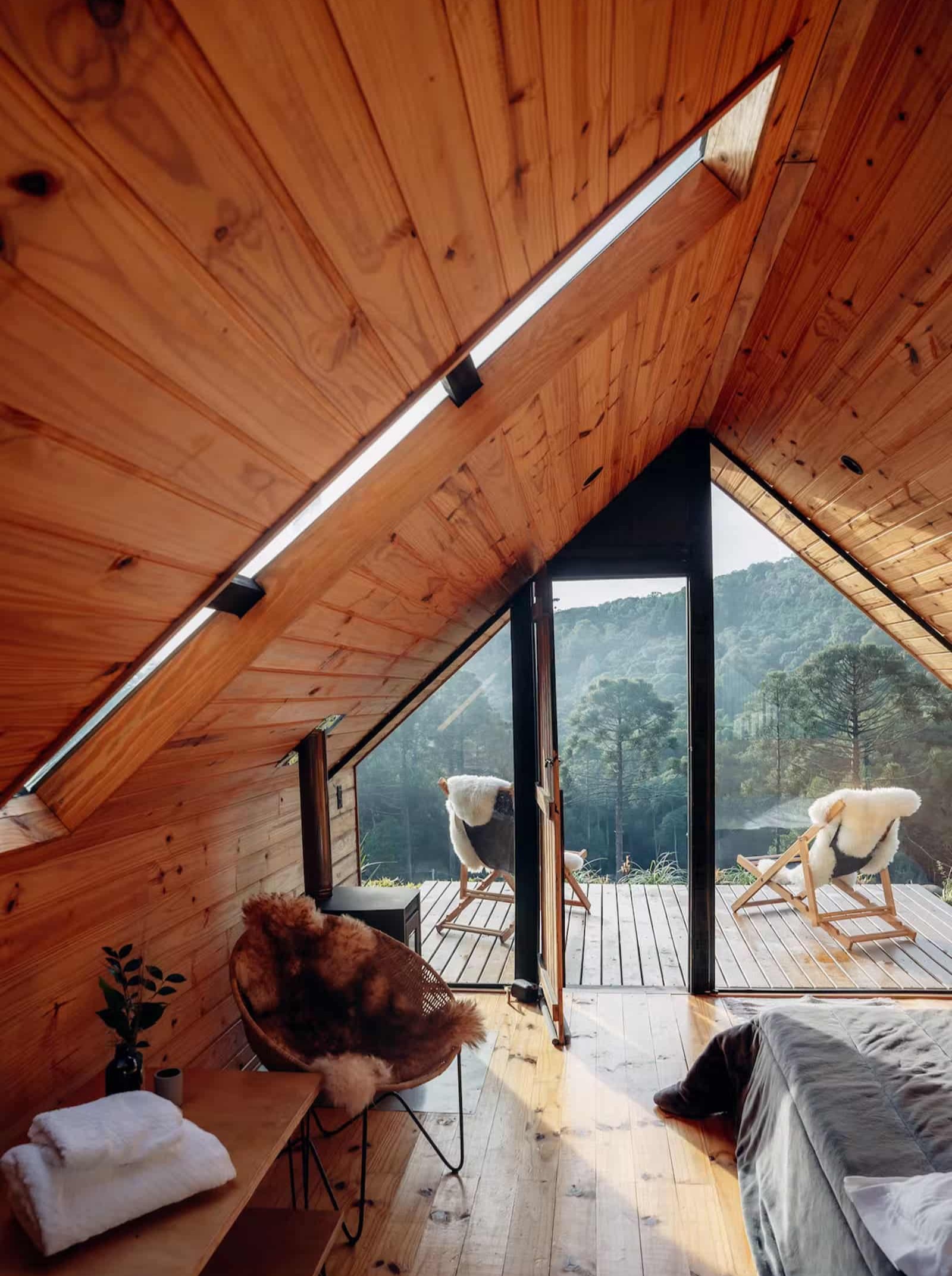 W sercu brazylijskiej wsi, na terenie posiadłości w Flores da Cunha, powstała Cabana Solena – wyjątkowa, minimalistyczna chatka z balii, zaprojektowana jako schronienie blisko natury. Inspirowana stylem nowoczesnej stodoły, została stworzona w odpowiedzi na potrzebę ucieczki od zgiełku i izolacji podczas pandemii. Główna bryła z charakterystycznym dwuspadowym dachem i szklanymi ścianami wtapia się w otoczenie, oferując panoramiczne widoki oraz bezpośredni kontakt z przyrodą. Wnętrze mieści łóżko z widokiem na niebo, piec opalany drewnem, blat kuchenny i kompaktową przestrzeń mieszkalną. Brak zasłon czy rolet sprawia, że zmieniające się warunki atmosferyczne stają się integralną częścią codziennego doświadczenia.