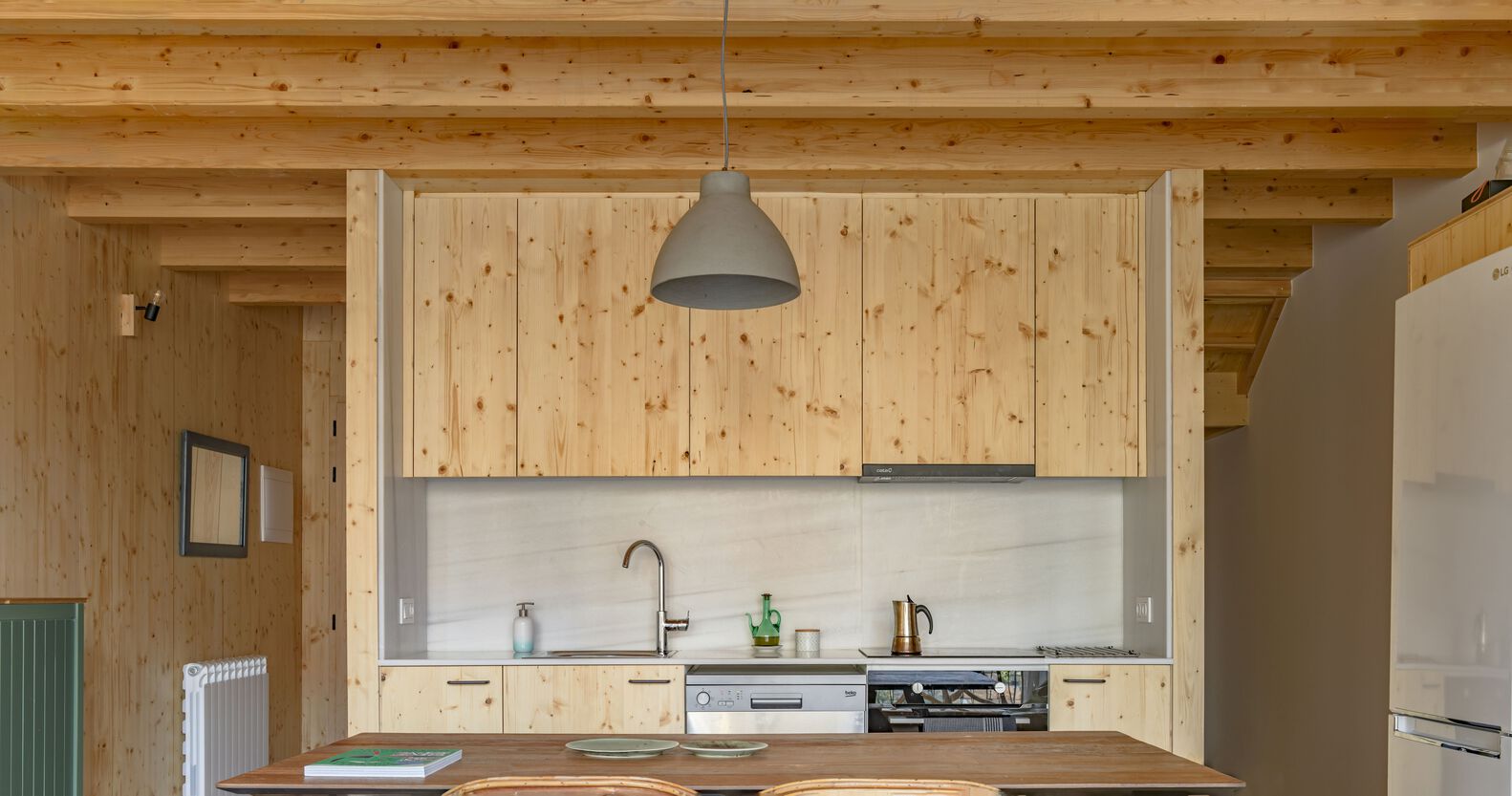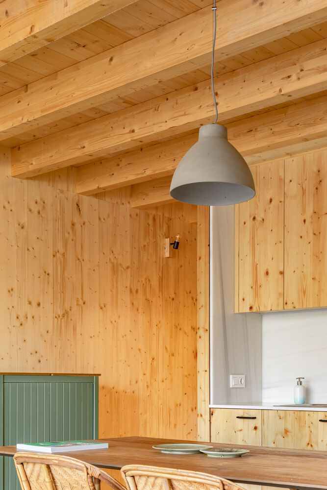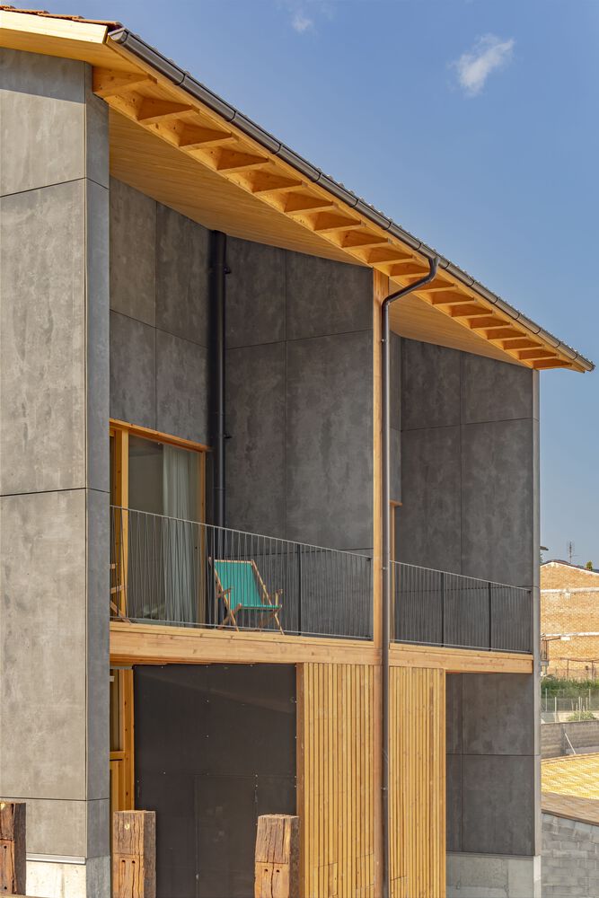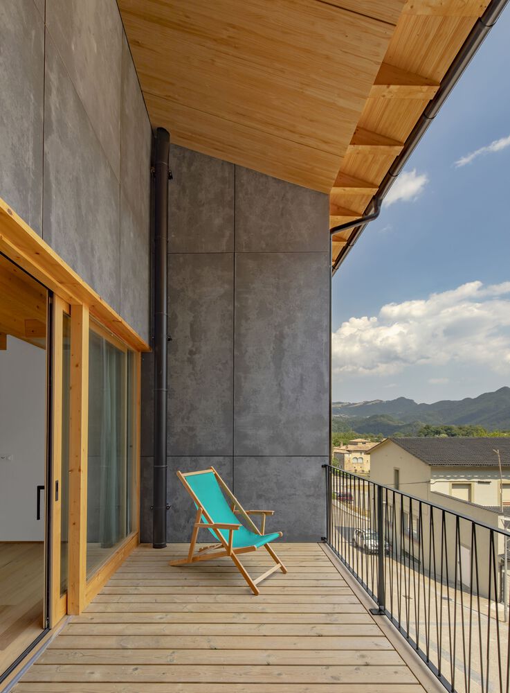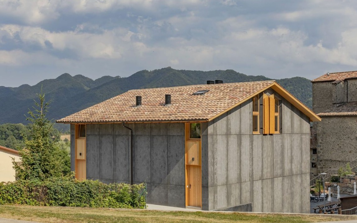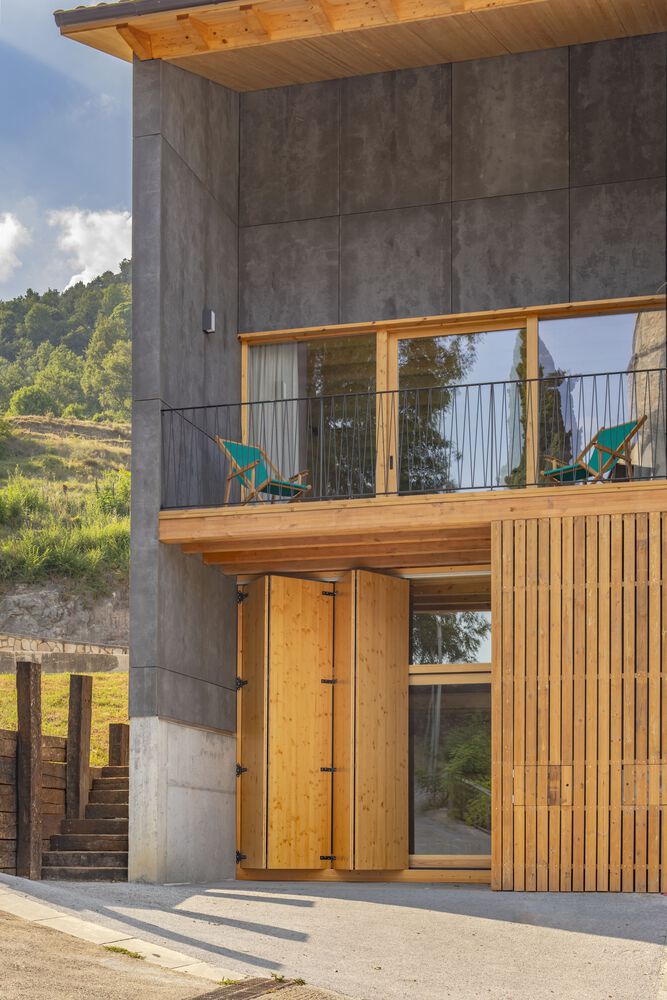 Wnętrza wykończono trójwarstwowymi panelami jodłowymi, zapewniającymi ciepło, trwałość i estetykę. Zastosowano również izolację z włókien drzewnych, która zwiększa efektywność energetyczną i zapewnia naturalny mikroklimat. Elewacja wentylowana została wykonana z płyt kompozytowych drewniano-cementowych, co gwarantuje odporność na warunki atmosferyczne i długowieczność. Inspiracją doboru materiałów była materialność krajobrazu regionu Bisaura. Drewno, płytki i naturalne tekstury przywołują lokalne tradycje budowlane, a forma budynku – silna, niemal abstrakcyjna – przywodzi na myśl XIX-wieczne wiejskie domy Vidrà.