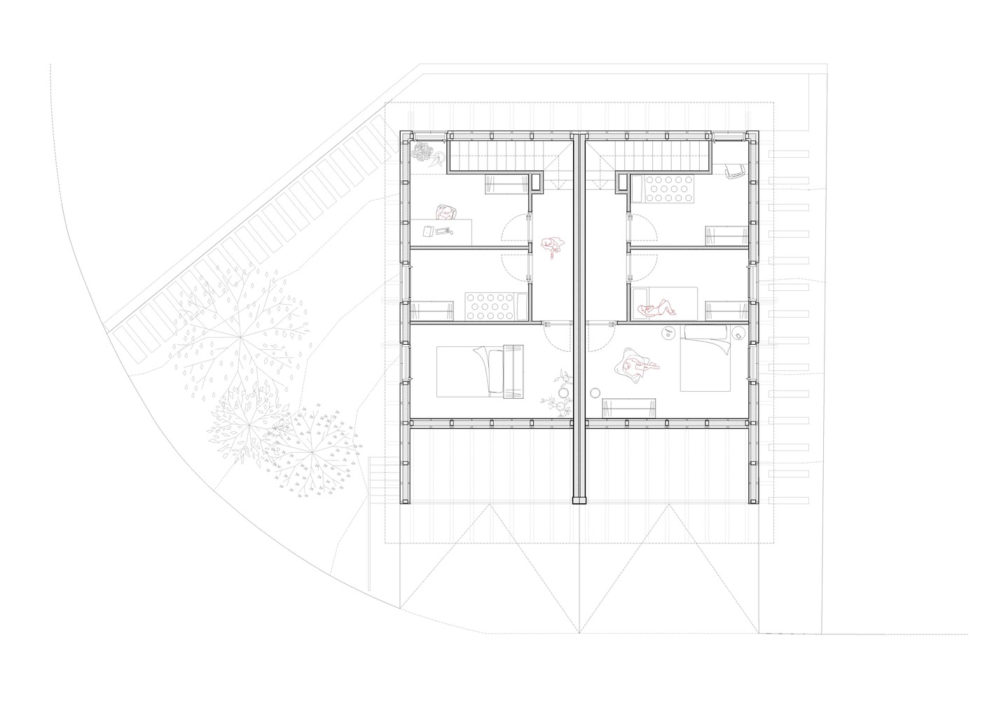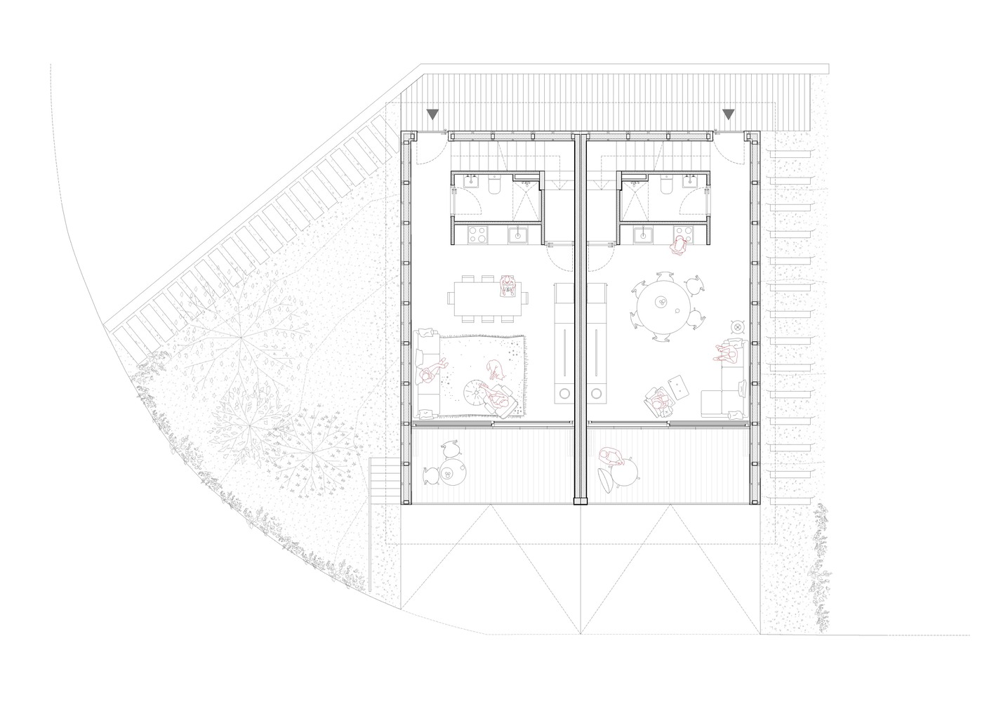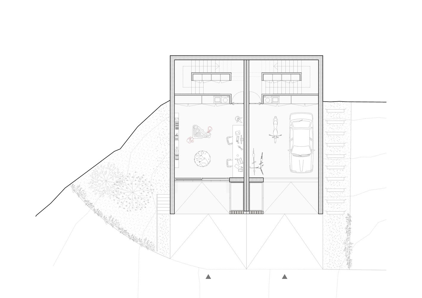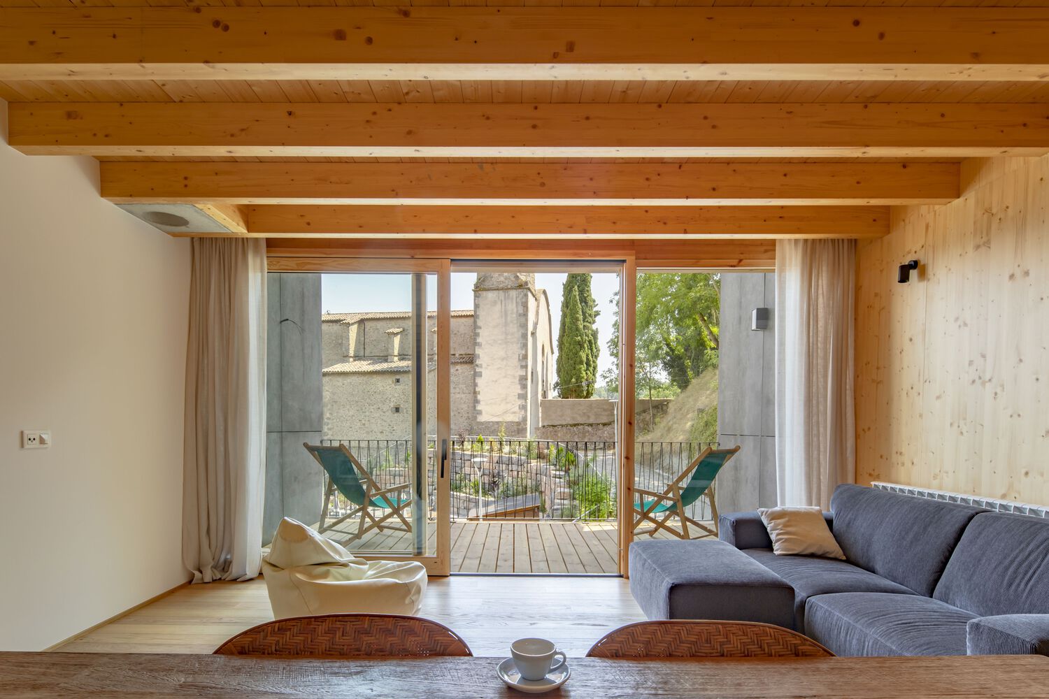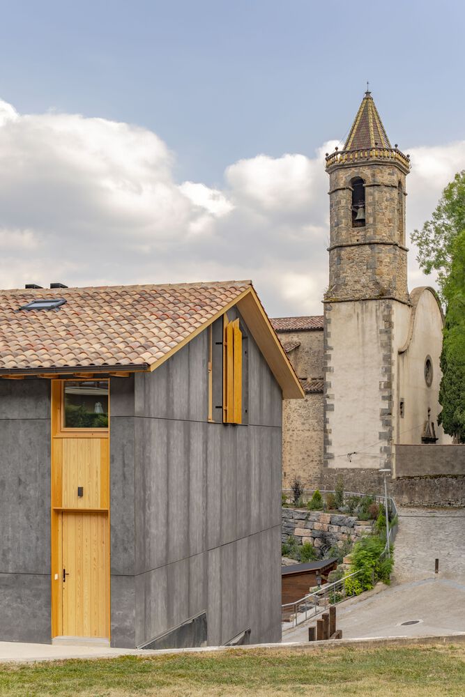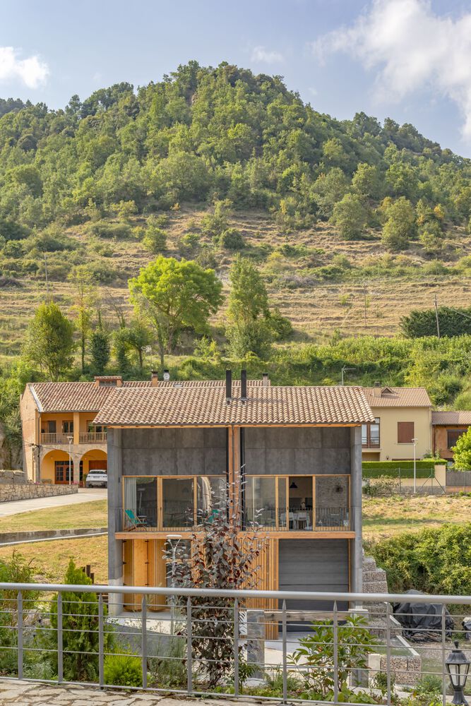 Dos casas en Vidrà to przykład, jak nowoczesna architektura może odpowiadać na wyzwania topograficzne i jednocześnie wpisywać się w naturalny krajobraz. Zlokalizowana na działce o wymagającej rzeźbie terenu – z ponad 4-metrową różnicą poziomów na osi północ-południe – inwestycja korzysta z doskonałego nasłonecznienia przez cały dzień oraz uprzywilejowanych widoków na Góry Bisaura, pobliskie miasto i ikoniczny kościół z dzwonnicą.