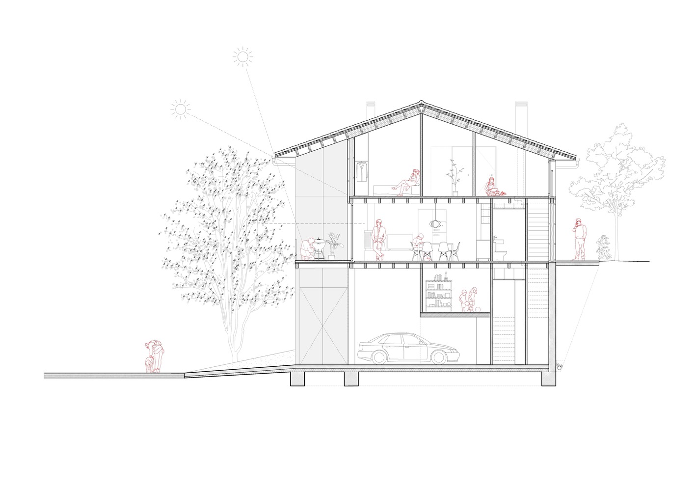 Główne cele projektu to minimalny wpływ na środowisko, wysoka efektywność energetyczna oraz oferowanie wysokiej jakości architektury w konkurencyjnej cenie. Architekci osiągnęli to dzięki strategicznemu podejściu do materiałów, technologii i formy. Pierwszym kluczowym elementem był betonowy cokół, który niweluje znaczne różnice wysokości i stabilizuje budynek na trudnej działce. Pozostała część konstrukcji to sucha zabudowa z drewna klejonego warstwowo, co pozwala na szybki montaż, mniejszy ślad węglowy i wysoką precyzję wykonania.
