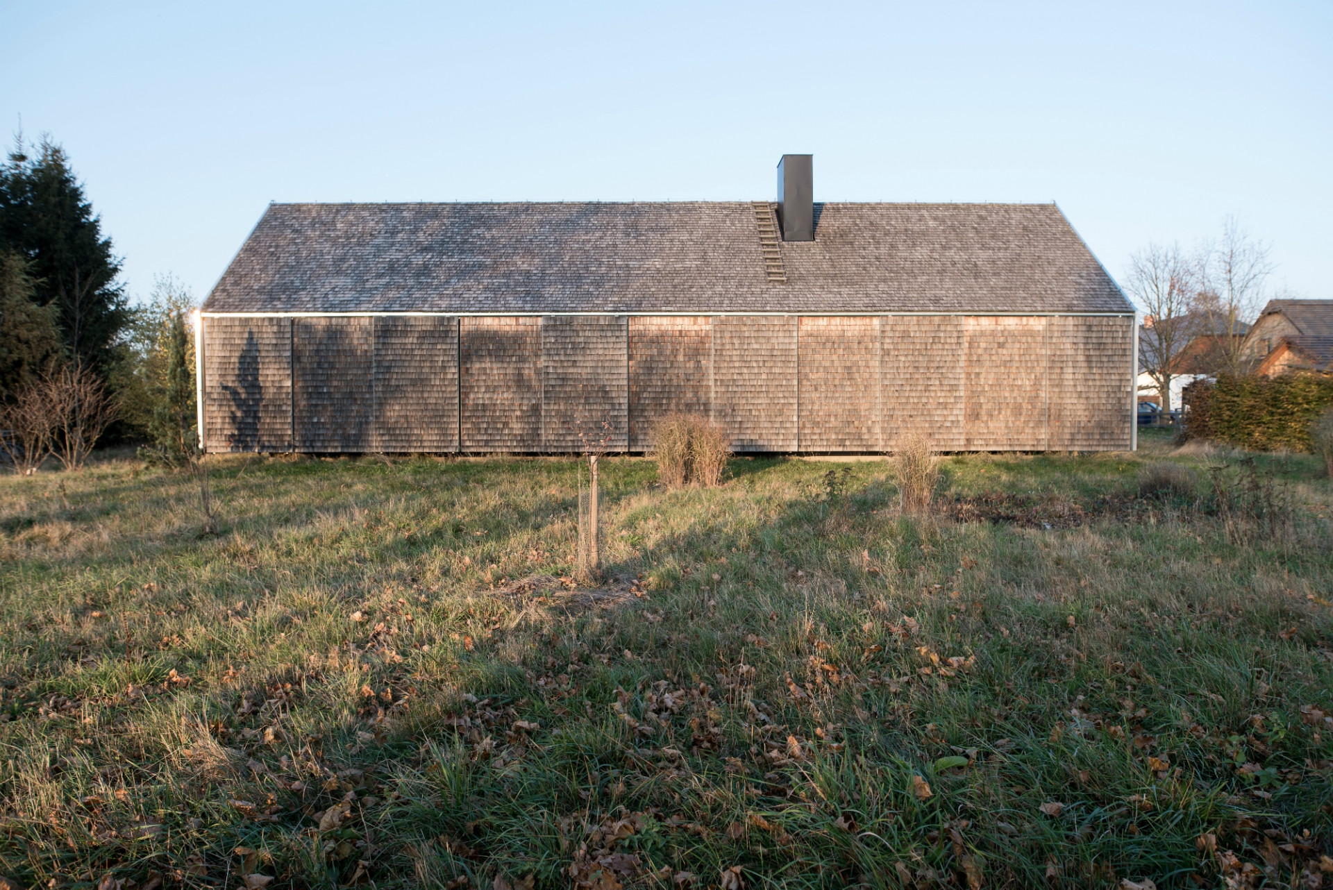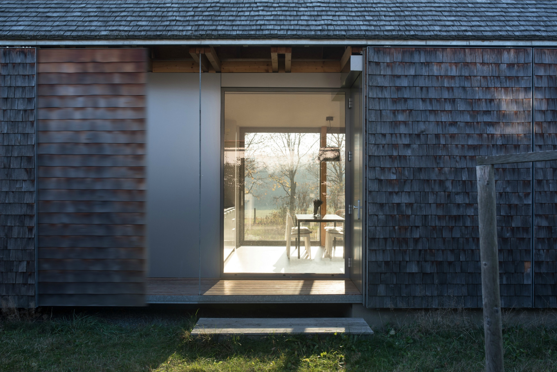 Elewacje pokryto łupanym gontem drewnianym, który odwołuje się bezpośrednio do lokalnych technik rzemieślniczych. Z czasem drewno naturalnie zmienia kolor, jeszcze silniej stapiając budynek z otaczającą go przyrodą. Dom nie kontrastuje z krajobrazem, lecz staje się jego integralną częścią.