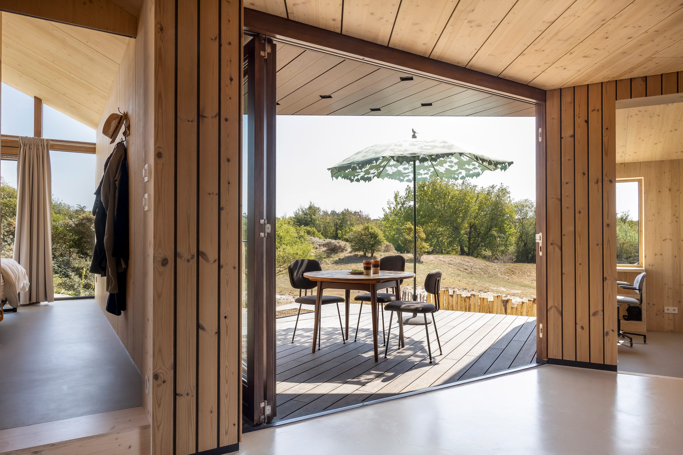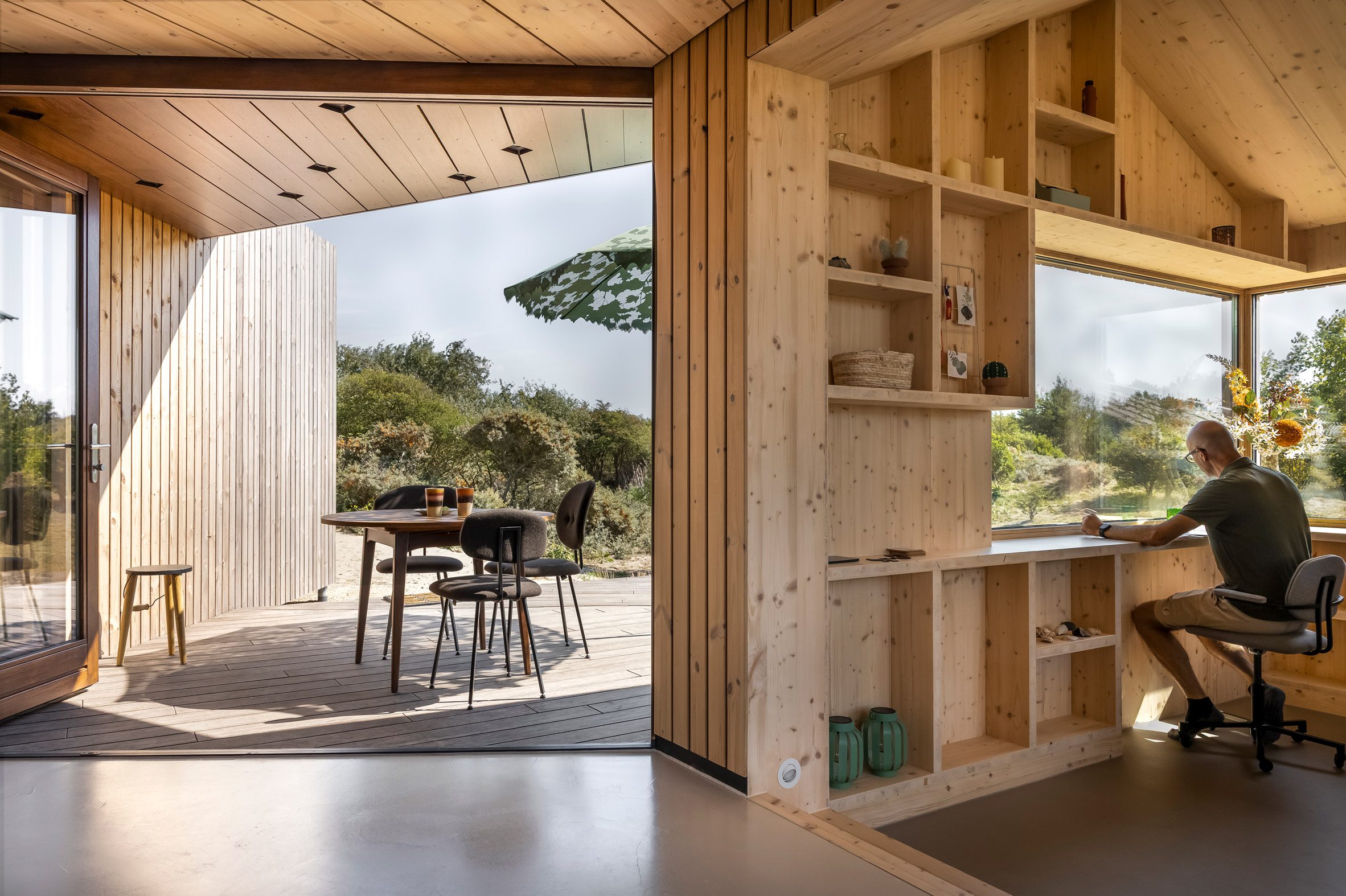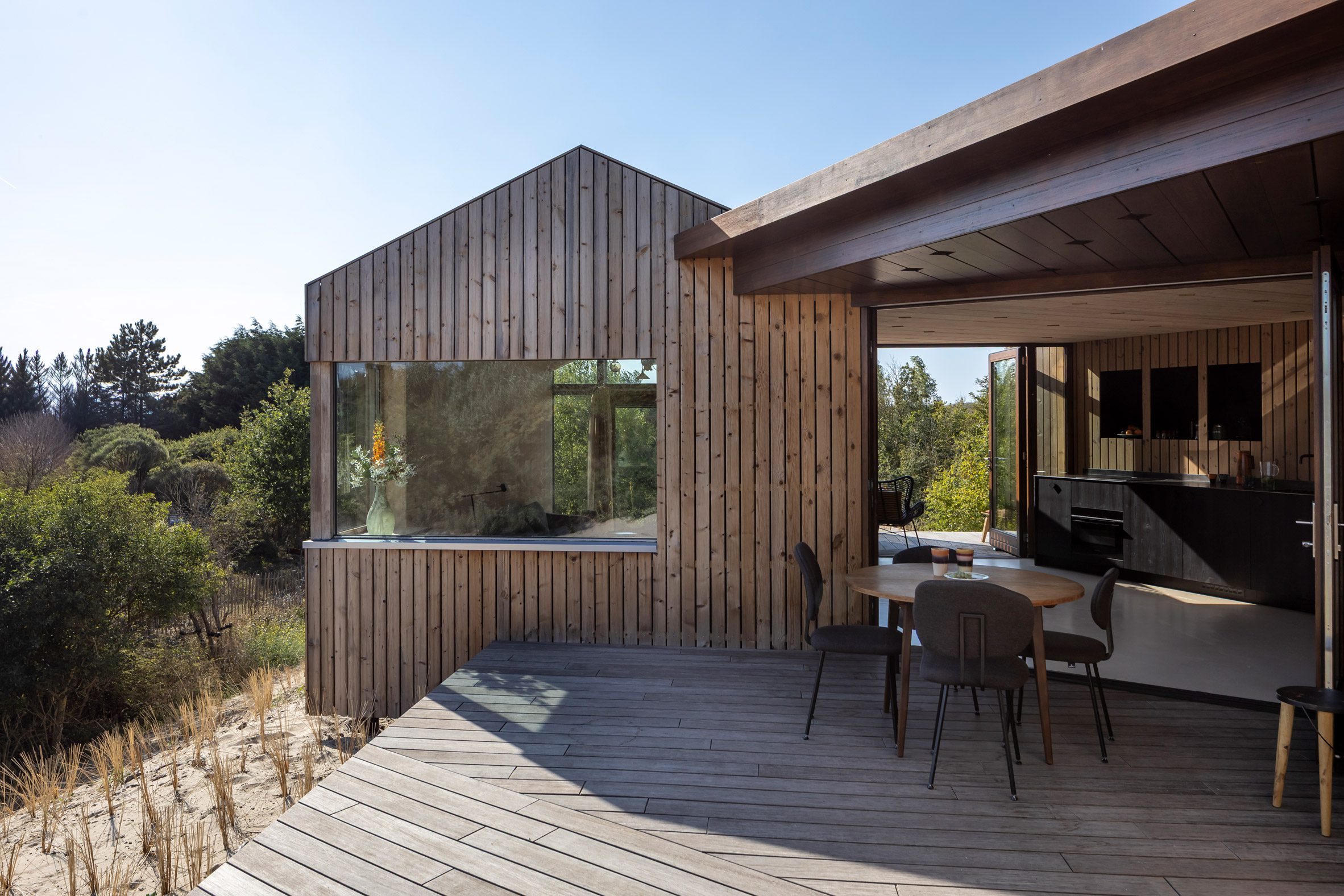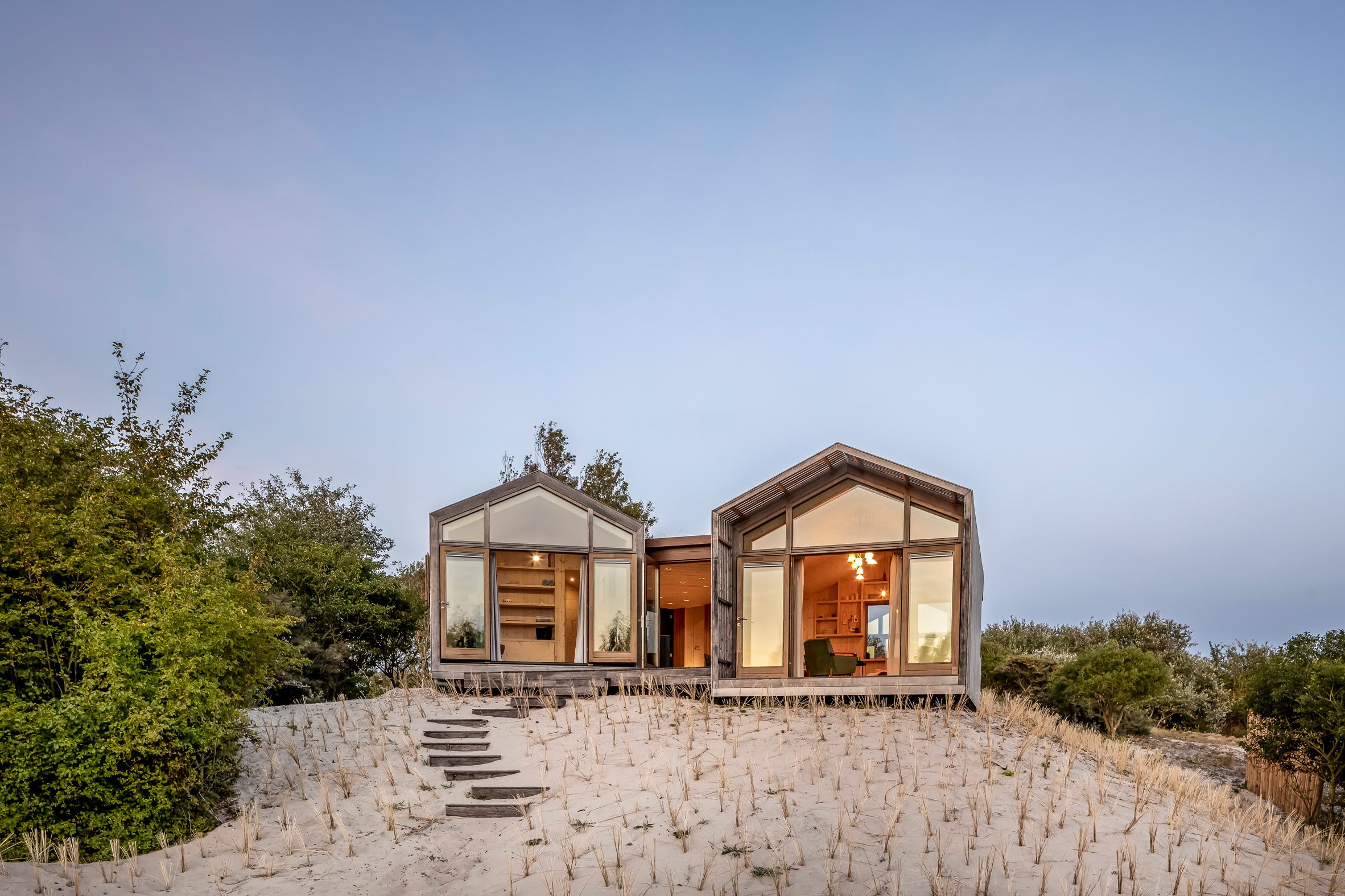 Wnętrze domu zostało zaprojektowane jako ciepła, drewniana przestrzeń kontrastująca z surowym krajobrazem na zewnątrz. Naturalne materiały i jasna kolorystyka tworzą przytulne wnętrze, które jednocześnie pozostaje w dialogu z otoczeniem. Otwory okienne zostały rozmieszczone tak, aby kadrować widoki na wydmy i wpuszczać światło, jednocześnie zapewniając prywatność.