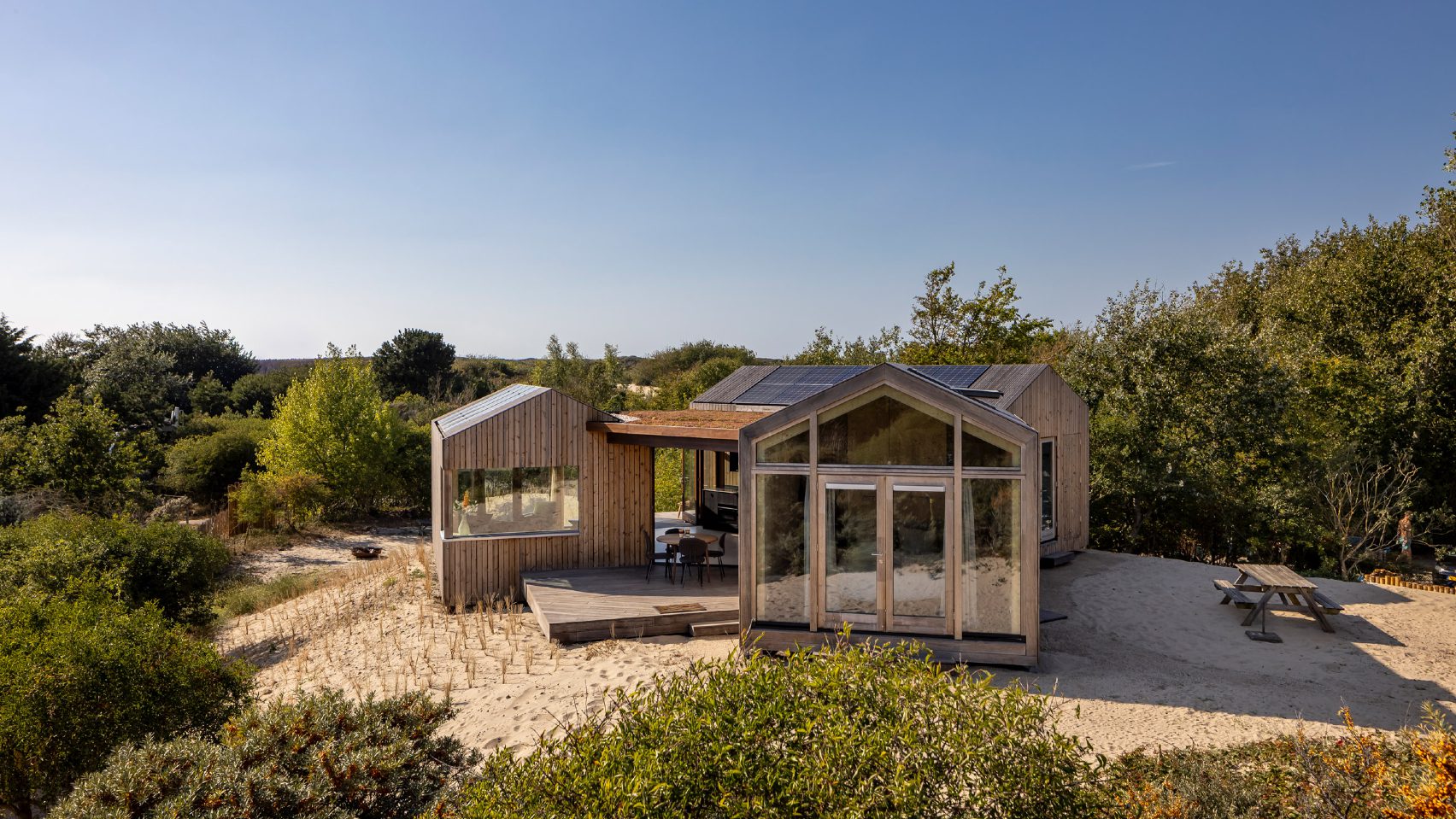 Bryła domu nawiązuje do archetypu stodoły, jednak została w dużej mierze ukryta w terenie. Budynek częściowo zagłębiono w wydmach, dzięki czemu staje się niemal niewidoczny z dalszej perspektywy i nie zakłóca naturalnego krajobrazu. Taki zabieg nie tylko poprawia integrację z otoczeniem, ale także chroni dom przed silnym wiatrem i trudnymi warunkami atmosferycznymi charakterystycznymi dla nadmorskich terenów.