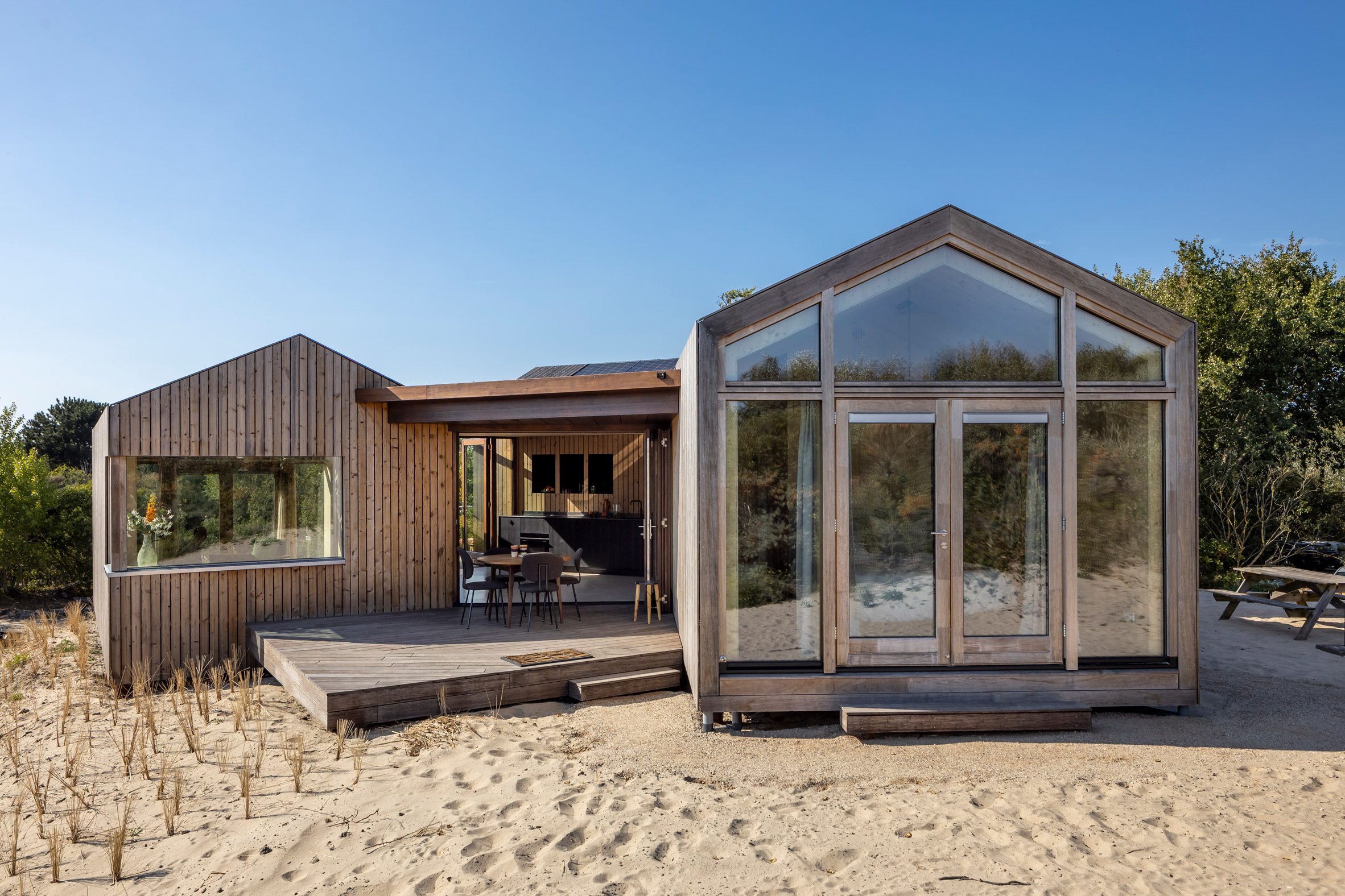 Dune House to dom letniskowy zaprojektowany przez holenderskie studio Woonpioniers, zlokalizowany w krajobrazie wydm na wyspie Goeree-Overflakkee. Projekt powstał jako odpowiedź na wyjątkowo wymagający kontekst – dynamiczne środowisko nadmorskie, w którym wiatr, piasek i zmieniający się krajobraz stanowią integralną część miejsca. Architektura została tu podporządkowana naturze, zamiast próbować ją kontrolować.