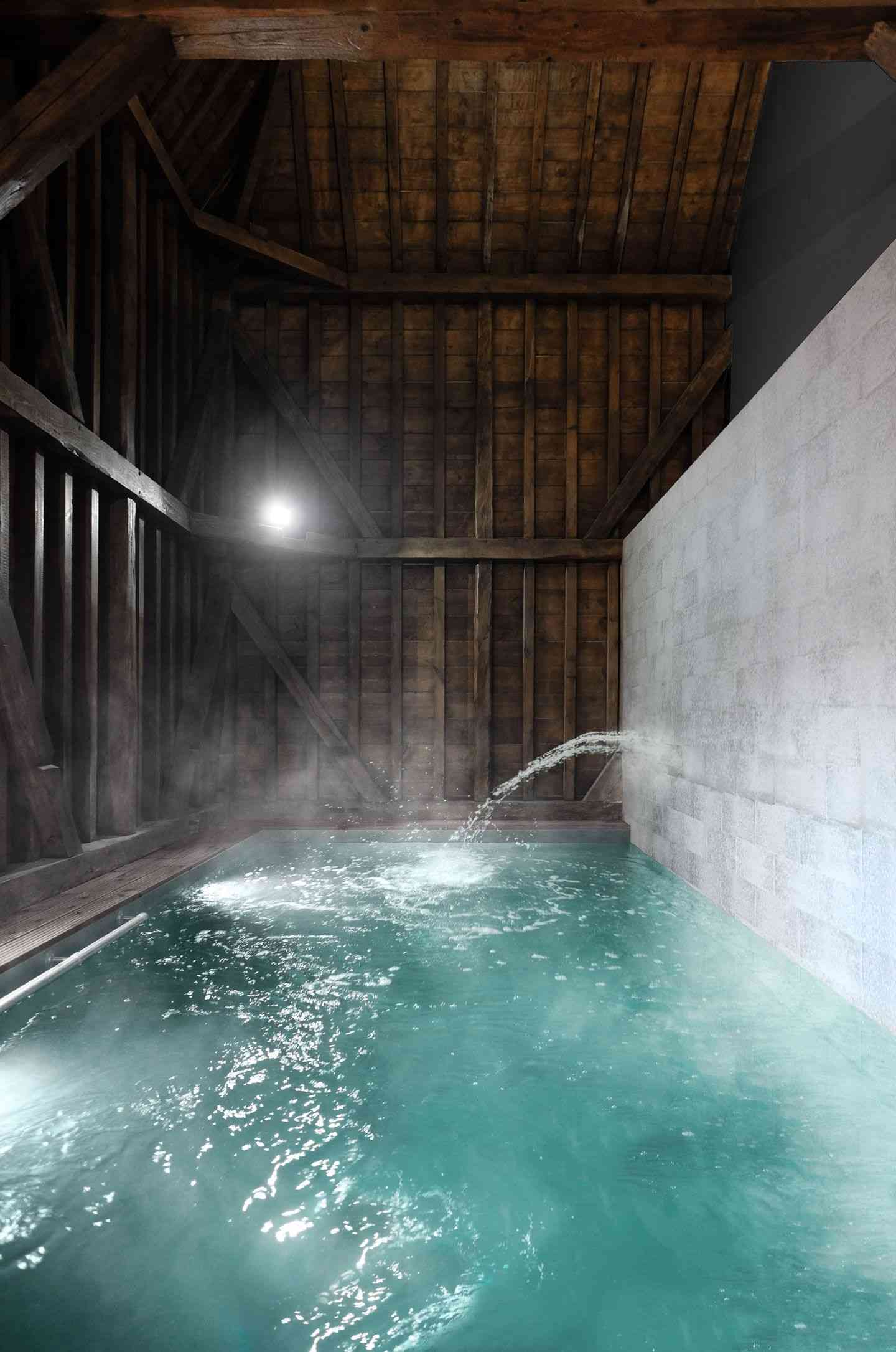 Wnętrze o powierzchni 217 m² pozostawia odsłoniętą oryginalną drewnianą konstrukcję, zestawioną z betonem, płytkami oraz prostymi, surowymi meblami. Po obu stronach budynku zaprojektowano przestrzenie o podwójnej wysokości, w których znajdują się salon oraz kryty basen. W centralnej części parteru umieszczono sypialnię główną i pomieszczenie użytkowe, natomiast na strychu – cztery dodatkowe sypialnie, zlokalizowane tam, gdzie dawniej składowano siano. Takie rozwiązanie pozwoliło ograniczyć ściany działowe i stworzyć otwartą, jasną strefę dzienną, w pełni zintegrowaną z otaczającą przyrodą.