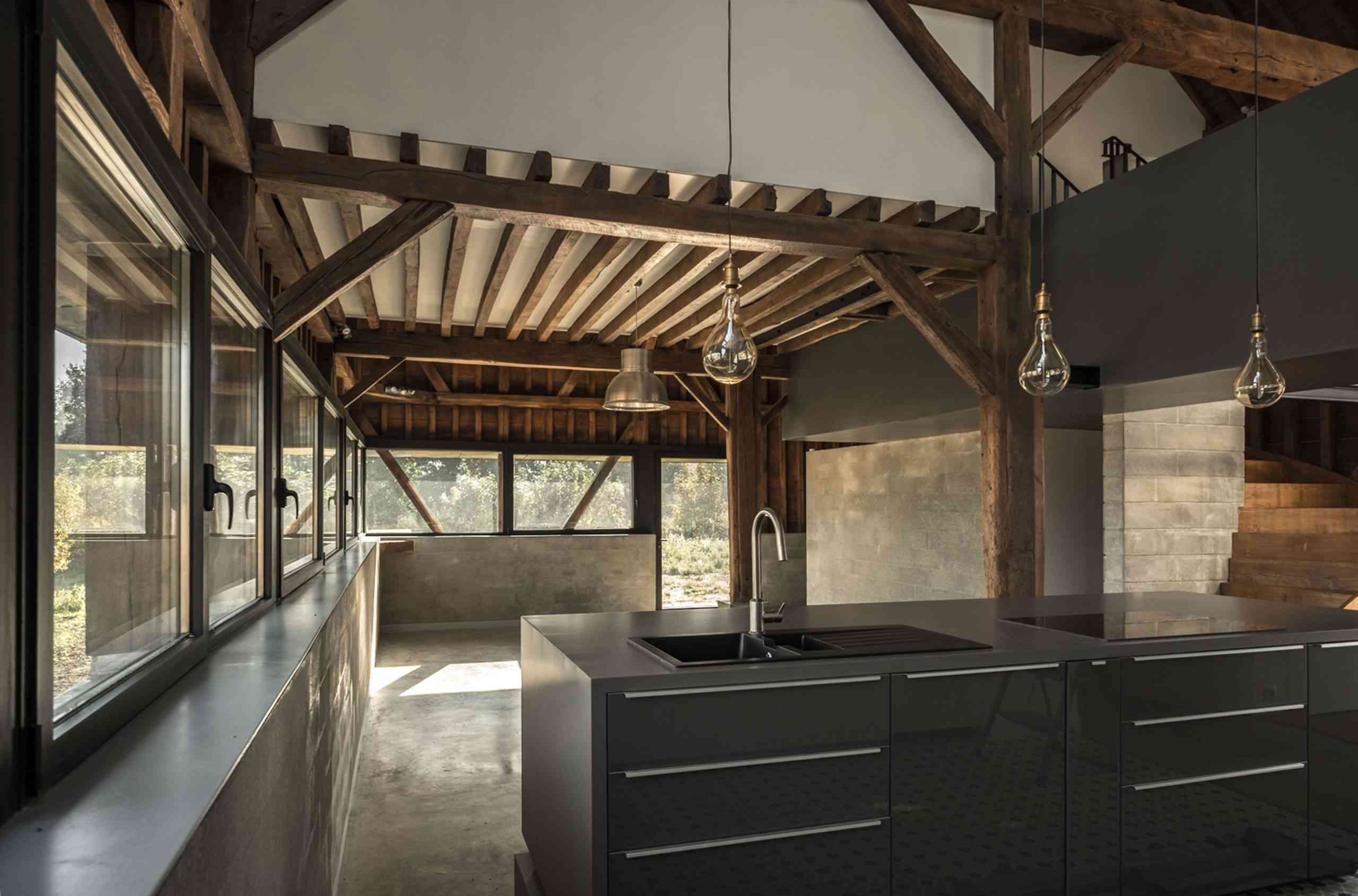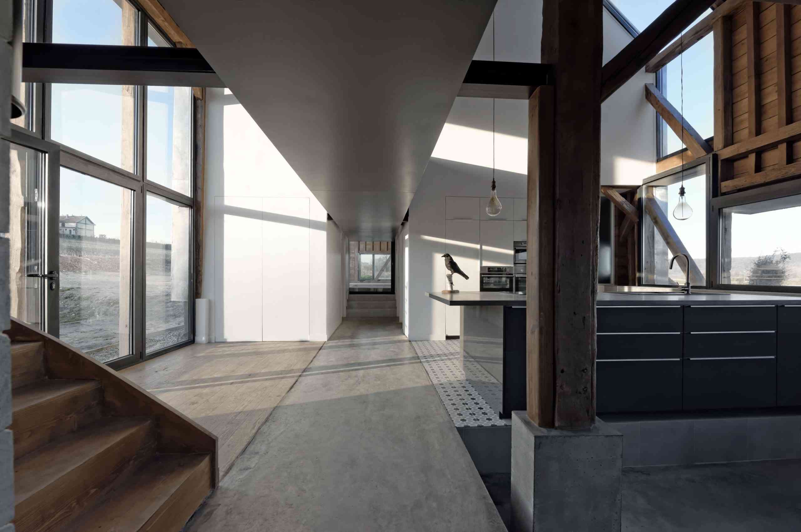 Cynkowa elewacja została zaprojektowana tak, by zachować monolityczny charakter dawnego budynku gospodarczego – na piętrze znalazło się jedynie kilka okien, a elewacja nie dochodzi do fundamentów, co pozwoliło wprowadzić wąskie pasy przeszkleń wokół parteru. Okna te zmieniają kierunek, doświetlając centralną klatkę schodową, a oryginalna drewniana konstrukcja stodoły przecina linie przeszkleń, kadrując widoki na krajobraz. Drzwi i okna cofnięto wizualnie, by ograniczyć typowe cechy domu mieszkalnego i stworzyć bryłę bliższą naturze – to podejście doskonale wpisuje się w ideę, jaką dziś reprezentuje nowoczesna stodoła.