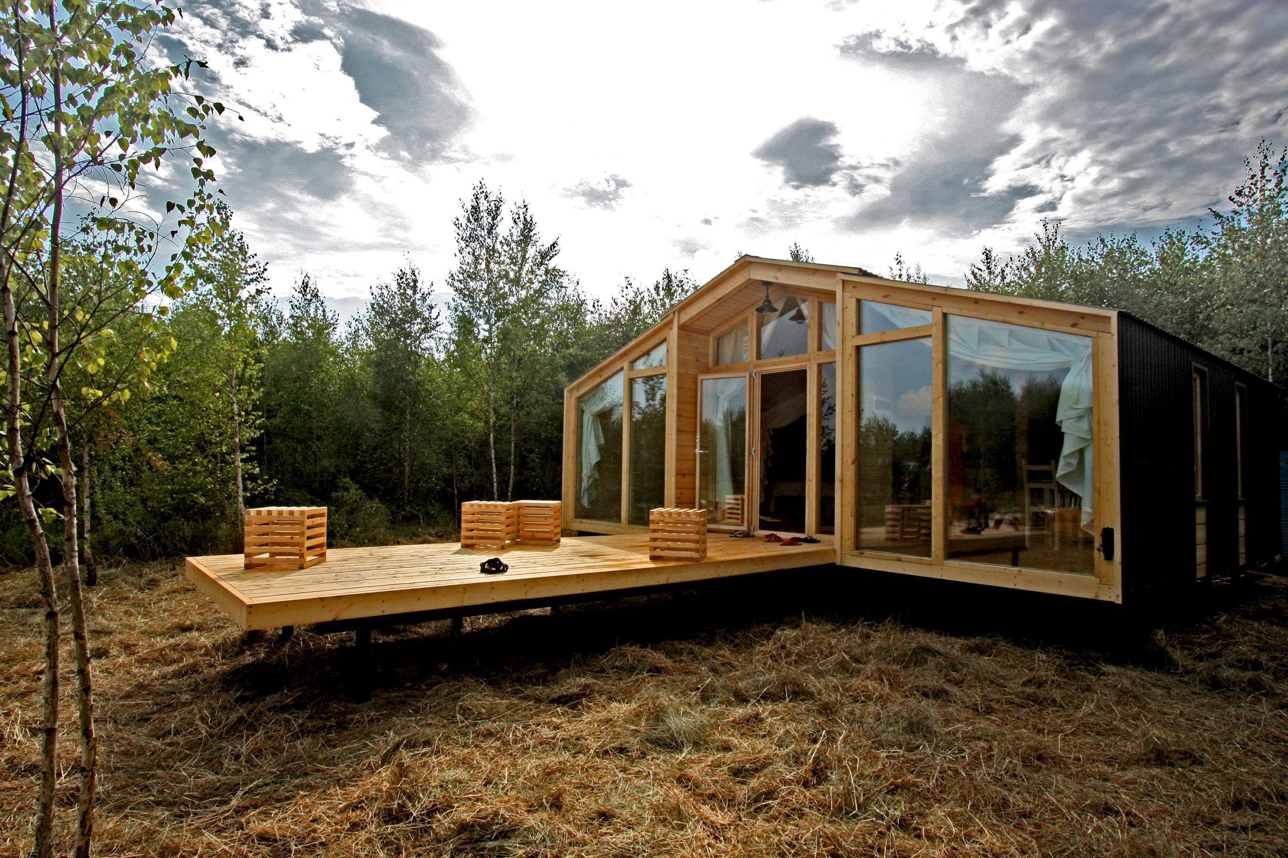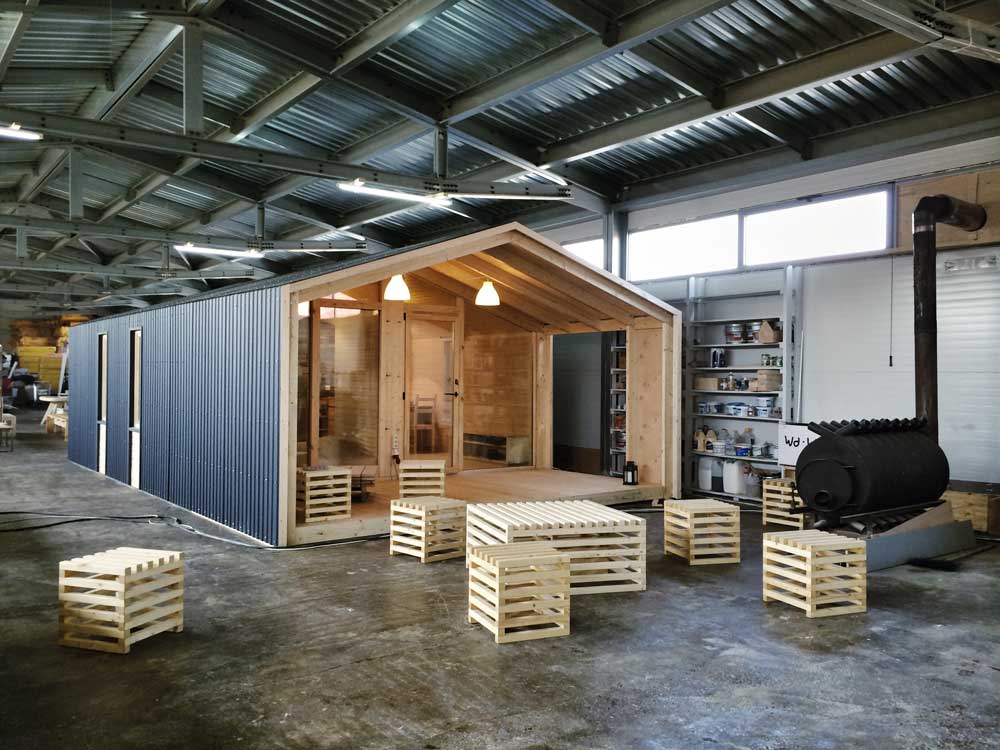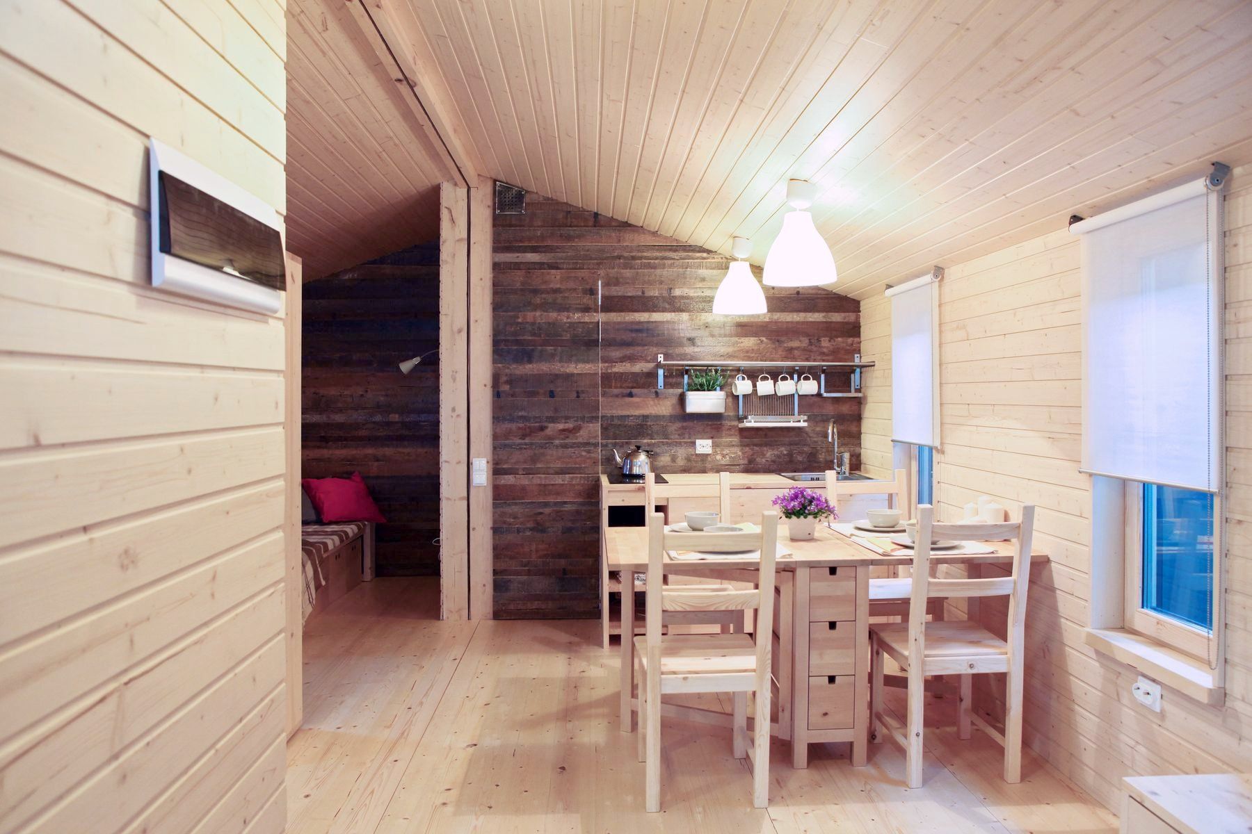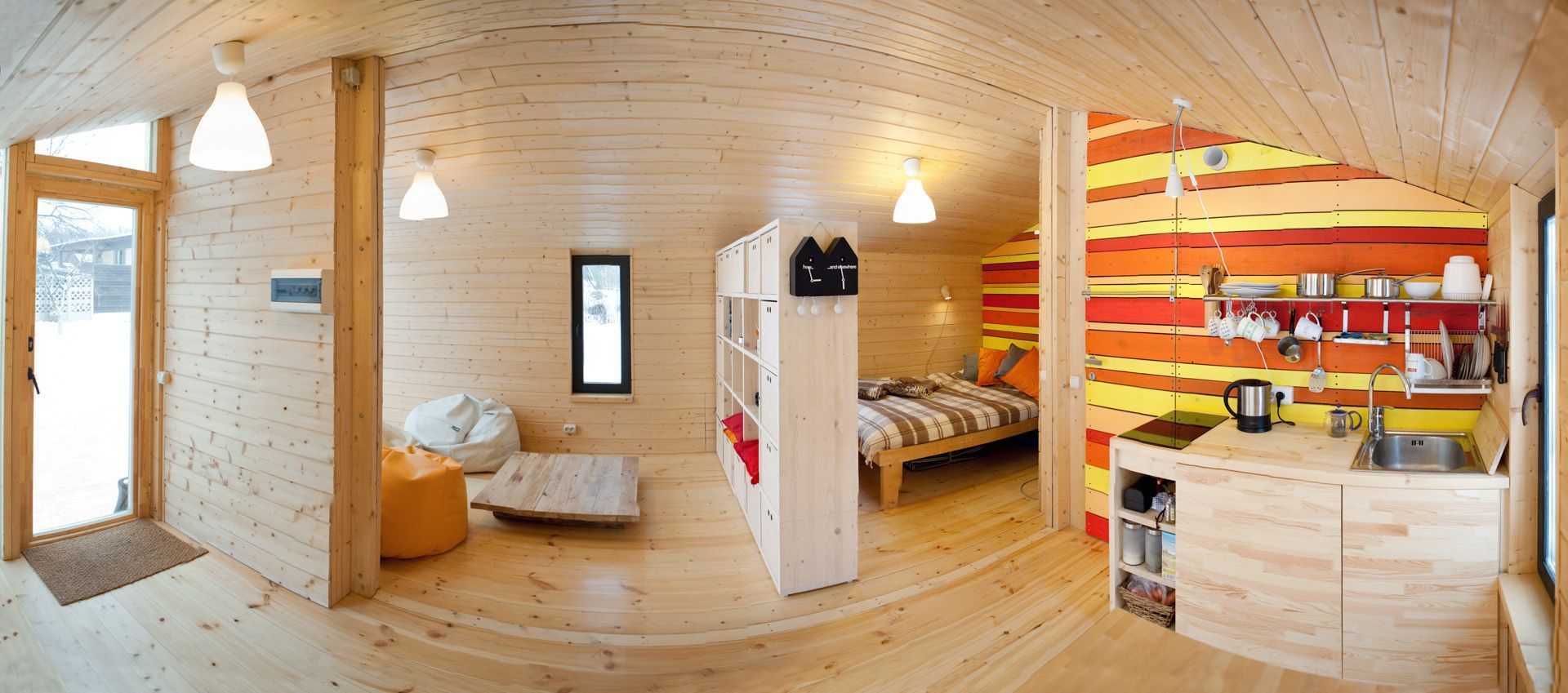 Wnętrze domu zostało niemal w całości wykończone jasnym drewnem, z którego wykonano również zabudowy i meble, co tworzy spójną, ciepłą atmosferę. Układ funkcjonalny obejmuje przestronny salon w przedniej części, kuchnię z jadalnią, przytulny kącik wypoczynkowy, łazienkę oraz sypialnię umieszczoną z tyłu budynku. Drewniany schowek pełni rolę przegrody, subtelnie oddzielając strefę prywatną od dziennej. Miejsce do spania można dodatkowo odseparować zasłoną. DublDom dostępny jest w dwóch wariantach wielkości i często bywa porównywany do idei nowoczesna stodoła – prostej bryły, prefabrykowanej technologii i funkcjonalnego, drewnianego wnętrza.