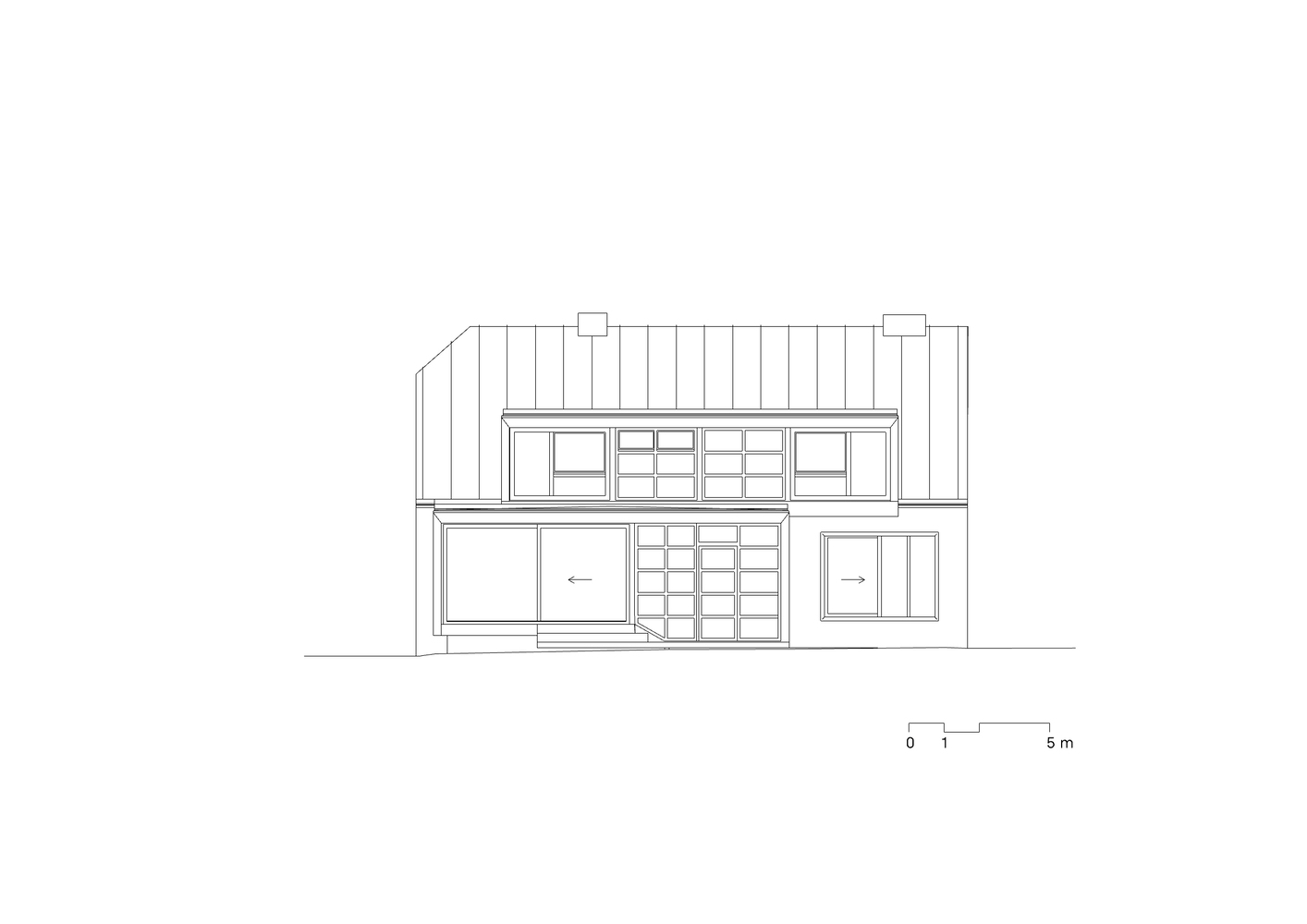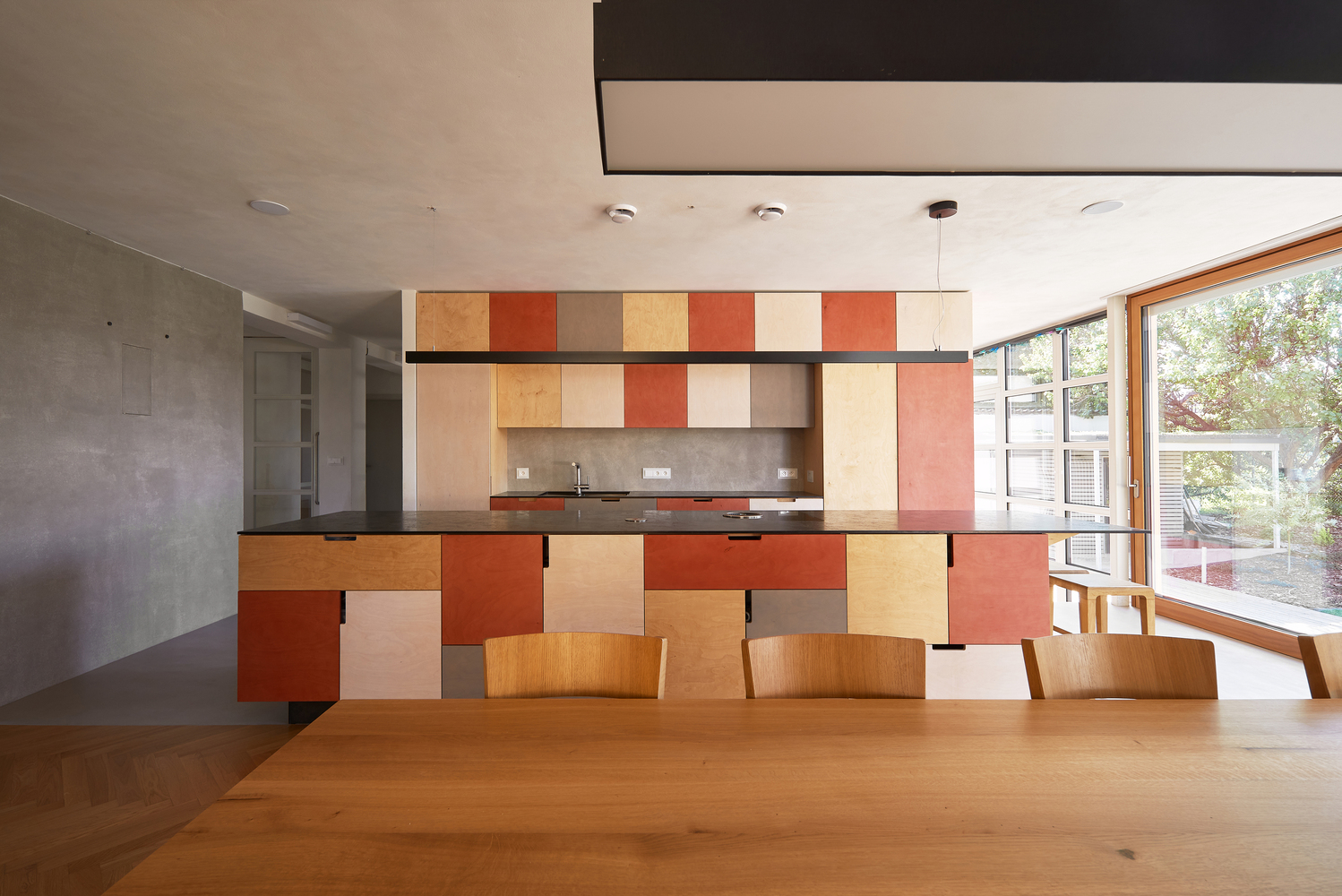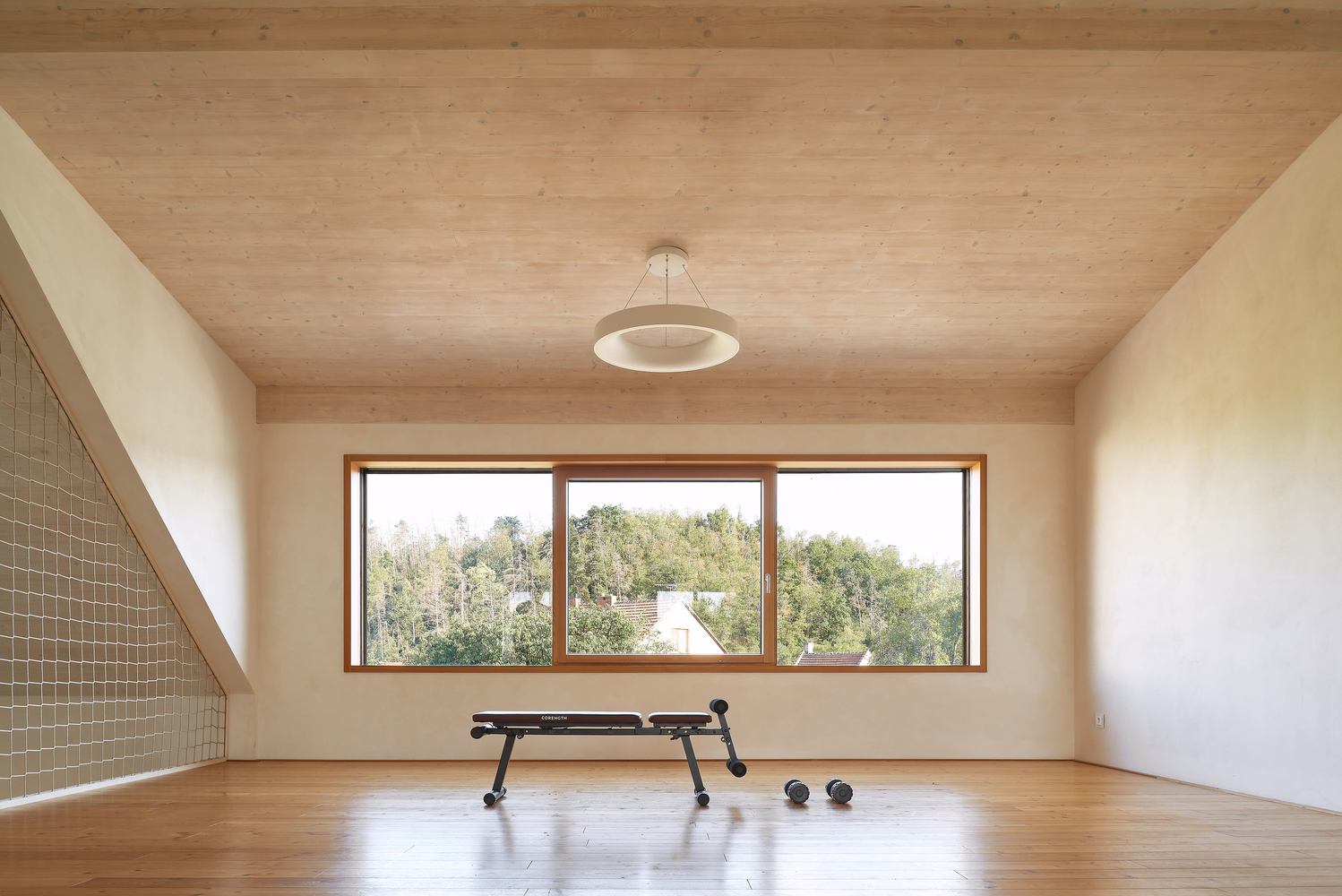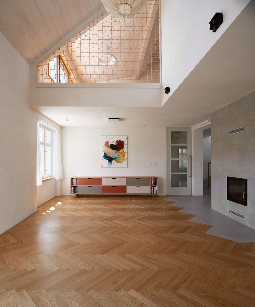 Dom musiał zostać radykalnie przekształcony, zarówno pod względem przestrzennym, jak i funkcjonalnym. Parter otworzono, rezygnując z labiryntu pomieszczeń na rzecz dużej przestrzeni wspólnej z centralnie umieszczonym kominkiem. Kluczowym elementem była wysokość przestrzeni – sufit nad częścią mieszkalną został podniesiony, a część wypoczynkowa została połączona z pokojem zabaw na piętrze, co wzmocniło poczucie wspólnoty rodziny. Na pierwszym piętrze wokół pokoju zabaw rozmieszczono pokoje dziecięce, co pozwoliło na efektywne zorganizowanie przestrzeni.